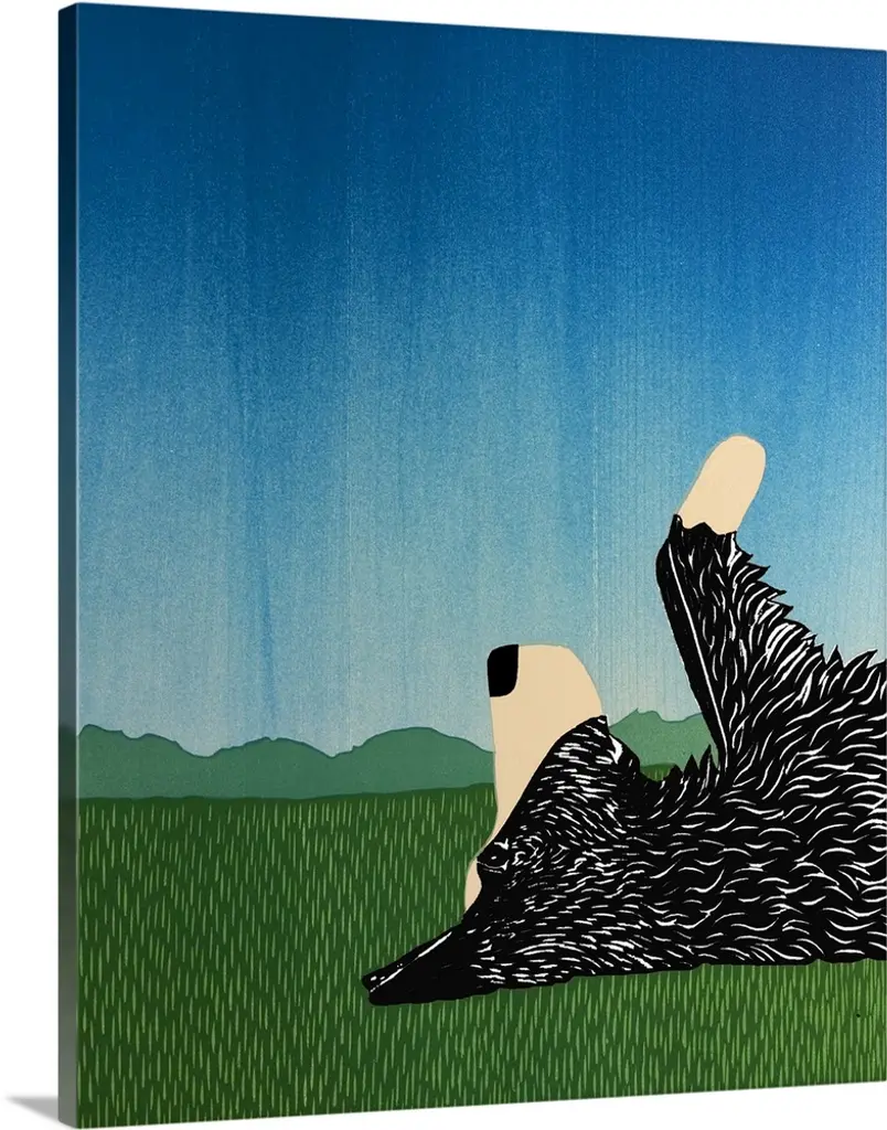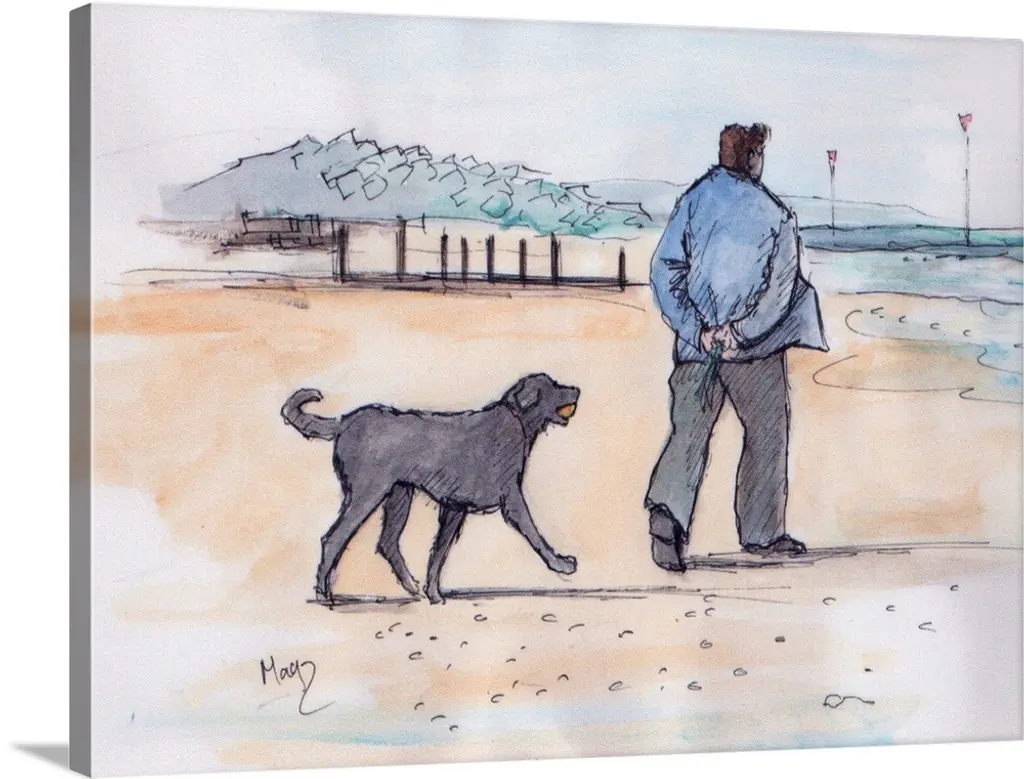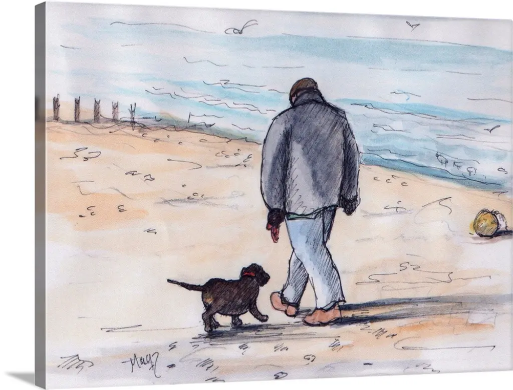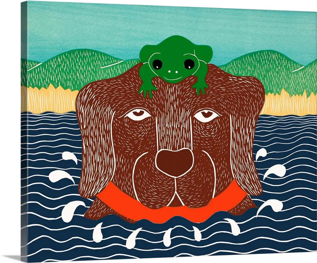 Watercolor painting of a yellow lab on top of a canoe next to the lake.