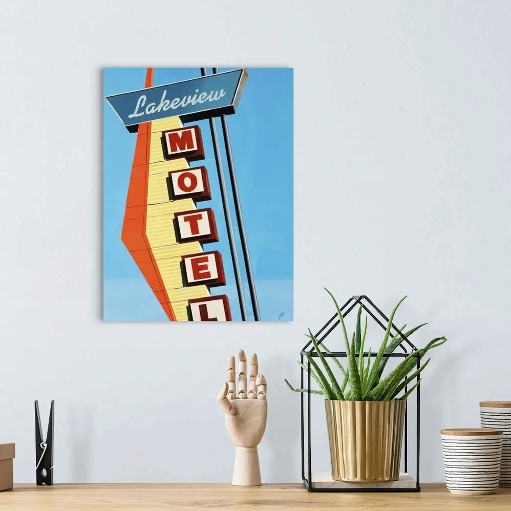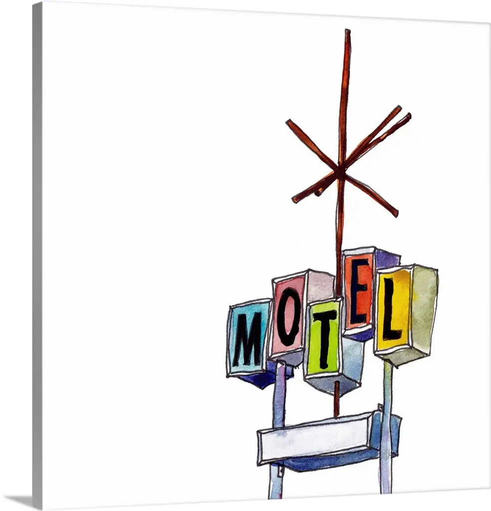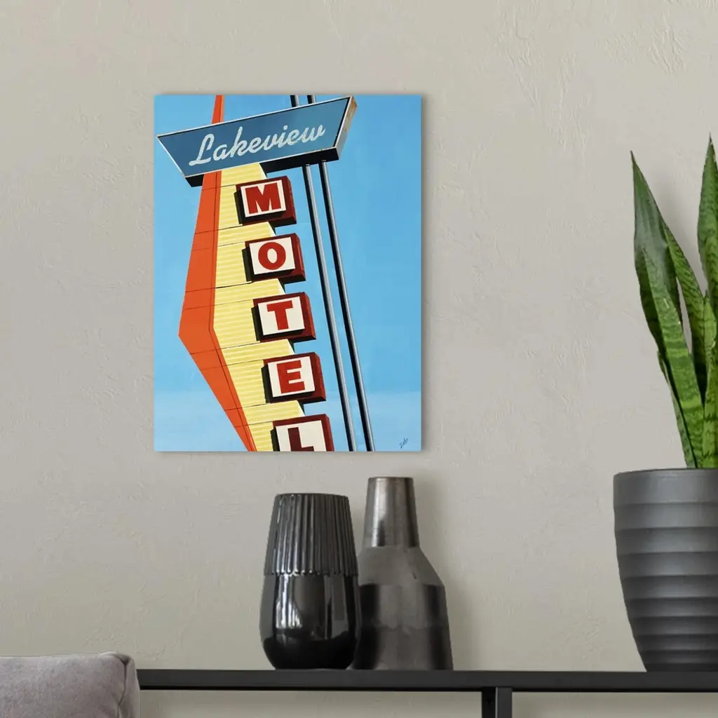 Painting of a vintage motel sign with a diamond shaped decorative element, against a bright blue cloudless sky.