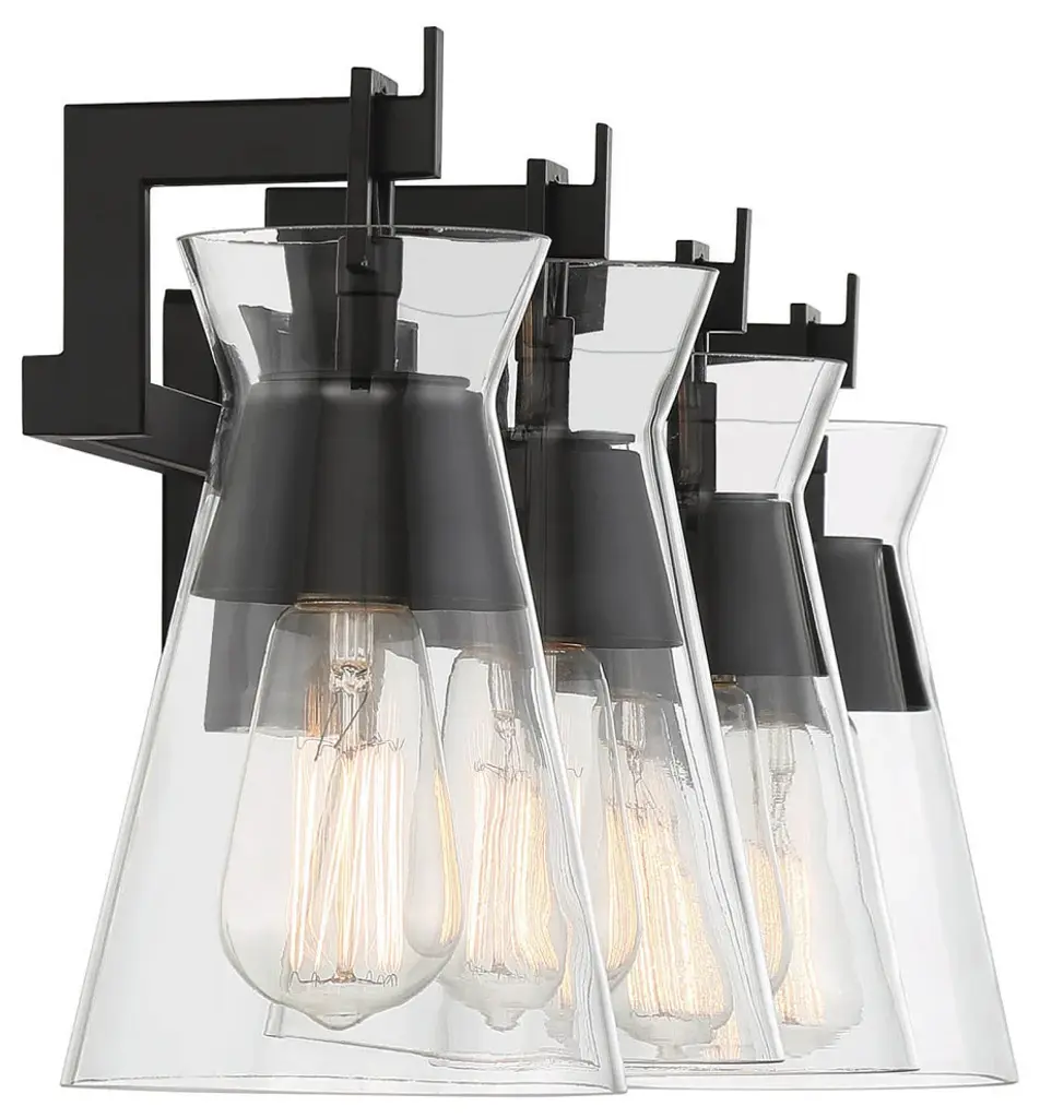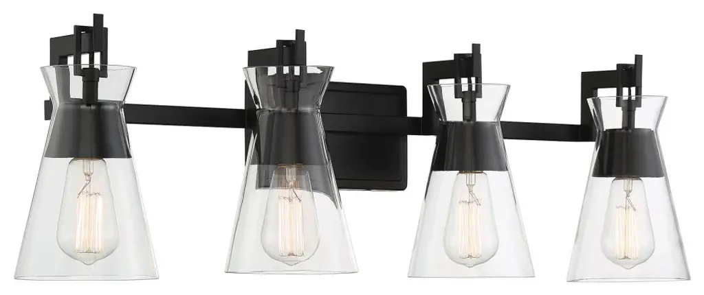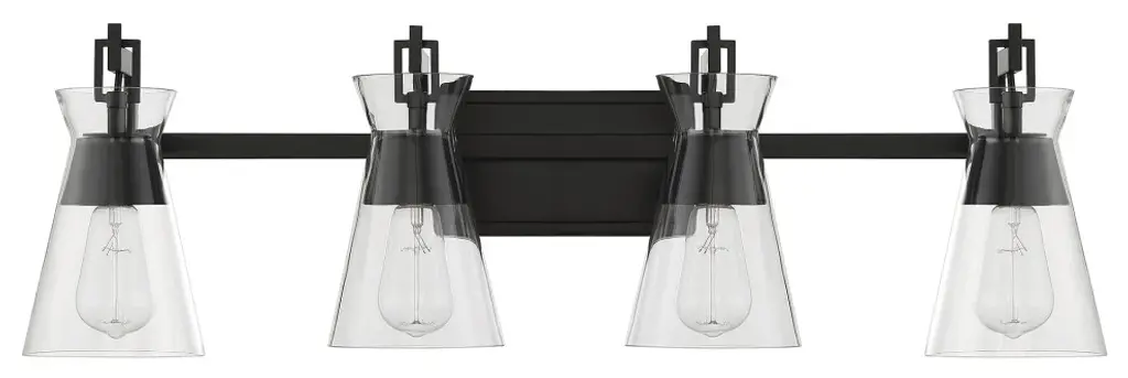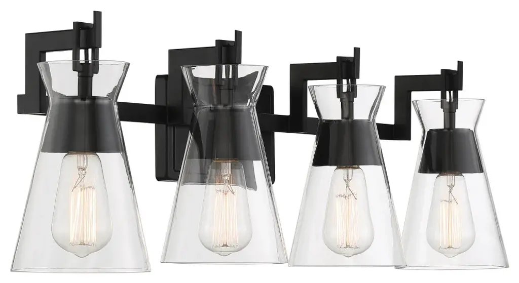 Conical shades of clear glass recall Italian midcentury modern lighting designs in the stylish Lakewood 4-light bath vanity light from Savoy House. The glass is suspended from angular reimaginings of shepherd''s hooks and the fixture is finished in bold matte black. Lakewood is 9.5" in height, 32" in width and extends 6.5" from the wall. It uses four standard size bulbs with a max of 60 watts per bulb. Damp area rated. This light requires 4 , 60 Watt Bulbs (Not Included) UL Certified.