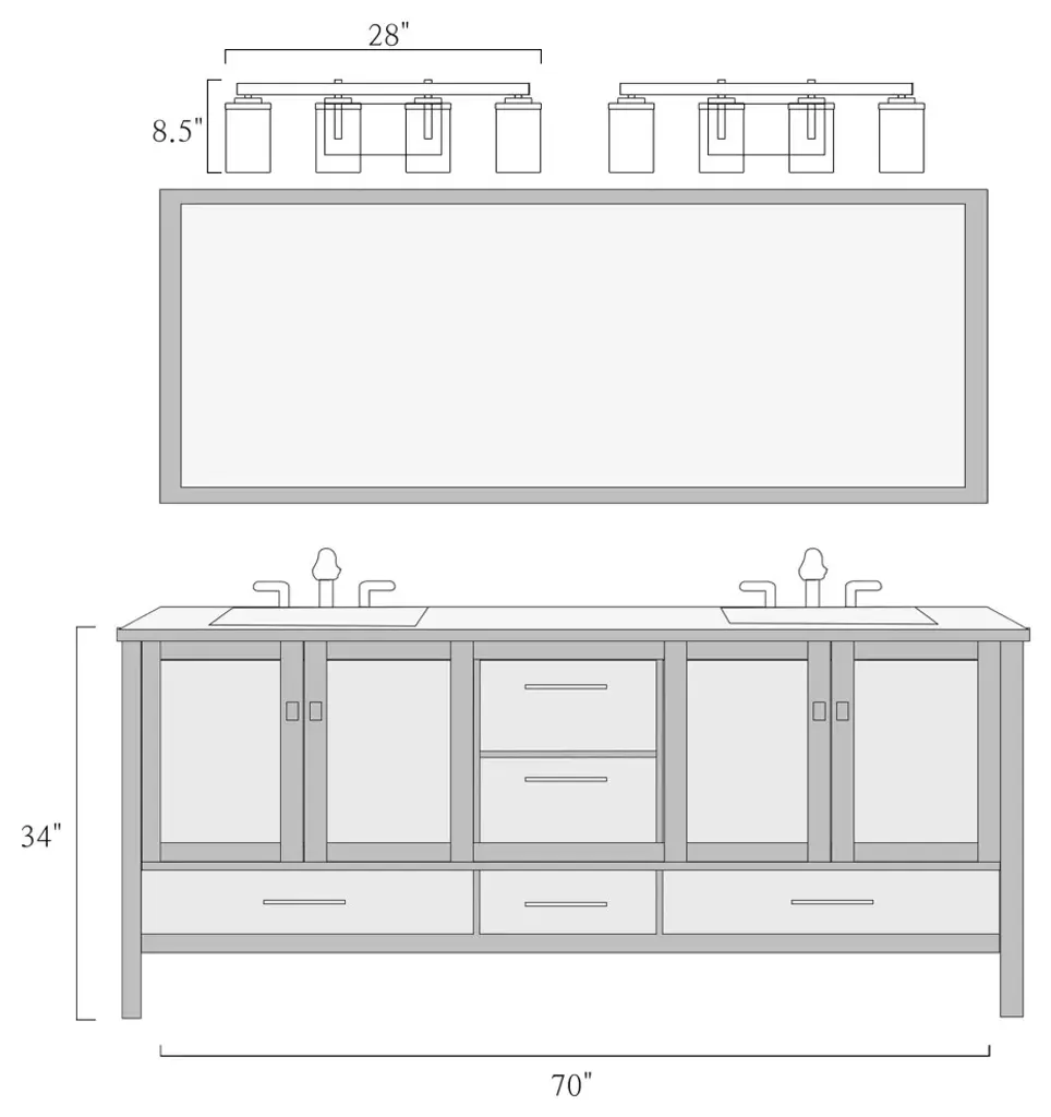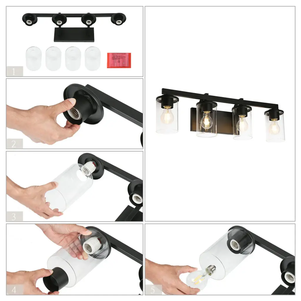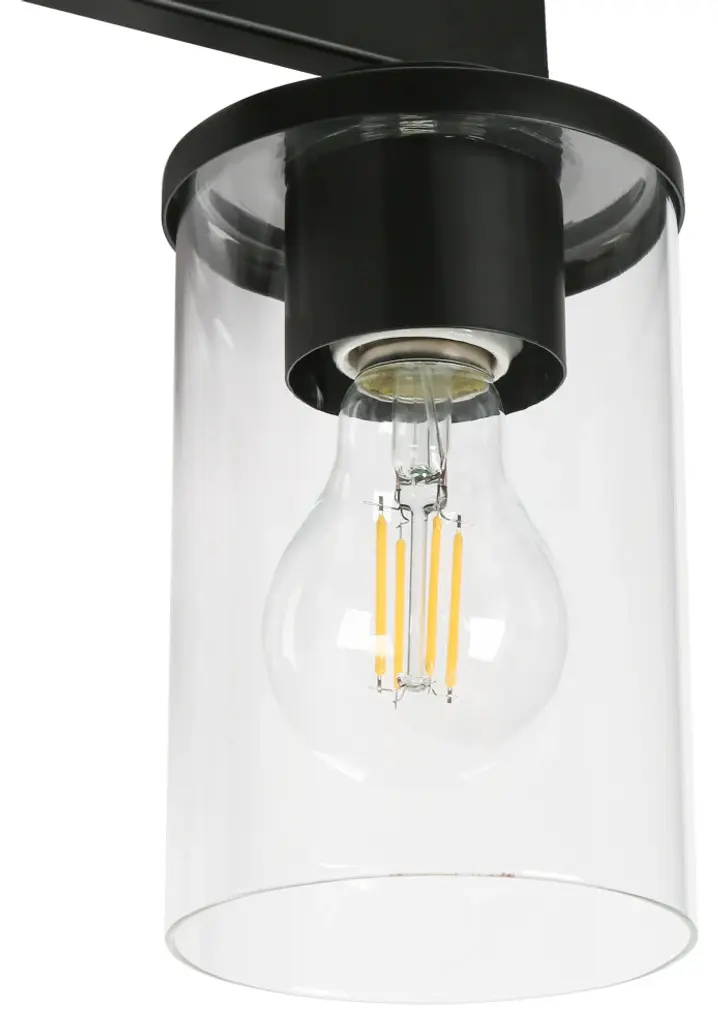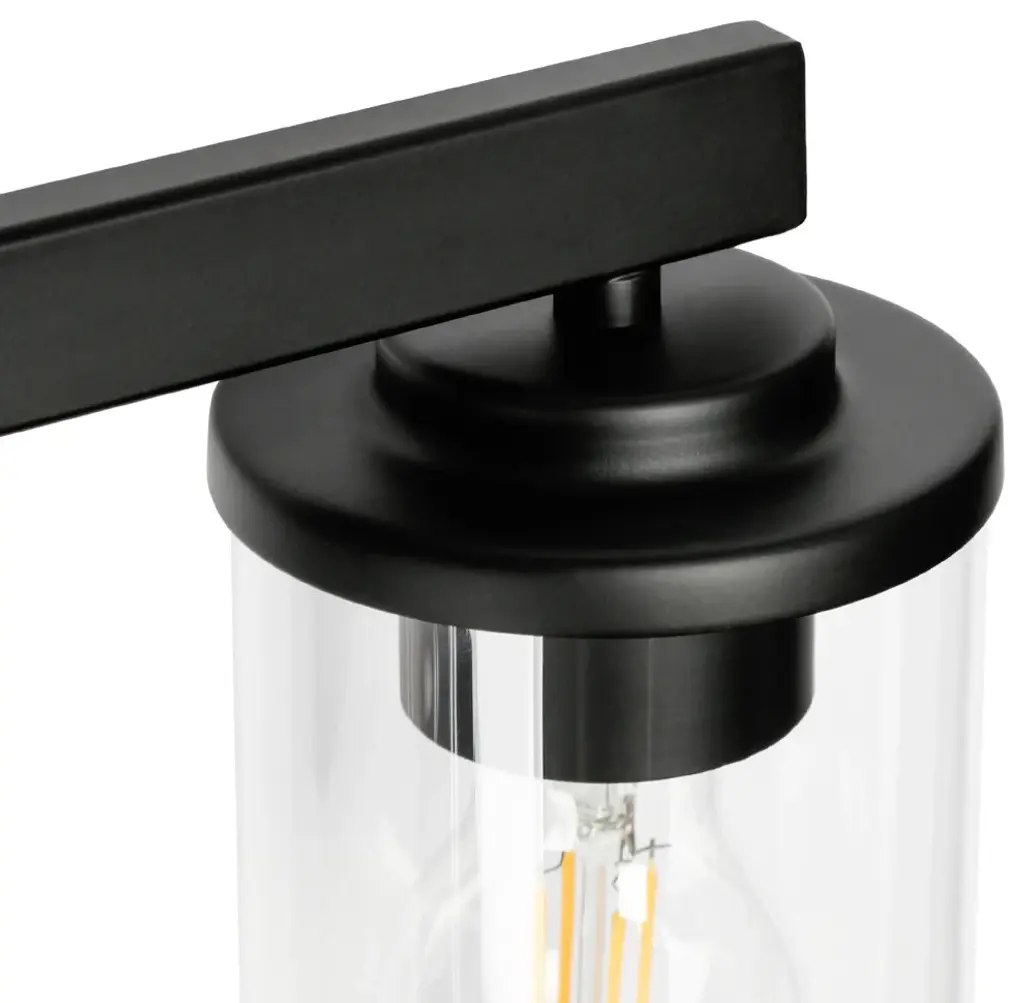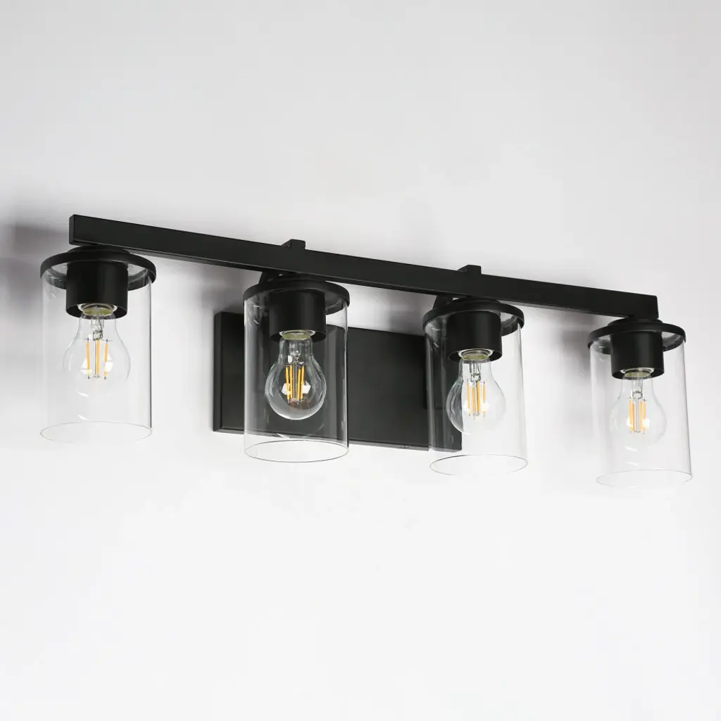 Features: Model: BUVJBBHZ2410AB9Material: Metal, GlassColor: BlackStyle: ModernFinish: Matte BlackProduct Dimension: 28"W x 6"D x 8"H Canopy Dimension: 7.8"W x 4.5"D x 1"HShade Material: GlassShade Color: ClearShade Shape: CylinderLocation: DampDimmable: Yes, when used with a standard dimmer switch and dimmable bulbsKey Features: Bulb Type: A19 LED/Incandescent Bulb Base: E-26 Maximum Wattage: 60W Number of Bulb: 4 Bulb Included: N Voltage: 120V Mount Type: Wall Mounts Assembly Required: Yes Mounting Accessory Included: Yes Power Source: Hardwired Professional installation recommended