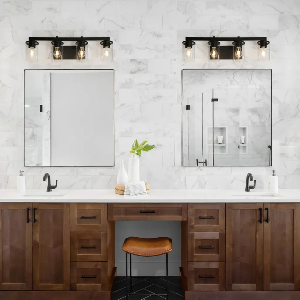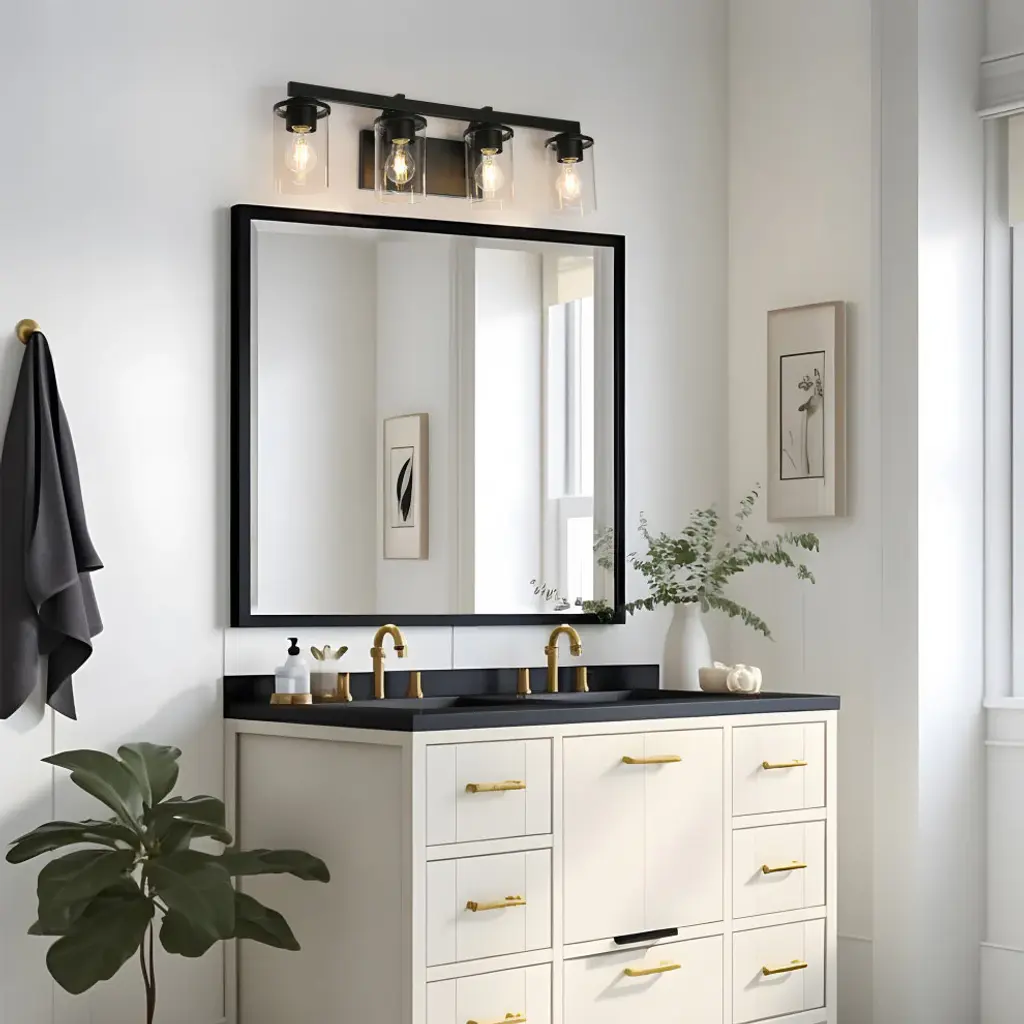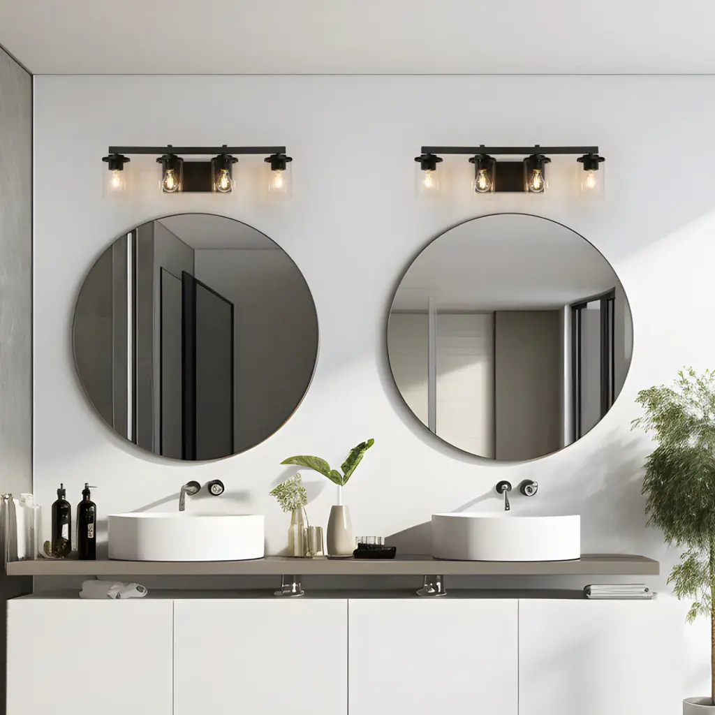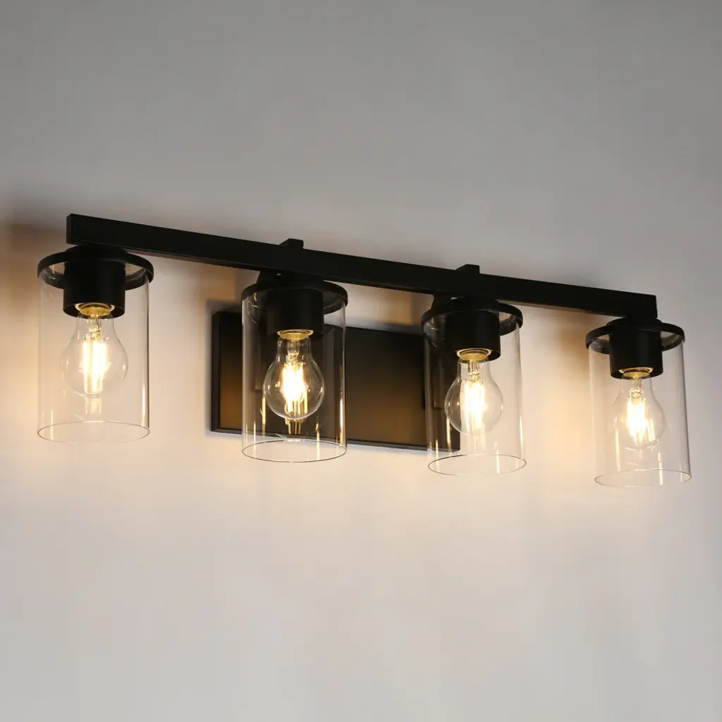 Laluz Clear Glass Farmhouse Bathroom Vanity Lights, Matte Black, 4-Light
