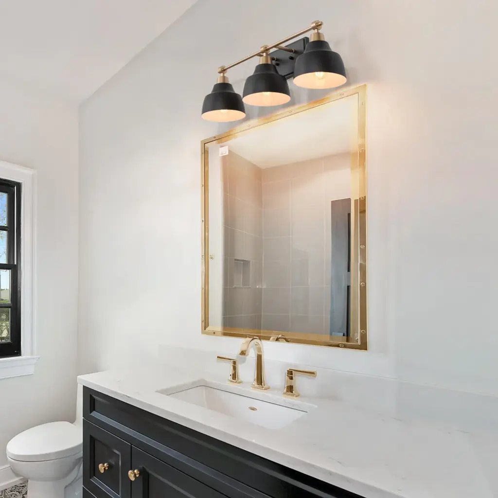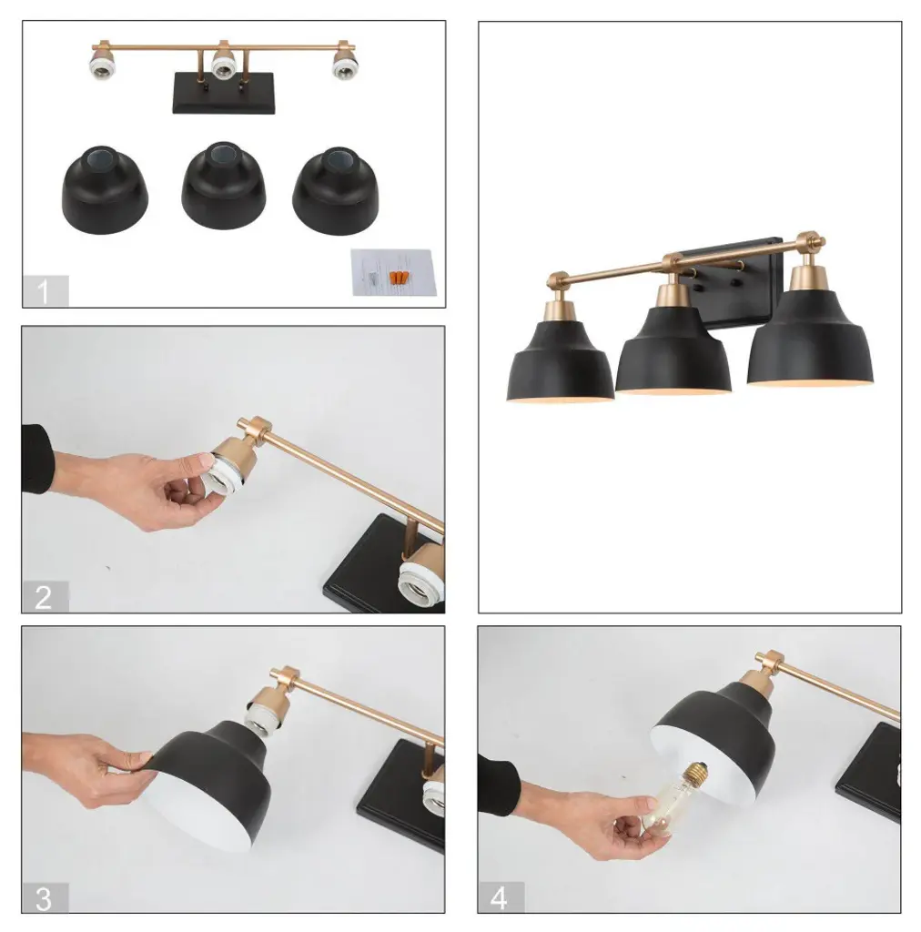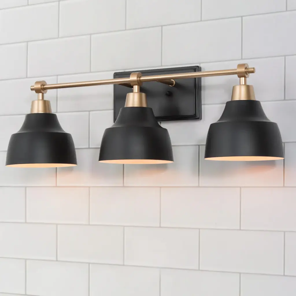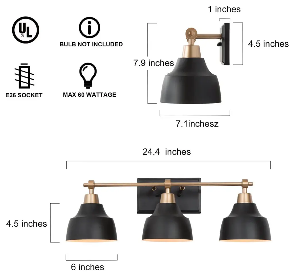 This modern 3-light vanity light fixture features unique 3-layer matt black metal cone shades and a modern matte gold finish creating an inspired look of simplistic charm, this vanity light has three sleek and minimalistic black shades extending from a center bar and three special dome shape gold cap shades. A contemporary design with clean lines and a modern silhouette, this fixture adds instant elegance and chicness beyond measure to a space.Recommend using E26 base, Type A19, max 12-watt LED light bulbs for maximum lighting.Features: Model: AYFRQ3HZ2406067Material: MetalColor: Black and GoldStyle: ModernFinish: Matte Black and GoldProduct Dimension: W24.5"• D7"• H8" Canopy Dimension: D4.5"• H1" Shade Material: IronShade Color: BlackShade Shape: DomeLocation: DampDimmable: Yes, when used with a dimmer switch and dimmable bulbsKey Features: Bulb Type: A19 LED/Incandescent Bulb Base: E-26 Maximum Wattage: 60W Number of Bulb: 3 Bulb Included: N Voltage: 120V Mount Type: Wall Mounts Assembly Required: Yes Mounting Accessory Included: Yes Power Source: Hardwired Professional installation recommended