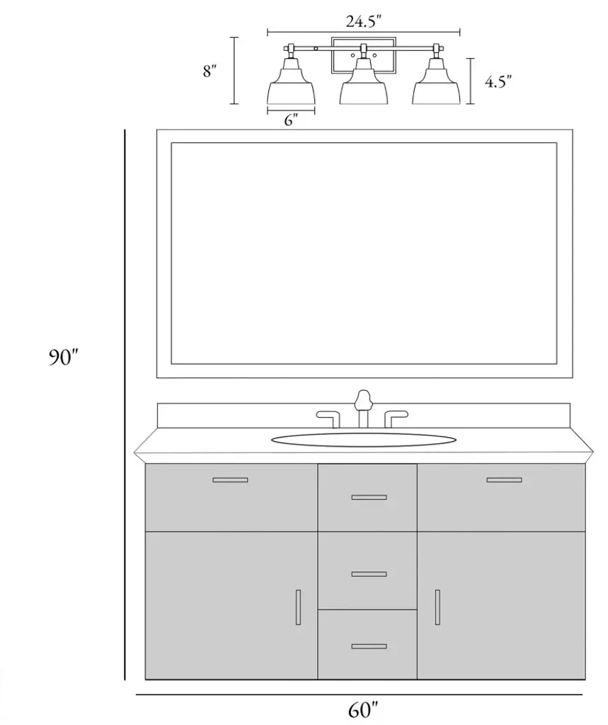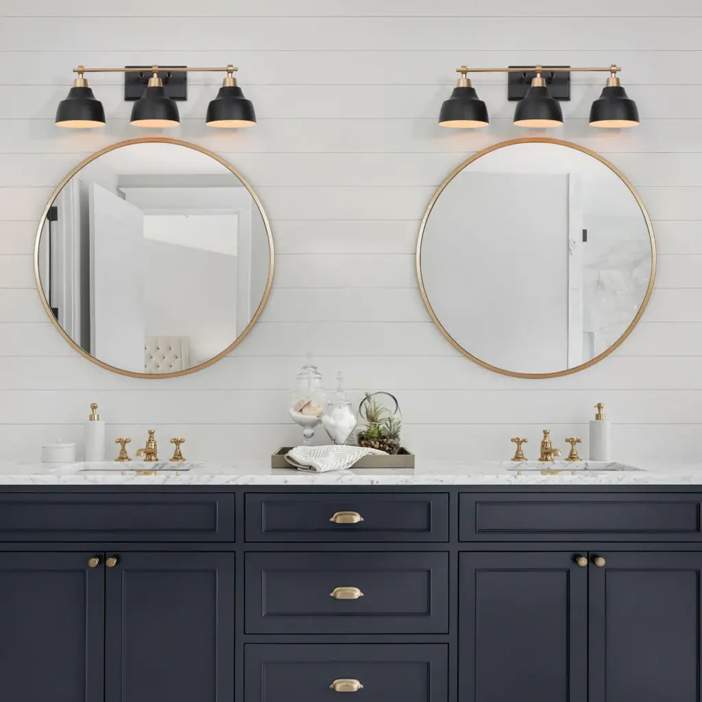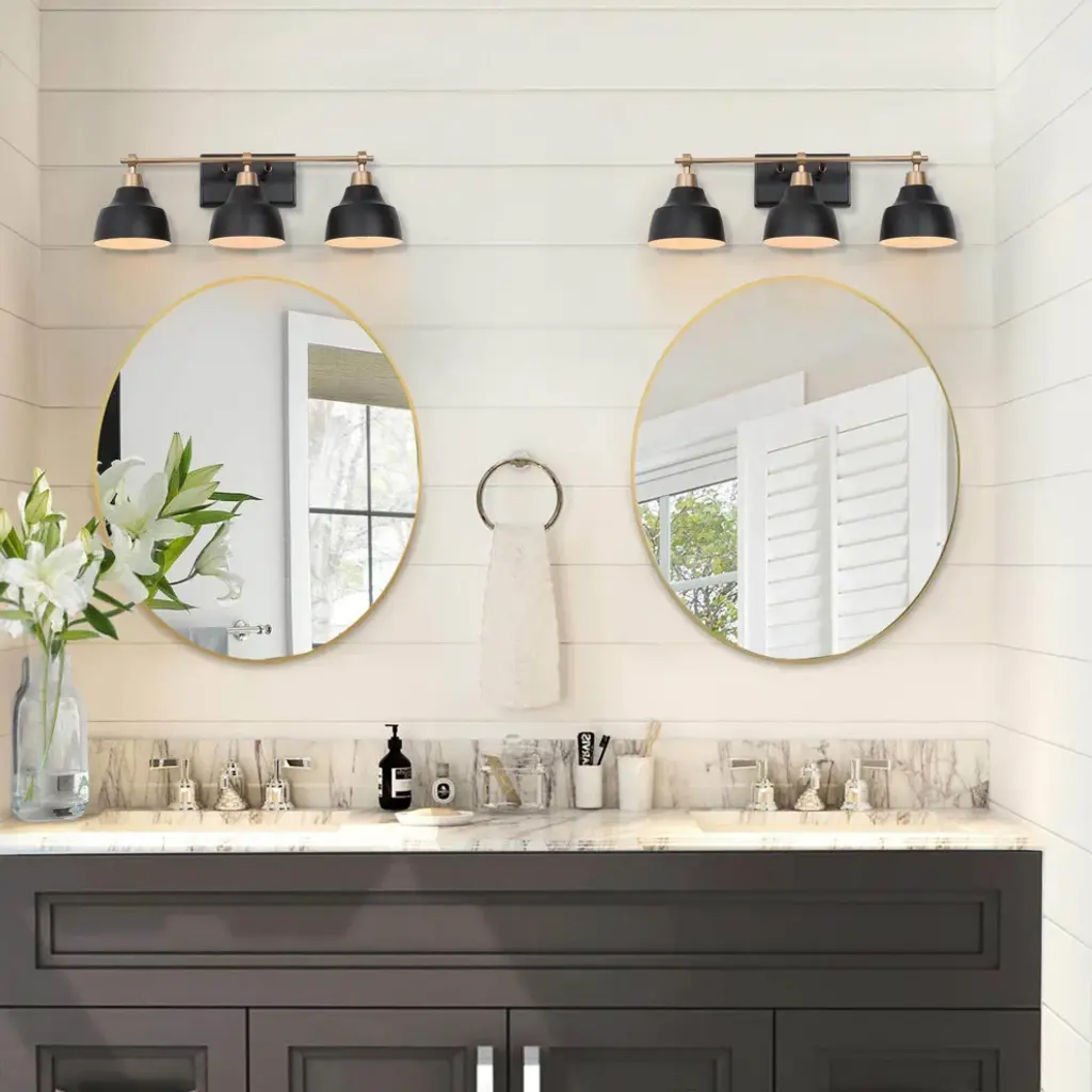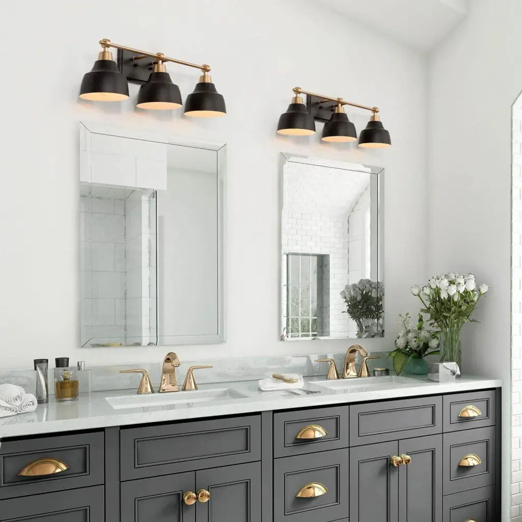 This modern 3-light vanity light fixture features unique 3-layer matt black metal cone shades and a modern matte gold finish creating an inspired look of simplistic charm, this vanity light has three sleek and minimalistic black shades extending from a center bar and three special dome shape gold cap shades. A contemporary design with clean lines and a modern silhouette, this fixture adds instant elegance and chicness beyond measure to a space.Recommend using E26 base, Type A19, max 12-watt LED light bulbs for maximum lighting.Features: Model: AYFRQ3HZ2406067Material: MetalColor: Black and GoldStyle: ModernFinish: Matte Black and GoldProduct Dimension: W24.5"• D7"• H8" Canopy Dimension: D4.5"• H1" Shade Material: IronShade Color: BlackShade Shape: DomeLocation: DampDimmable: Yes, when used with a dimmer switch and dimmable bulbsKey Features: Bulb Type: A19 LED/Incandescent Bulb Base: E-26 Maximum Wattage: 60W Number of Bulb: 3 Bulb Included: N Voltage: 120V Mount Type: Wall Mounts Assembly Required: Yes Mounting Accessory Included: Yes Power Source: Hardwired Professional installation recommended