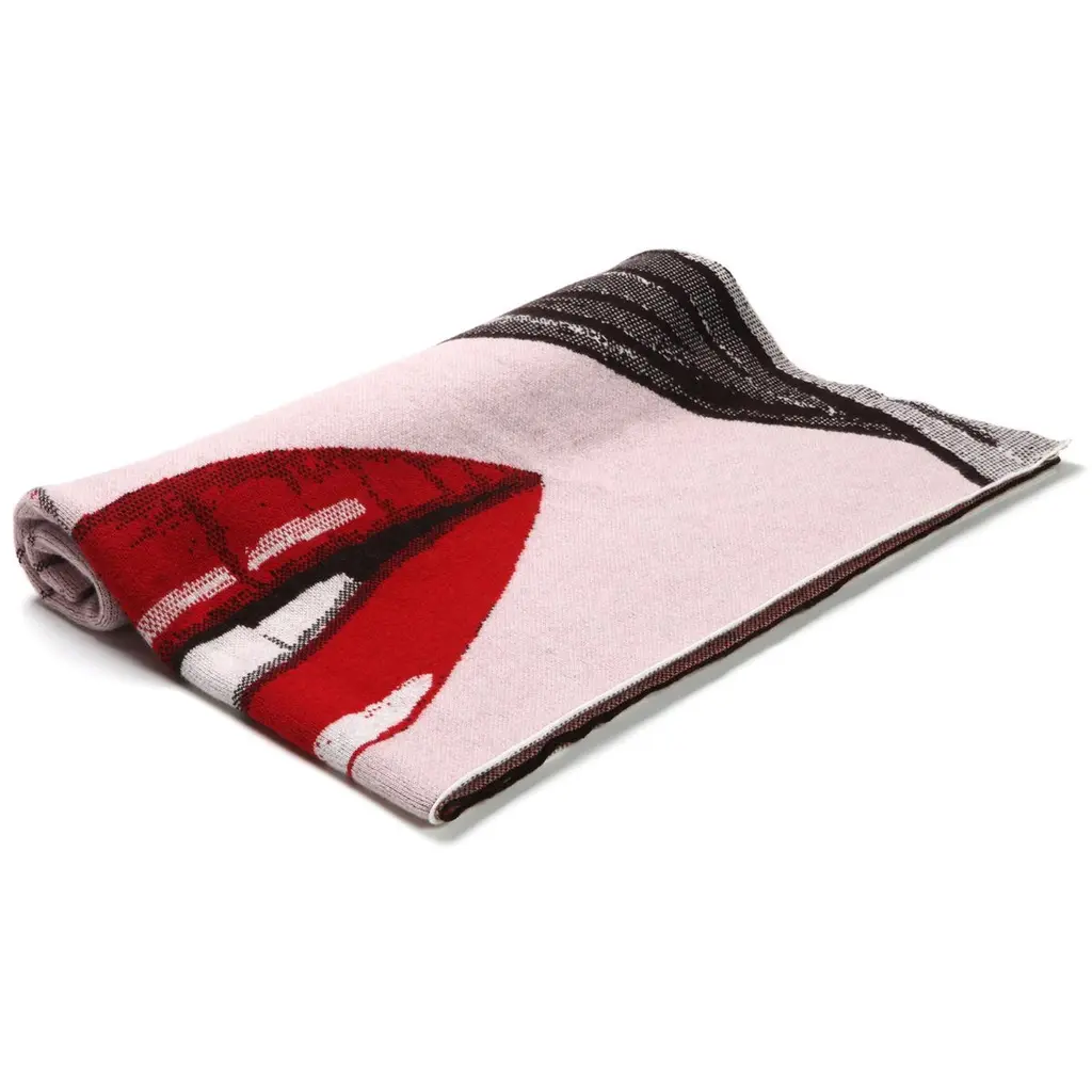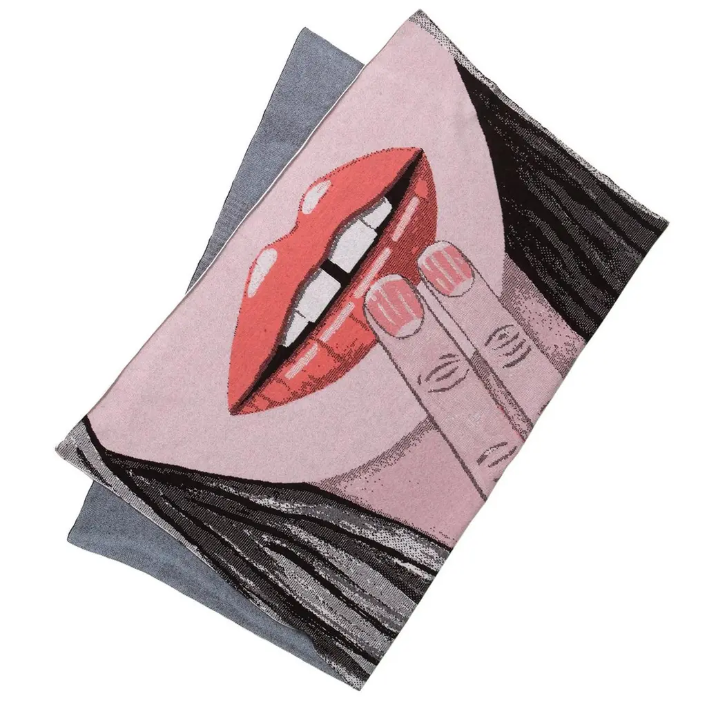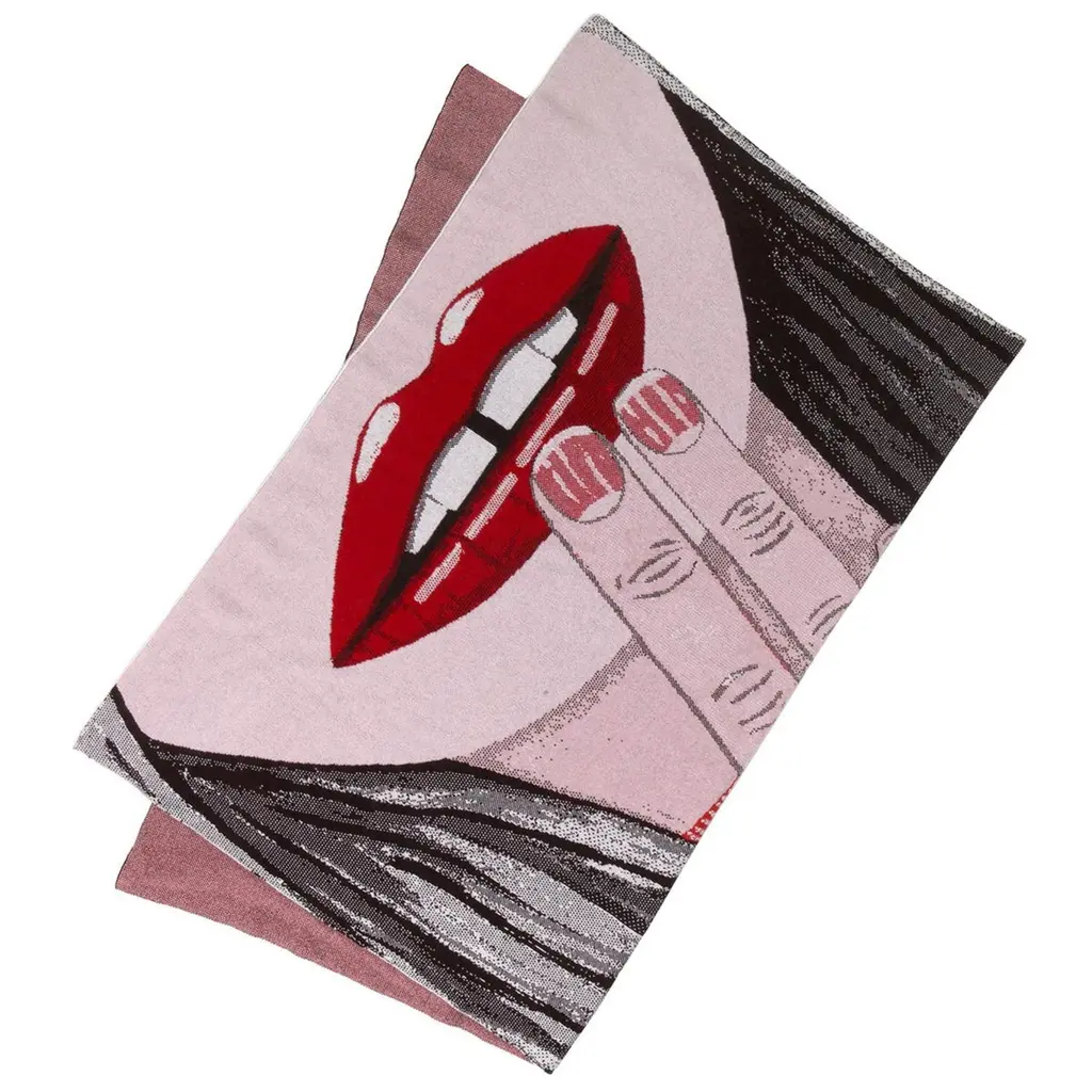 100% geelong lambswoolMade in ScotlandMeasures: 61 x 51 in.Limited edition of 80Bohemians, beauties and burnouts – Calvin is known for his figurative paintings of a typically Californian crowd. Painted in bright, sun-drenched hues with an almost cartoonish quality, Calvin’s figures are shaped by pop cultural references. Although necessarily flat, the images are not easy: the artist includes skewed crops and unknowable narratives in each composition, the result is a painting at once familiar and strange. For his first ever artist’s blanket edition, Calvin has produced an original work that focuses on the mouth, a pervasive motif within his oeuvre. Each blanket is made by master Scottish craftspeople with a rich heritage of knitwear and textile production using completely natural materials. The double-sided knitting style achieves a design rich finish. The front face of the blanket showcases the artwork, whilst a birdseye pattern driven by the knitting style is achieved on the underside. Each blanket has a noticeably soft handle and luxurious feel.One available in each color.