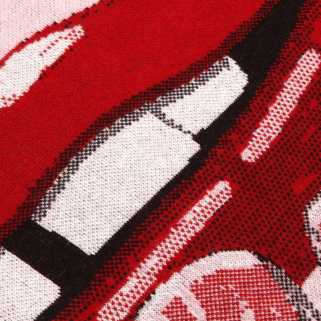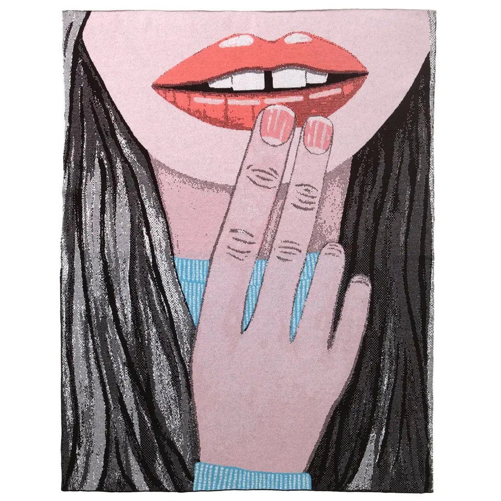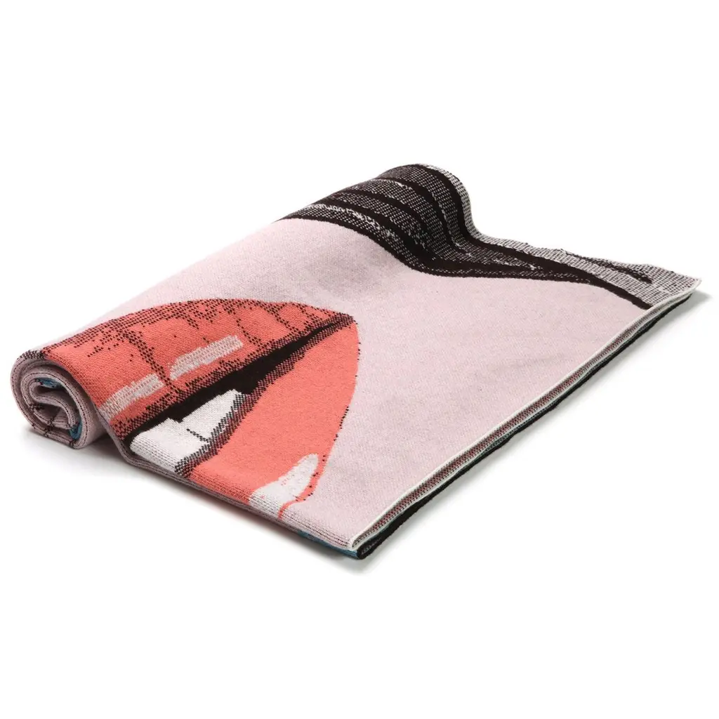 100% geelong lambswoolMade in ScotlandMeasures: 61 x 51 in.Limited edition of 80Bohemians, beauties and burnouts – Calvin is known for his figurative paintings of a typically Californian crowd. Painted in bright, sun-drenched hues with an almost cartoonish quality, Calvin’s figures are shaped by pop cultural references. Although necessarily flat, the images are not easy: the artist includes skewed crops and unknowable narratives in each composition, the result is a painting at once familiar and strange. For his first ever artist’s blanket edition, Calvin has produced an original work that focuses on the mouth, a pervasive motif within his oeuvre. Each blanket is made by master Scottish craftspeople with a rich heritage of knitwear and textile production using completely natural materials. The double-sided knitting style achieves a design rich finish. The front face of the blanket showcases the artwork, whilst a birdseye pattern driven by the knitting style is achieved on the underside. Each blanket has a noticeably soft handle and luxurious feel.One available in each color.