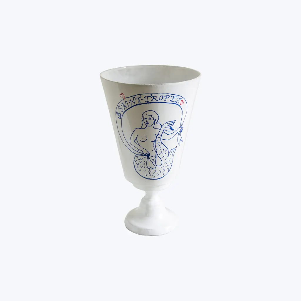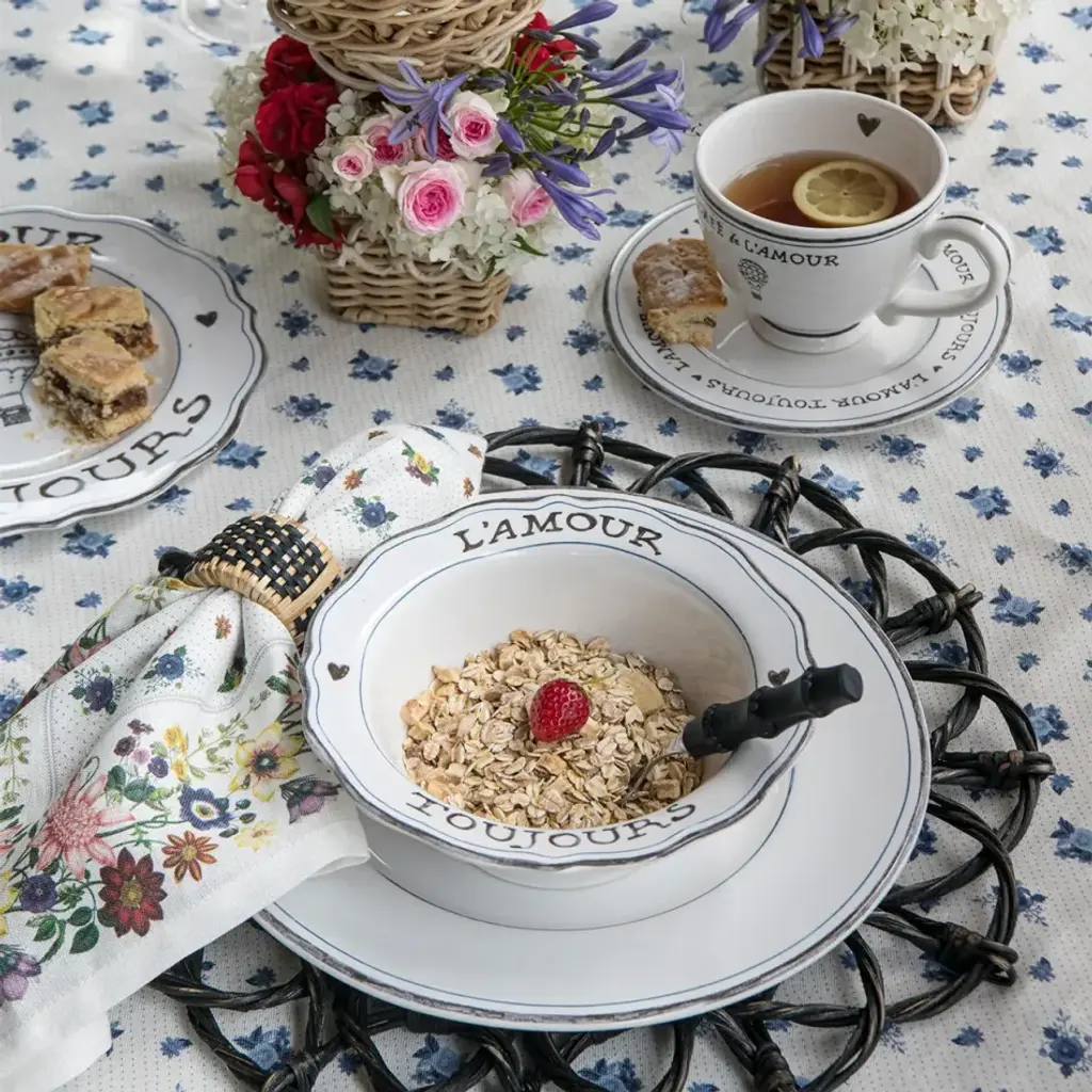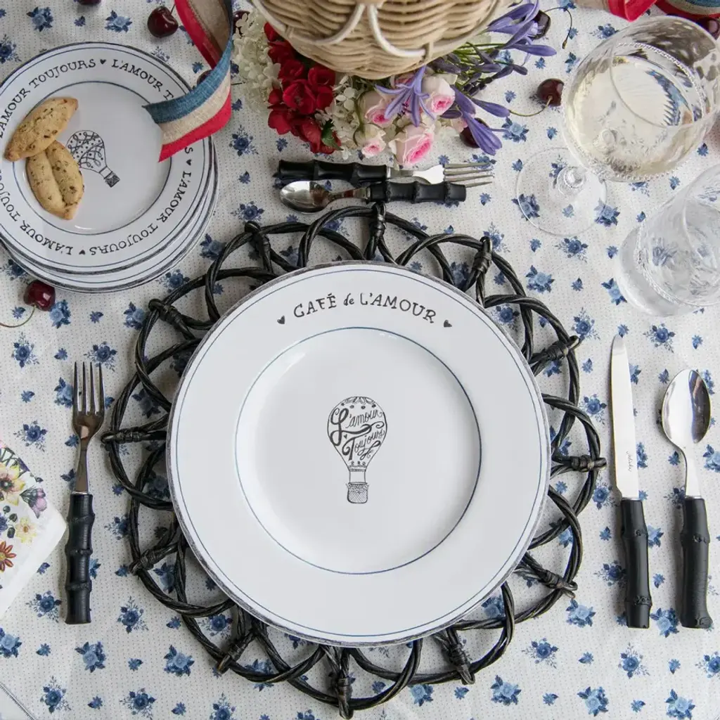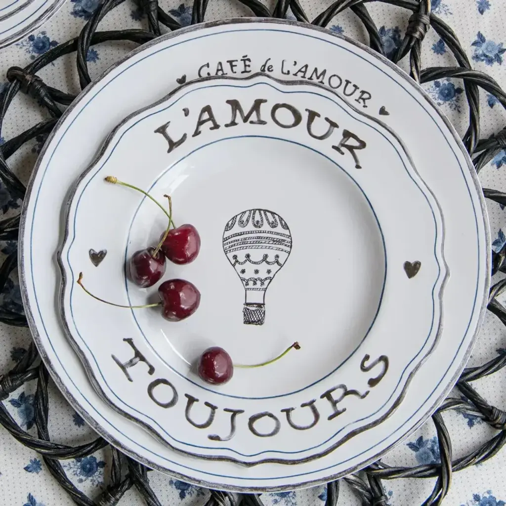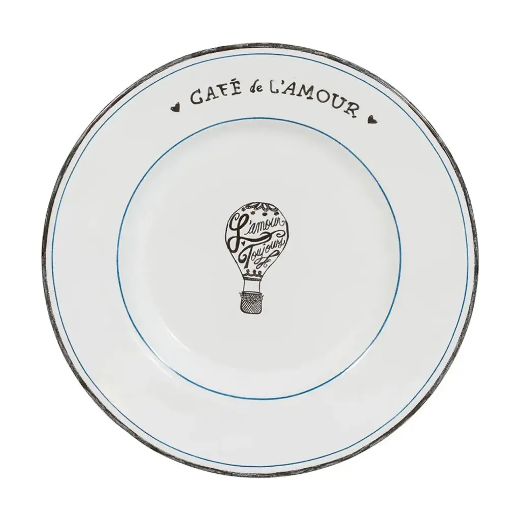 Greet every sunrise with this copious “cofftea cup” that is trimmed in chic black and blue details and is abundantly sized to fuel your daily adventures with coffee, tea, or a decadent chocolat chaud. A petite heart flies alongside our hand sketched Cafe de L’Amour banner and hot air balloon, reminding us to share love wherever the day may take us. Based in Connecticut, Juliska is committed to bringing elegant European design into our modern homes. Since its founding in 2001, when David and Capucine Gooding began by working with artisans outside of Prague to reproduce antique Bohemian glass pieces, every piece from Juliska has shared a rich heritage spanning six centuries of European design. Juliska's creations are timeless, romantic and effortlessly chic.