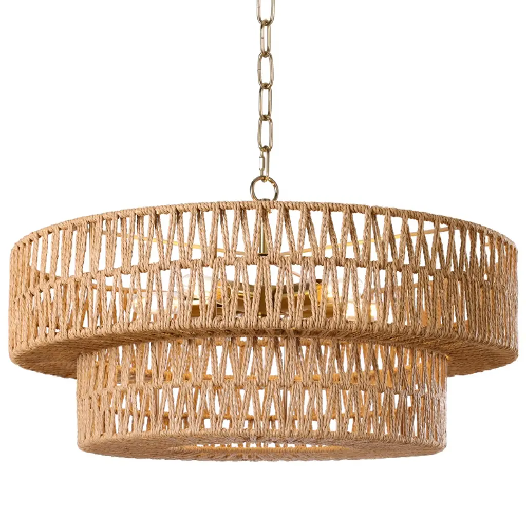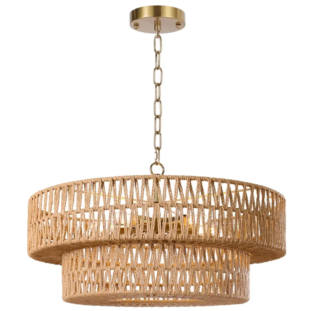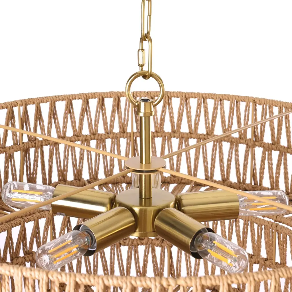 Lamqee 22 Inch Farmhouse Rattan Chandeliers, Gold 5 Lights Boho Chandelier Light Fixture With Hand Woven Wicker Shade