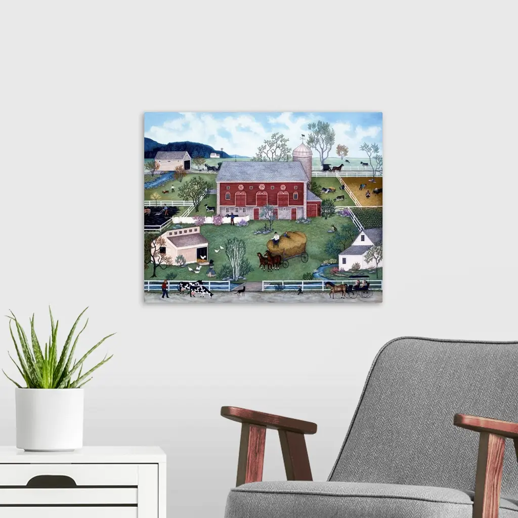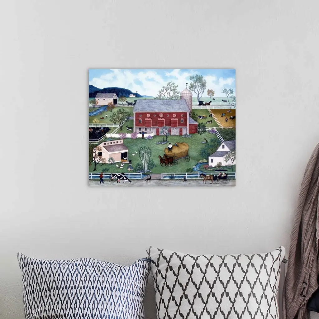 A contemporary painting of a countryside village scene.