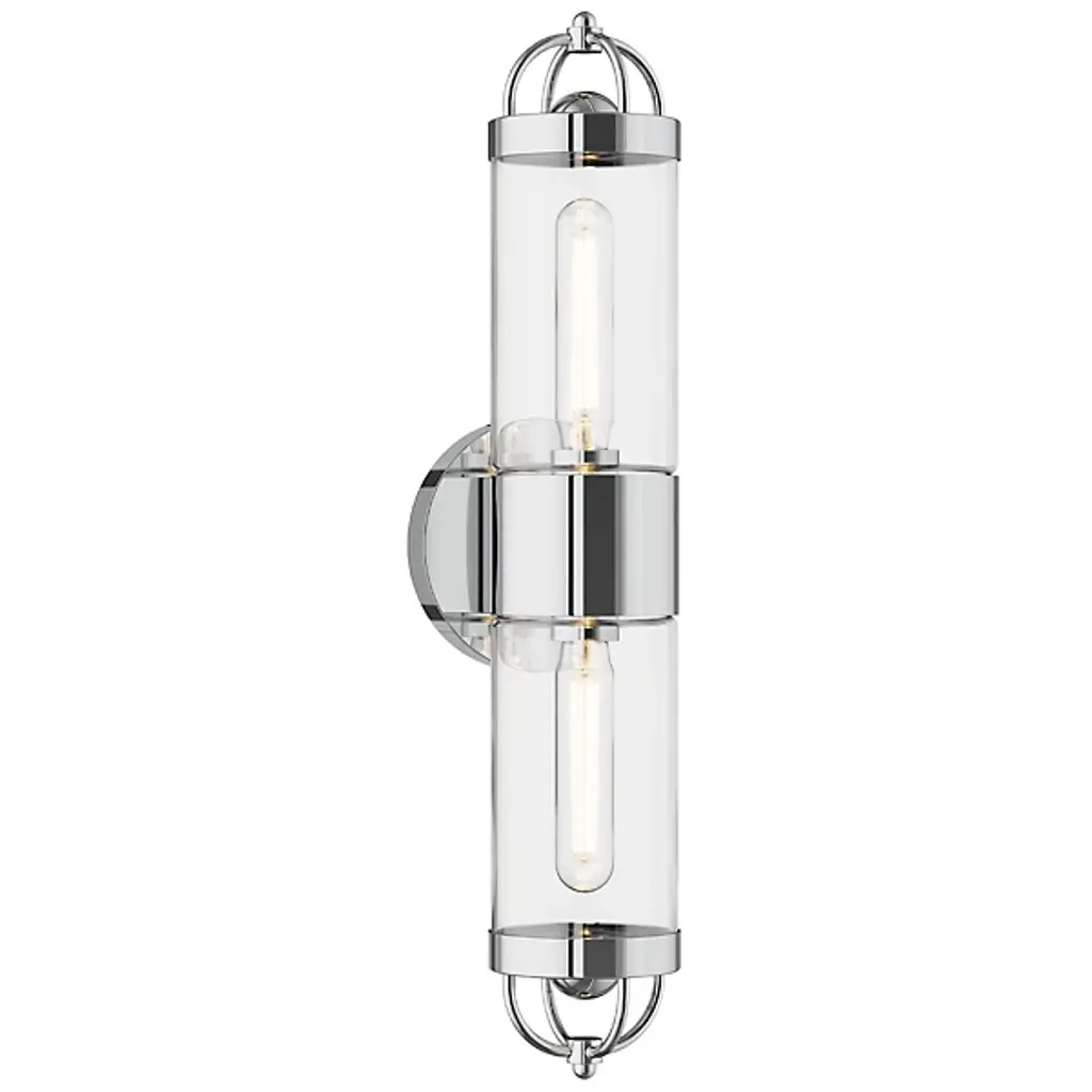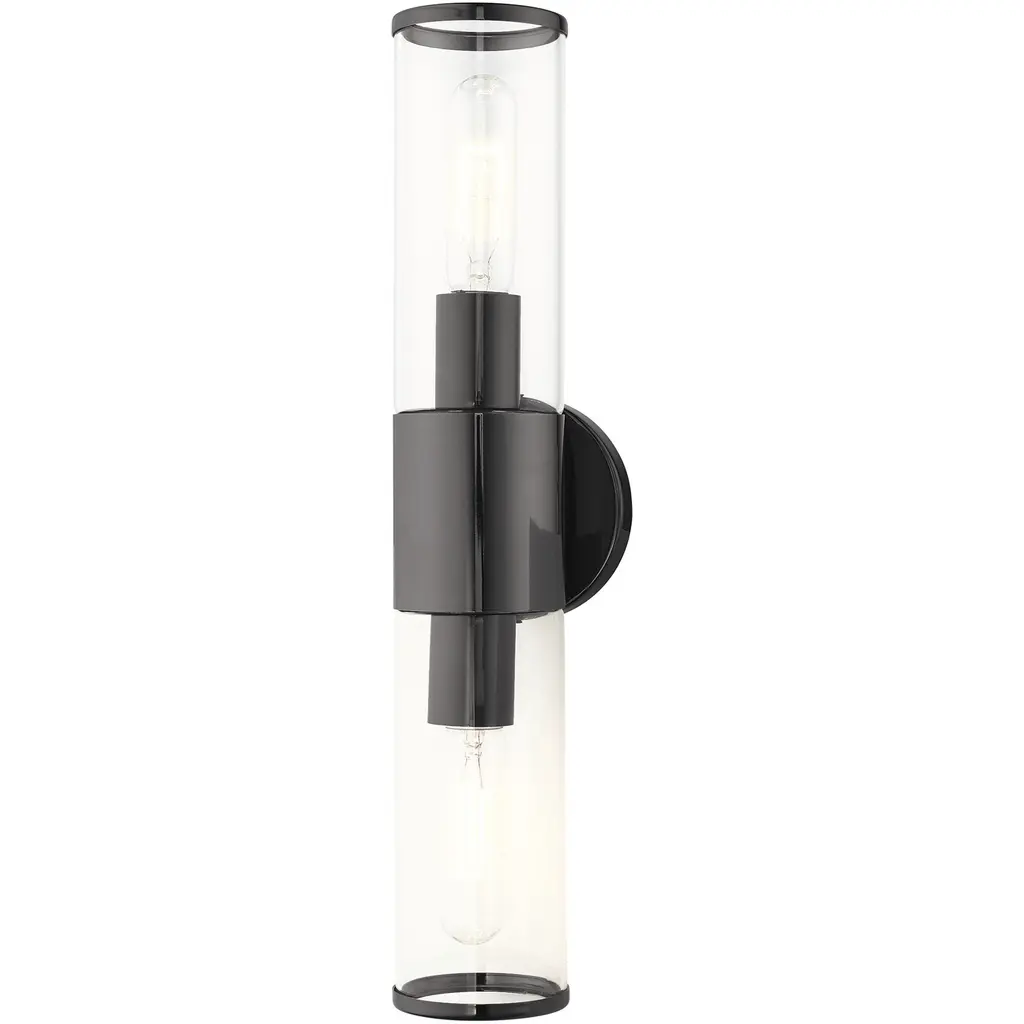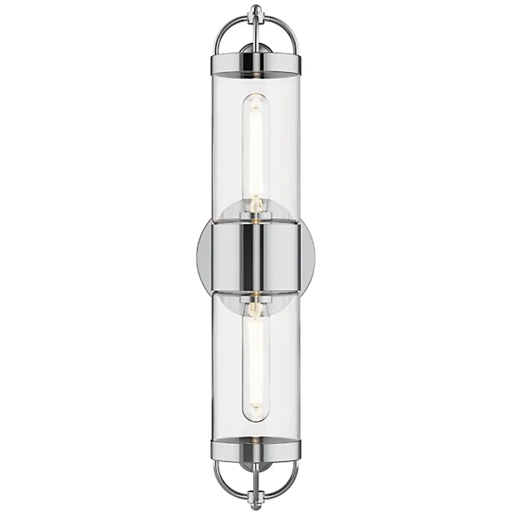 The Lancaster Vanity Light from Alora Mood adds an inspired transitional presence to indoor walls. A delightful vintage offering inspired by vintage Parisian lanterns, its intricate construction elevates its surroundings, using a circular wall plate and twin cylinders of clear glass to enclose damp-rated lamping. A circular cap with arcing accents caps off each cylinder, coordinating with the metal mounting to obscure and mellow direct light, transmitting a graceful ambiance around the fixture.