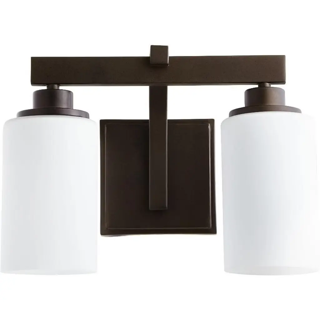 Load up your bathroom walls and halls alike with the simple lines of the Lancaster Vanity Light from Quorum International. A simple modern fixture framed in metal, it starts with a stepped square wall mount that extends flat-sided bracing arms up and over to a longer bar held up and horizontally across the front. Individual damp-rated single socket lamps point down from the bar’s lower surface, surrounded by cylindrical glass shades that create a warm ambiance at eye level while shining out below.