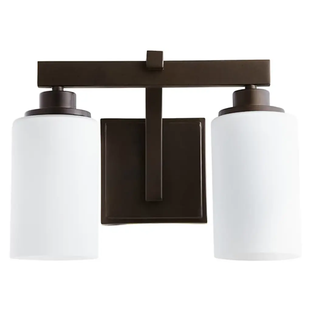 Load up your bathroom walls and halls alike with the simple lines of the Lancaster Vanity Light from Quorum International. A simple modern fixture framed in metal, it starts with a stepped square wall mount that extends flat-sided bracing arms up and over to a longer bar held up and horizontally across the front. Individual damp-rated single socket lamps point down from the bar’s lower surface, surrounded by cylindrical glass shades that create a warm ambiance at eye level while shining out below.