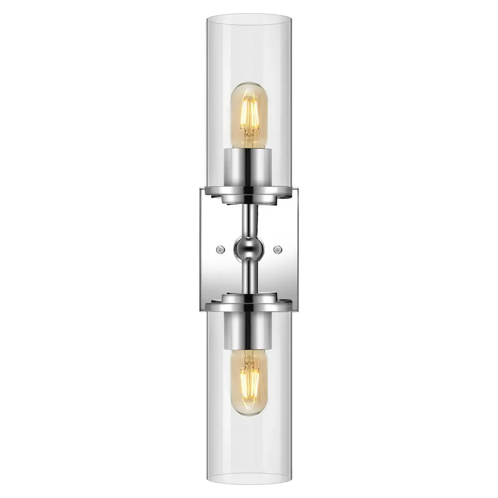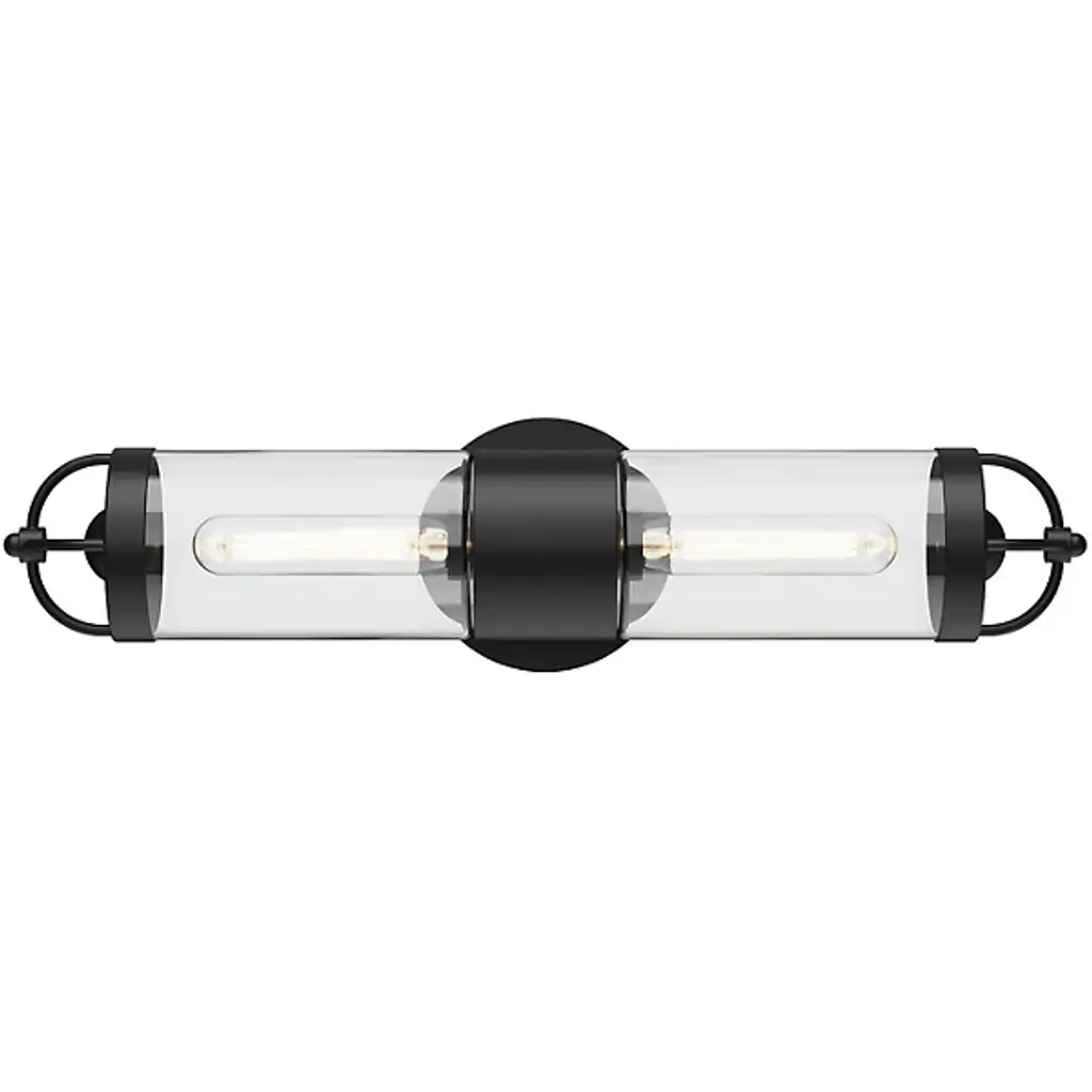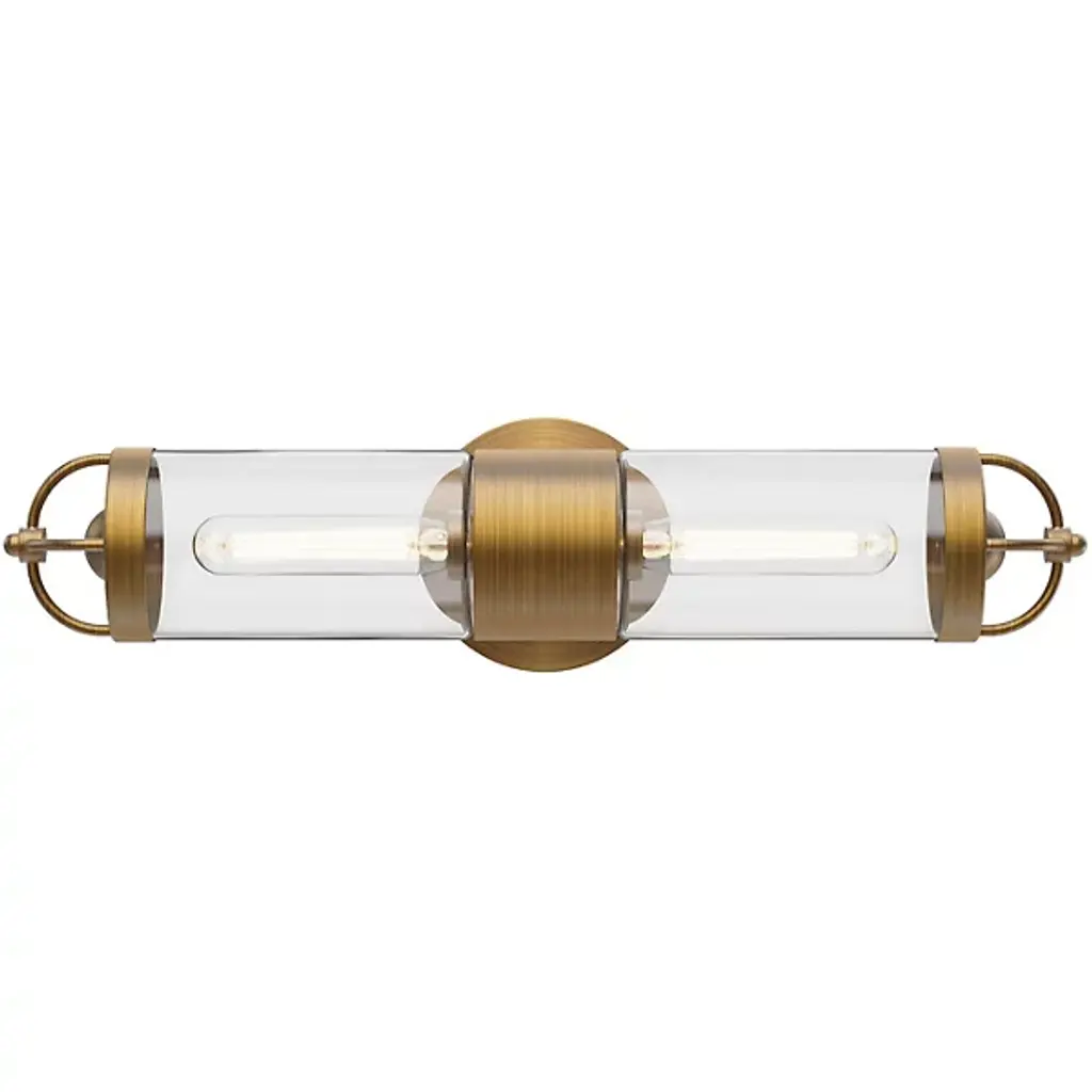 The Lancaster Vanity Light from Alora Mood adds an inspired transitional presence to indoor walls. A delightful vintage offering inspired by vintage Parisian lanterns, its intricate construction elevates its surroundings, using a circular wall plate and twin cylinders of clear glass to enclose damp-rated lamping. A circular cap with arcing accents caps off each cylinder, coordinating with the metal mounting to obscure and mellow direct light, transmitting a graceful ambiance around the fixture.