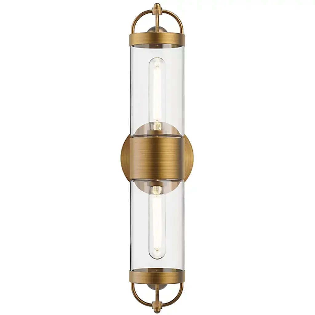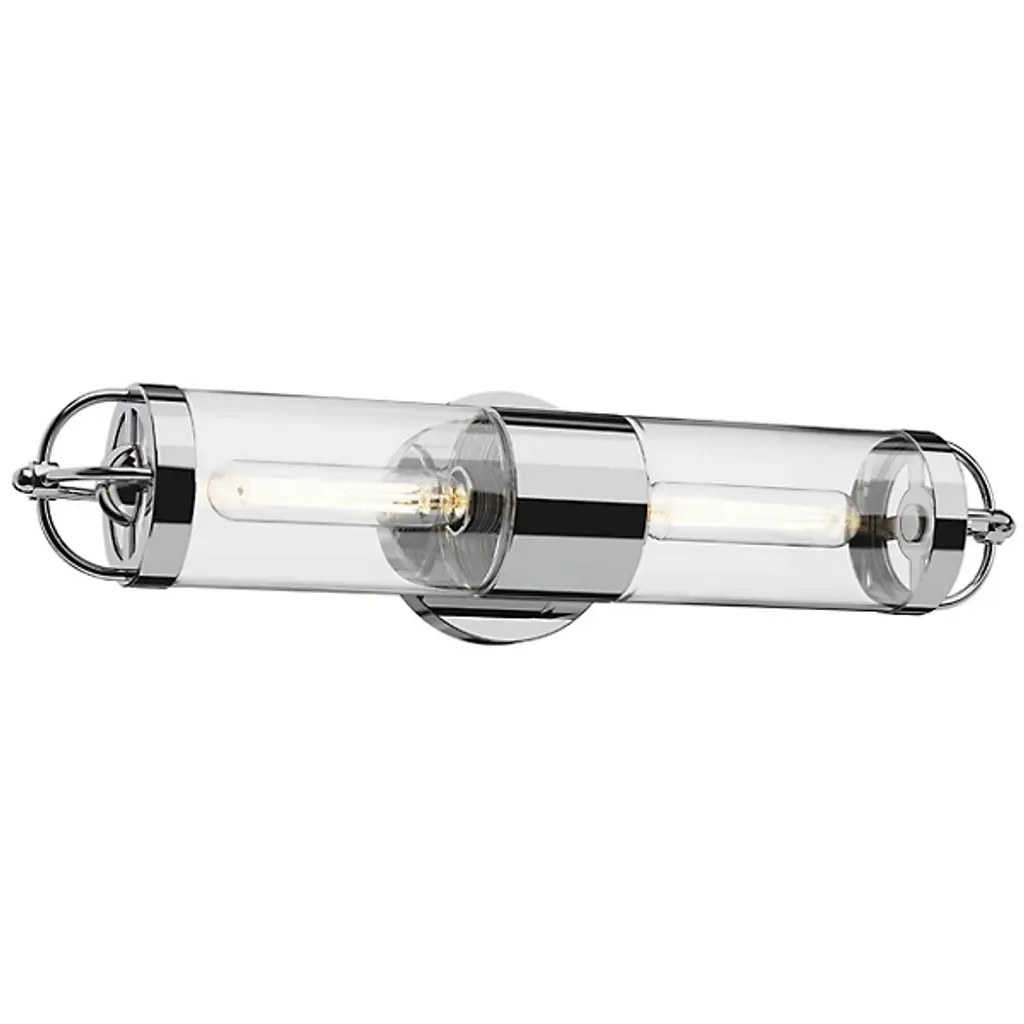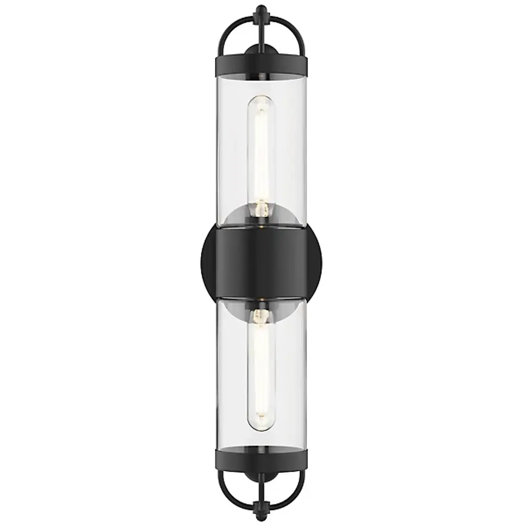The Lancaster Vanity Light from Alora Mood adds an inspired transitional presence to indoor walls. A delightful vintage offering inspired by vintage Parisian lanterns, its intricate construction elevates its surroundings, using a circular wall plate and twin cylinders of clear glass to enclose damp-rated lamping. A circular cap with arcing accents caps off each cylinder, coordinating with the metal mounting to obscure and mellow direct light, transmitting a graceful ambiance around the fixture.