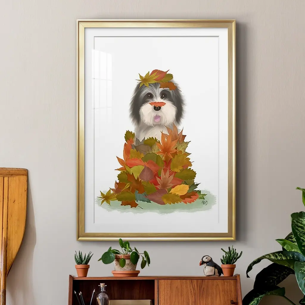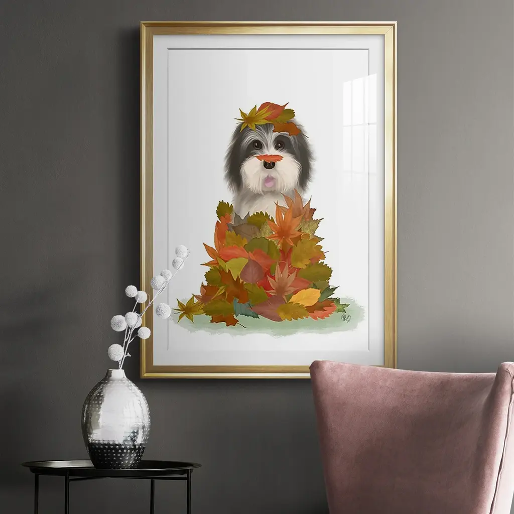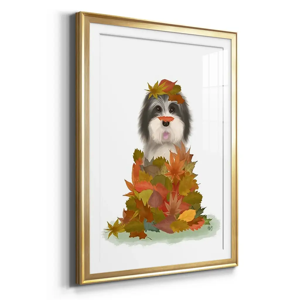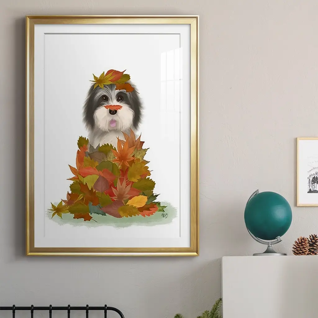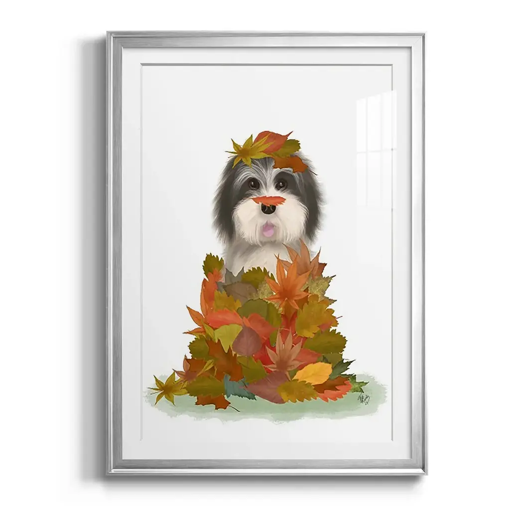 Landed in Autumn, Black and White Dog Premium Framed Print - Ready to Hang A Premium Framed Print created to last. Framed in distressed wood and available in an array of sizes and colors Featuring a beveled a solid wood stretcher bar, each piece comes ready to hand 4 SIZES AVAILABLE 30.5''X42.5'' - Overall Size 26.5'X36.5'' - Overall Size 22.5''x30.5'' - Overall Size 18.5''x24.5'' - Overall Size Each piece is made to order. Each piece comes with hanging hardware. Made in the USA Ready to Hang Giclee Paper Print Acrylic Glass Beveled Matt Board