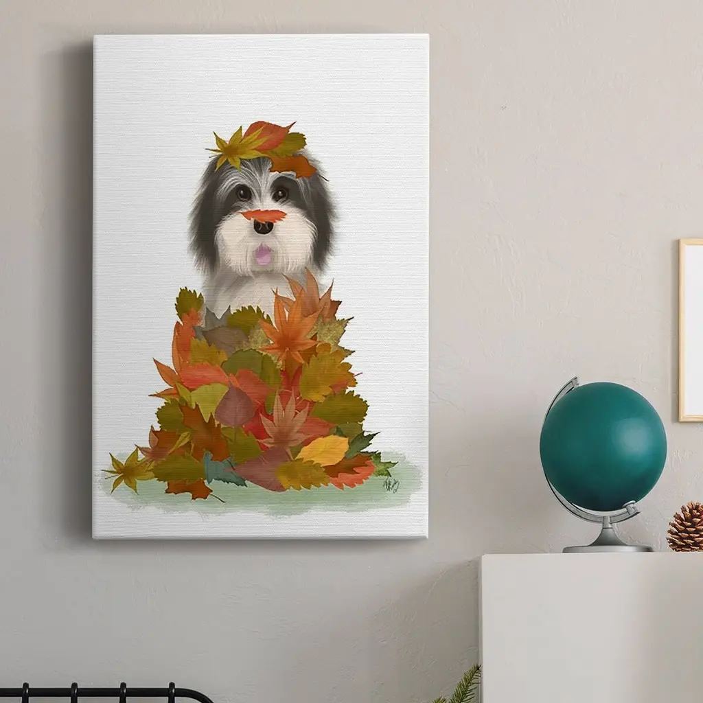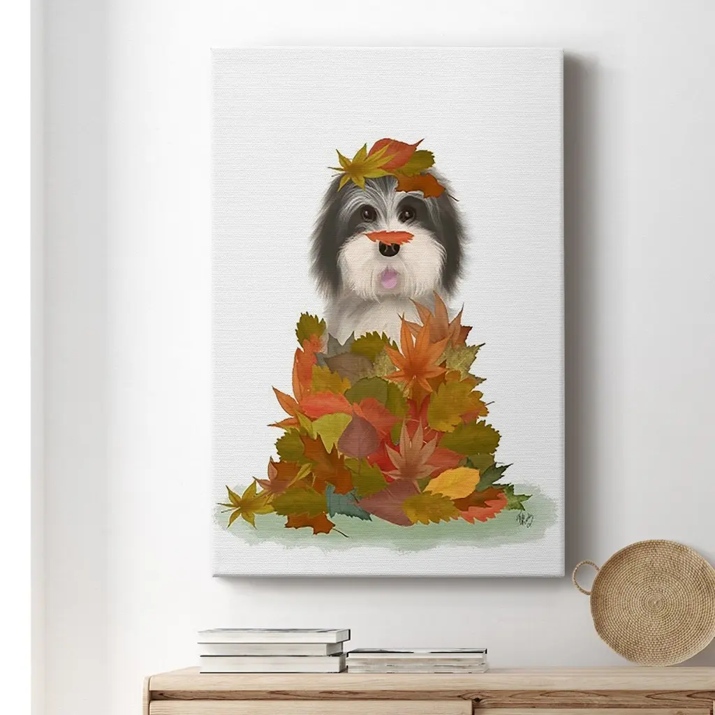 Landed in Autumn, Black and White Dog Premium Gallery Wrapped Canvas - Ready to Hang A premium hand stretched gallery wrapped canvas print created to last. Featuring a beveled a solid wood stretcher bar, each piece comes ready to hand 6 SIZES AVAILABLE 8''X12'' - Overall Size 12''X18'' - Overall Size 18''X27'' - Overall Size 24''x36'' - Overall Size 32''x48'' - Overall Size 40''x60'' - Overall Size Each piece is made to order. Built to Last Each piece comes ready to hang Solid wood stretcher Fade and Water resistant Made domestically
