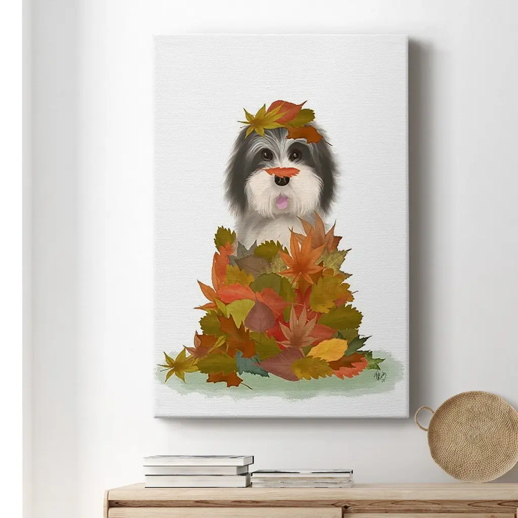 Landed In Autumn, Black And White Dog Premium Gallery Wrapped Canvas - Ready To Hang - 32x48