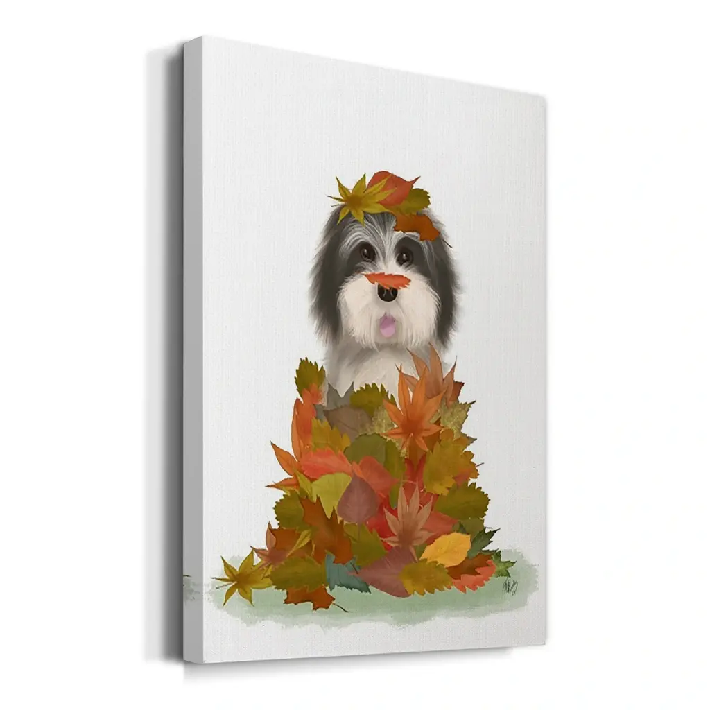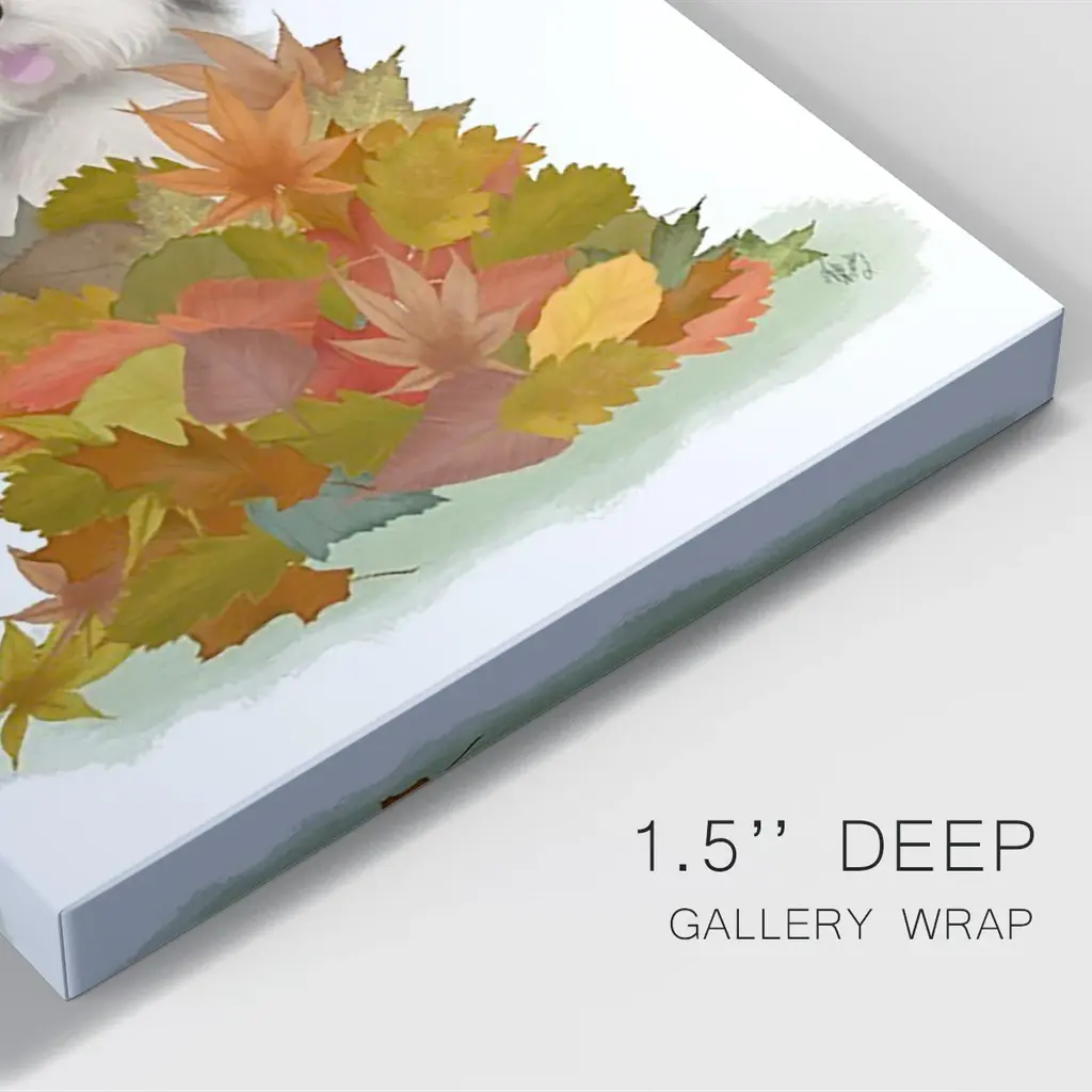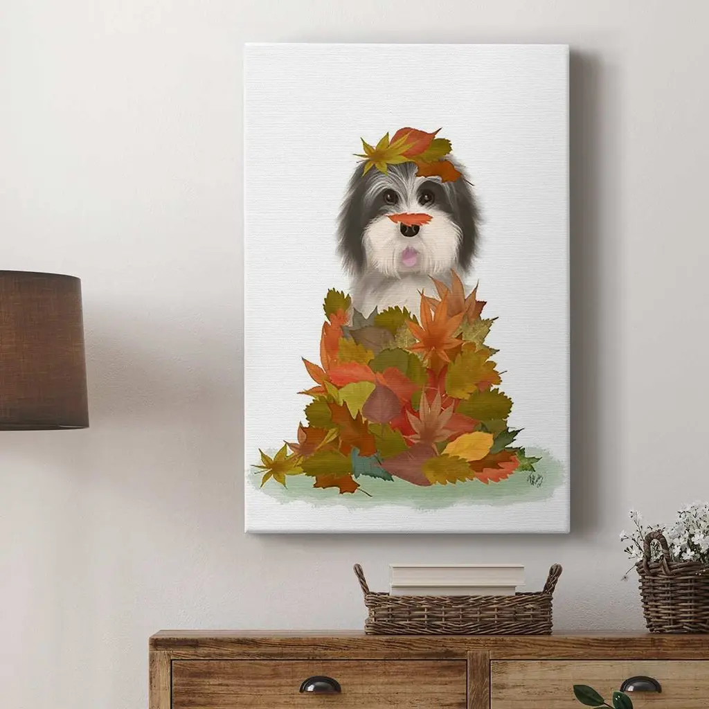 Landed in Autumn, Black and White Dog Premium Gallery Wrapped Canvas - Ready to Hang A premium hand stretched gallery wrapped canvas print created to last. Featuring a beveled a solid wood stretcher bar, each piece comes ready to hand 6 SIZES AVAILABLE 8''X12'' - Overall Size 12''X18'' - Overall Size 18''X27'' - Overall Size 24''x36'' - Overall Size 32''x48'' - Overall Size 40''x60'' - Overall Size Each piece is made to order. Built to Last Each piece comes ready to hang Solid wood stretcher Fade and Water resistant Made domestically
