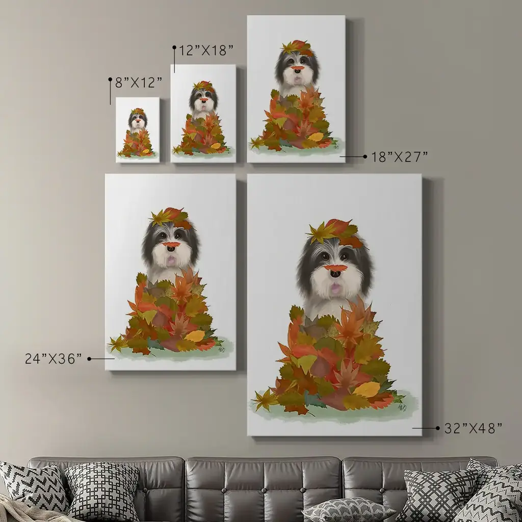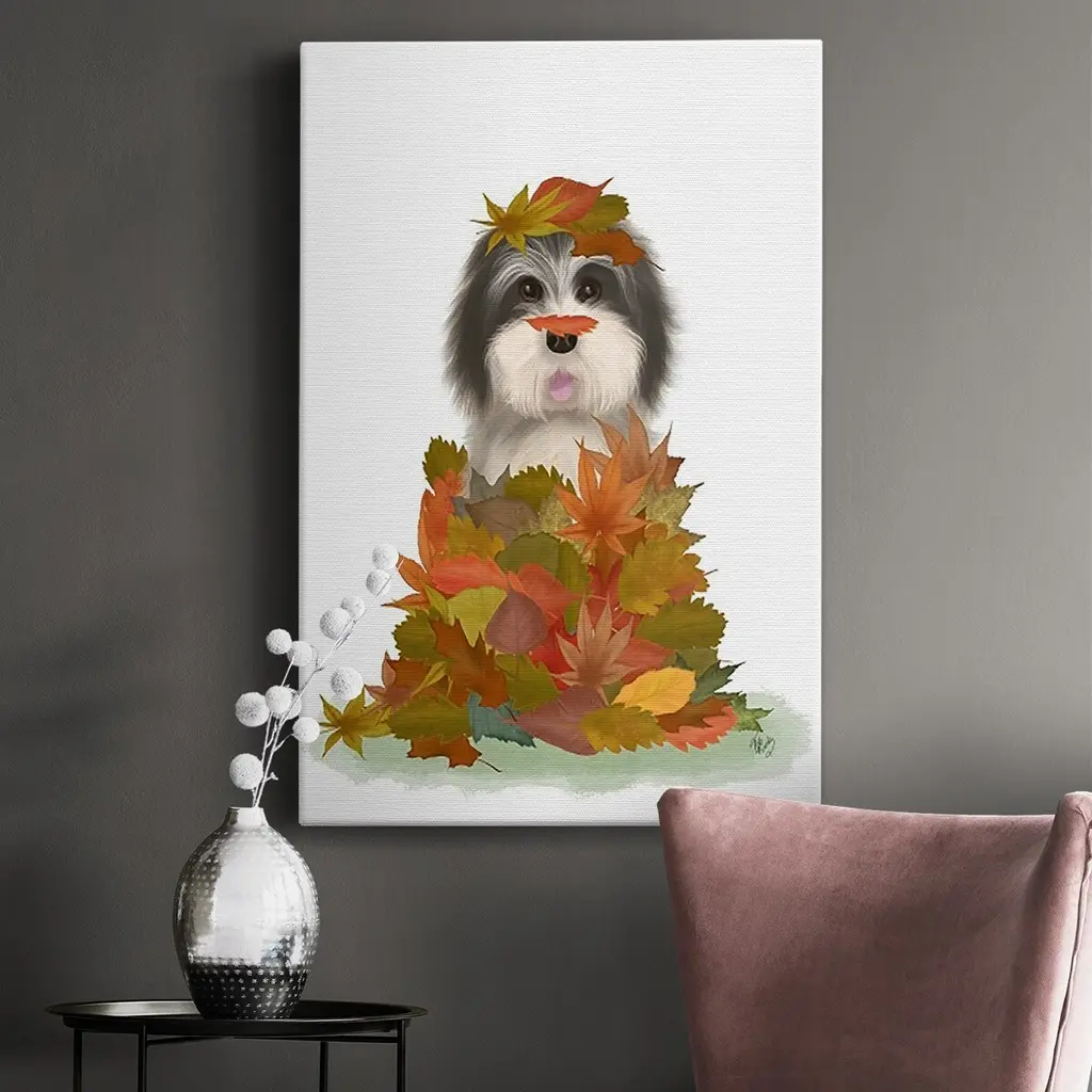 Landed in Autumn, Black and White Dog Premium Gallery Wrapped Canvas - Ready to Hang A premium hand stretched gallery wrapped canvas print created to last. Featuring a beveled a solid wood stretcher bar, each piece comes ready to hand 6 SIZES AVAILABLE 8''X12'' - Overall Size 12''X18'' - Overall Size 18''X27'' - Overall Size 24''x36'' - Overall Size 32''x48'' - Overall Size 40''x60'' - Overall Size Each piece is made to order. Built to Last Each piece comes ready to hang Solid wood stretcher Fade and Water resistant Made domestically