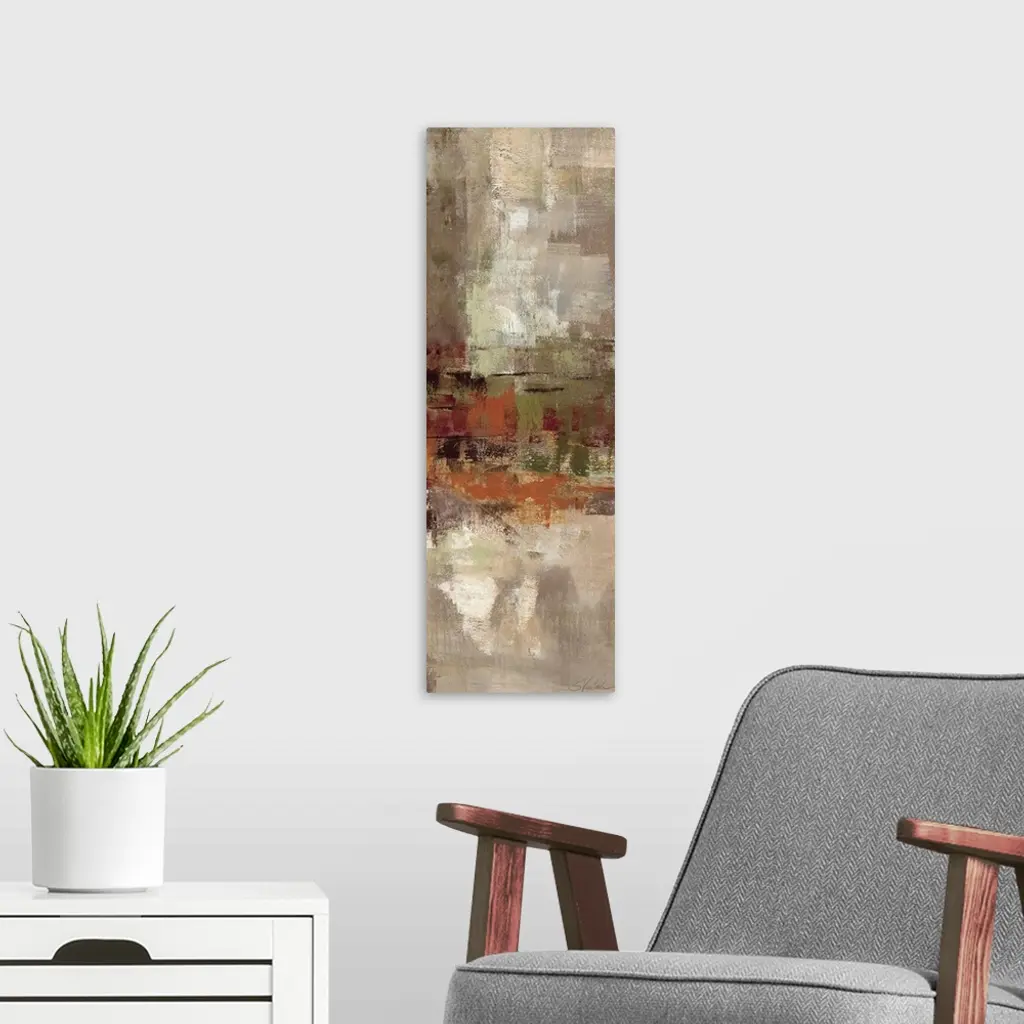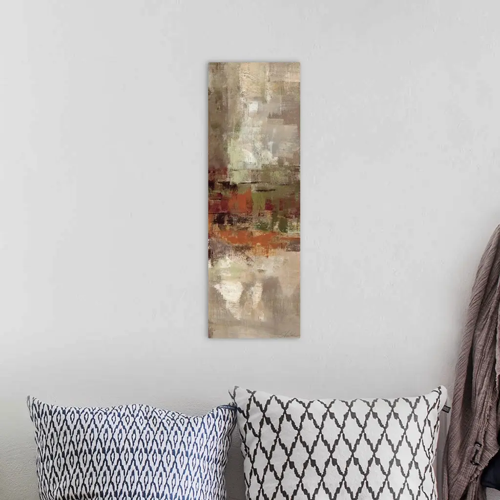 An abstract piece of art with brush strokes of earthy tones giving the painting depth.