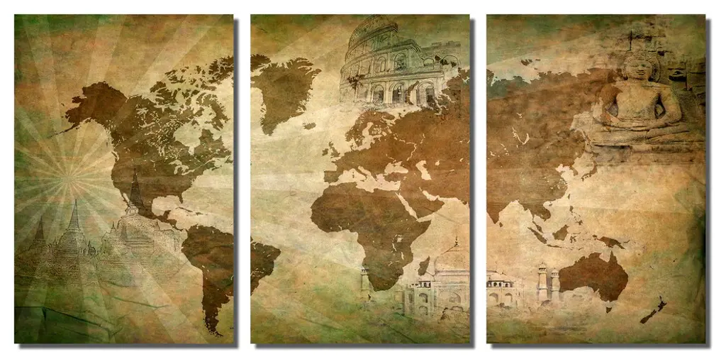 Landmark World Map, Metal Print, Wall Art, 3 Panel Split, Triptych, 72x36