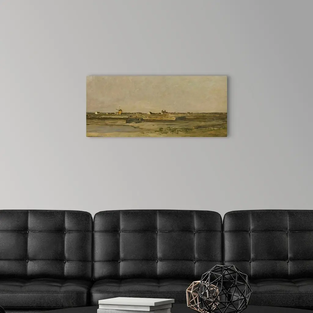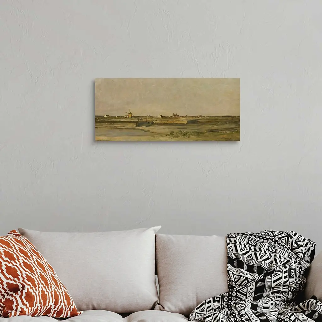 Landscape, by Charles Fran?ois Daubigny, 1840-78, French painting, oil on panel. Flat coastal plain with a windmill and distant village.