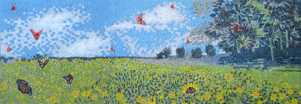 Transform your space into a serene oasis with our Landscape Mosaic - The Butterfly Field. This exquisite handcrafted piece captures the essence of nature, allowing you to enjoy a unique décor item that breathes life into any room. The beautiful design features a picturesque green field teeming with vibrant sunflowers, set against a backdrop of a cloudy blue sky. As you gaze upon this stunning mosaic, you’ll find yourself immersed in its vivid colors and realistic details, reminiscent of a peaceful summer day. The graceful orange butterflies fluttering throughout the landscape add a whimsical touch, creating an inviting and eye-catching focal point for your home or office. Crafted with care and precision from premium quality natural stone, this mosaic is a statement piece that reflects your appreciation for the beauty of nature and luxury stone artistry. The luminous Prisma Yellow Quartz and radiant Orange Quartz bring scintillating warmth and jewel-like brilliance to the sunflowers and butterflies, while the aqua blue quartz infuses the cloudy sky with a soothing, translucent brilliance. Subtle hints of light red quartz add a soft, prismatic glow that enhances the overall composition with sophisticated depth and vibrancy. This artwork is perfect for adding warmth and charm to living rooms, bedrooms, or any area that could use a splash of color and tranquility. Bring the outdoors in and create a comforting ambiance with our Landscape Mosaic - The Butterfly Field. Ideal for nature lovers and art enthusiasts alike, this captivating piece of exotic materials serves as a daily reminder of the beauty that surrounds us. Elevate your interior décor and experience the transformative power of handcrafted, premium quality natural stone art with this one-of-a-kind mosaic.