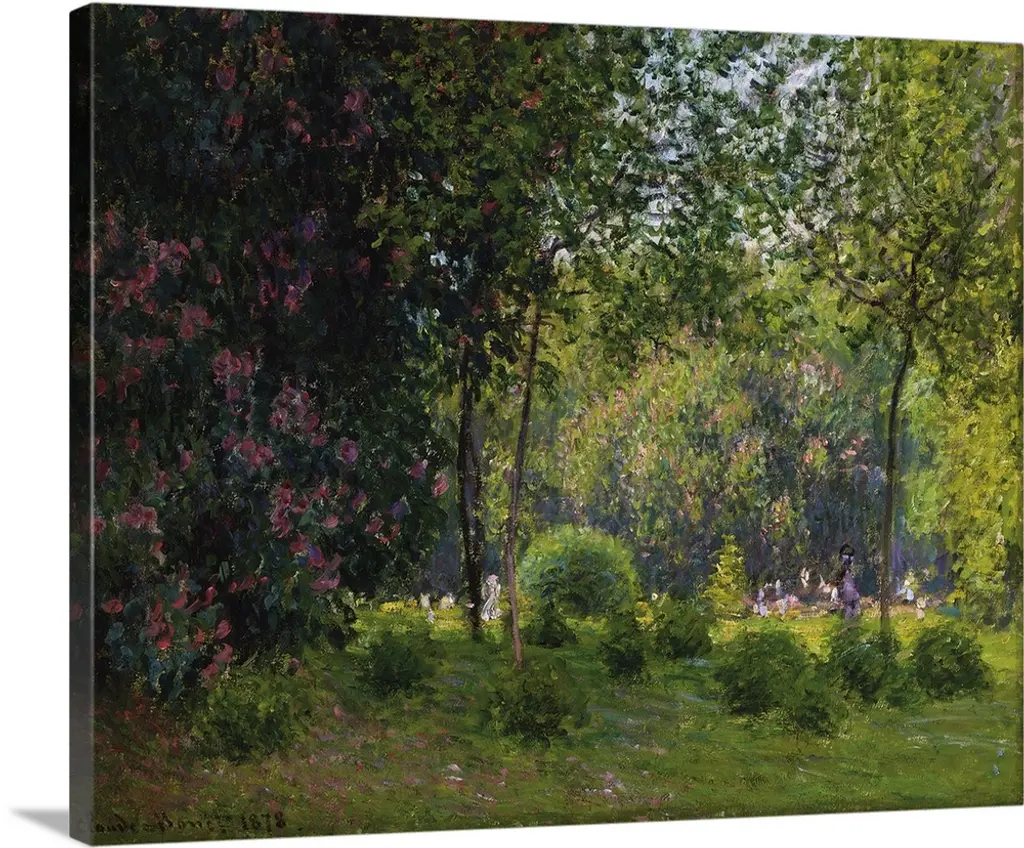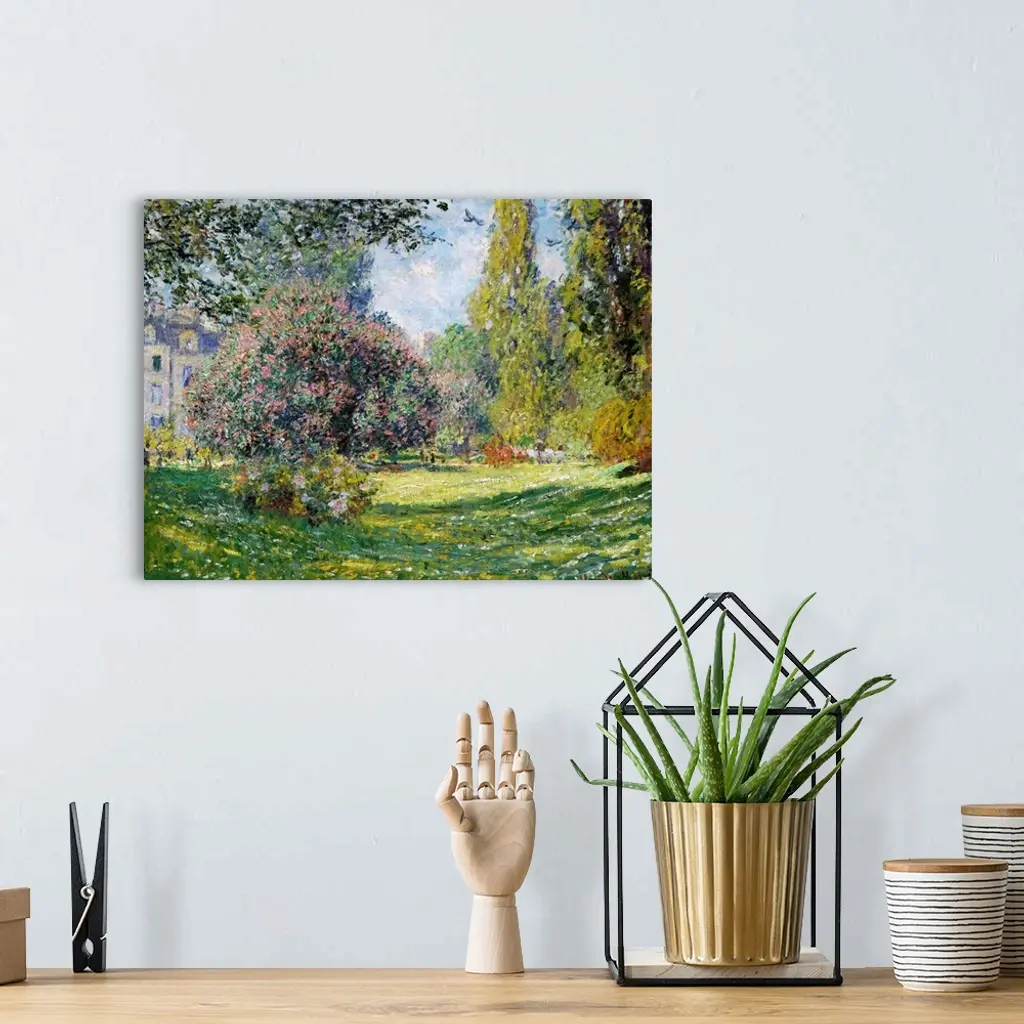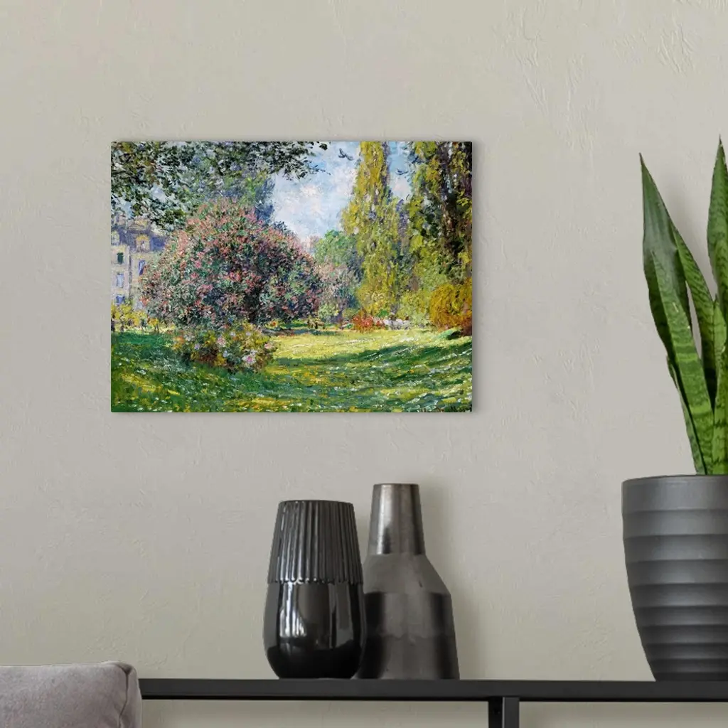 Situated on the boulevard de Courcelles in Paris and surrounded by fashionable town houses, the Parc Monceau was planned in the late eighteenth century in the form of an English garden. Monet painted three views of the park in the spring of 1876. This one, shown at the 1877 Impressionist exhibition, focuses on the swaths of green grass and blooming trees. The building visible at left in this painting also appears in two works from 1878, including one in the Museum's collection.