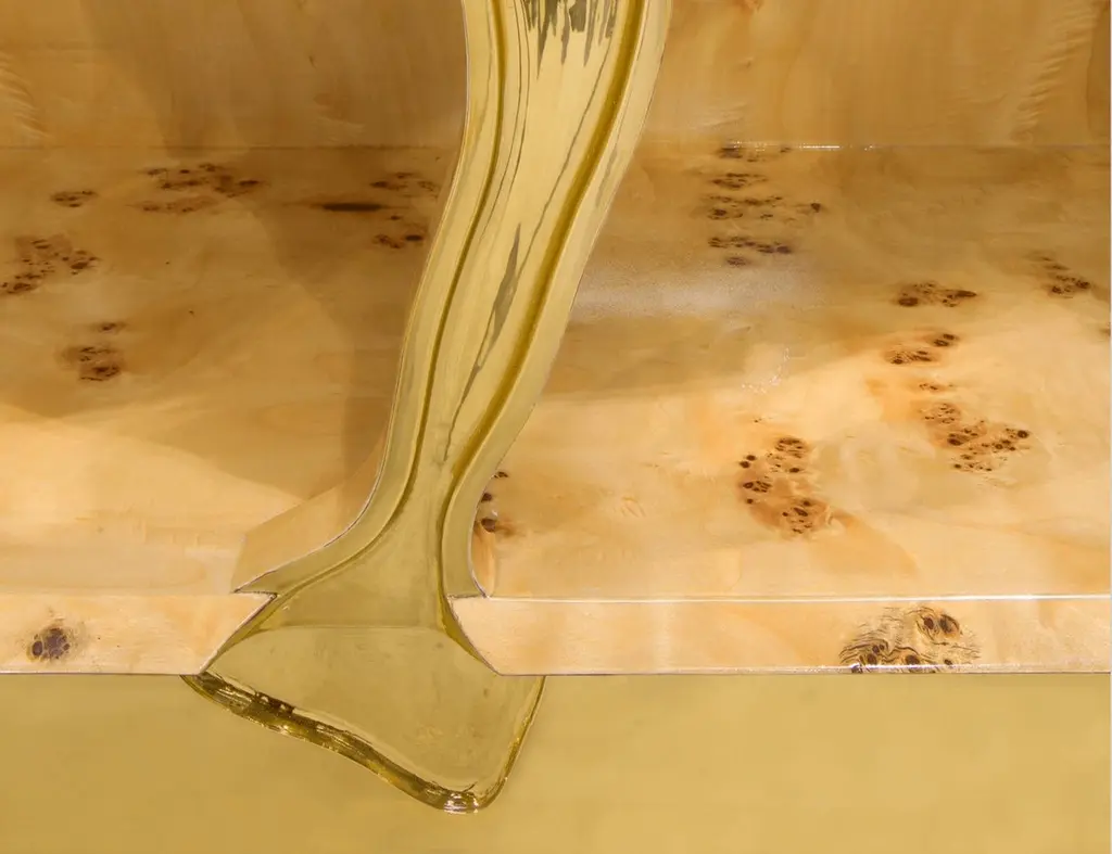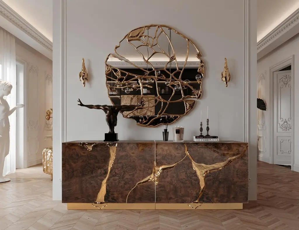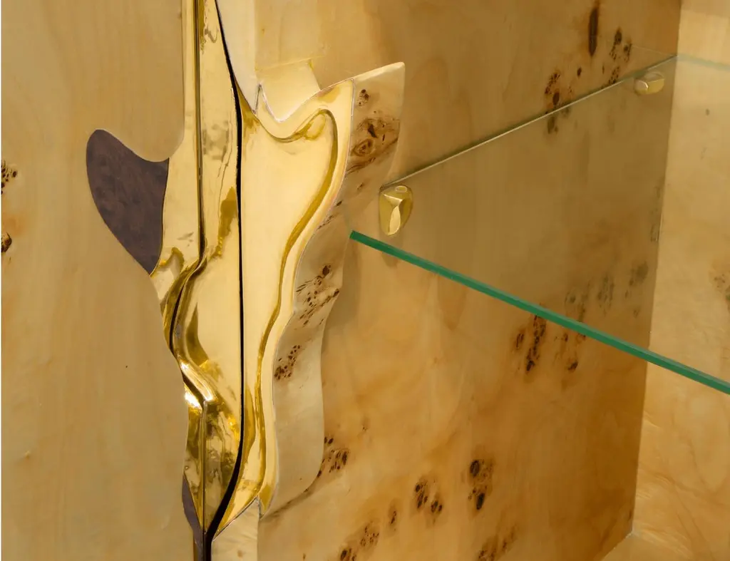 Lapiaz sideboard takes exceptional craftsmanship and design to a new realm. Finding beauty in the most unexpected places, this contemporary design piece is inspired by authentic karst formations. Its organic features are achieved through the manual fitting of polished brass, and a sharp finish in polished stainless steel that portrays a perfect mirror. Different-shaped doors and drawer open to a distinct poplar root wood veneer interior. The hammered gold details and the mirrored façade conveys both dynamics and elegance, a beautiful duality between power and refinement to bring a new contemporary verve into interior design. A functional artwork piece born from cold and freshly cracked to showing off the world rich, golden details.