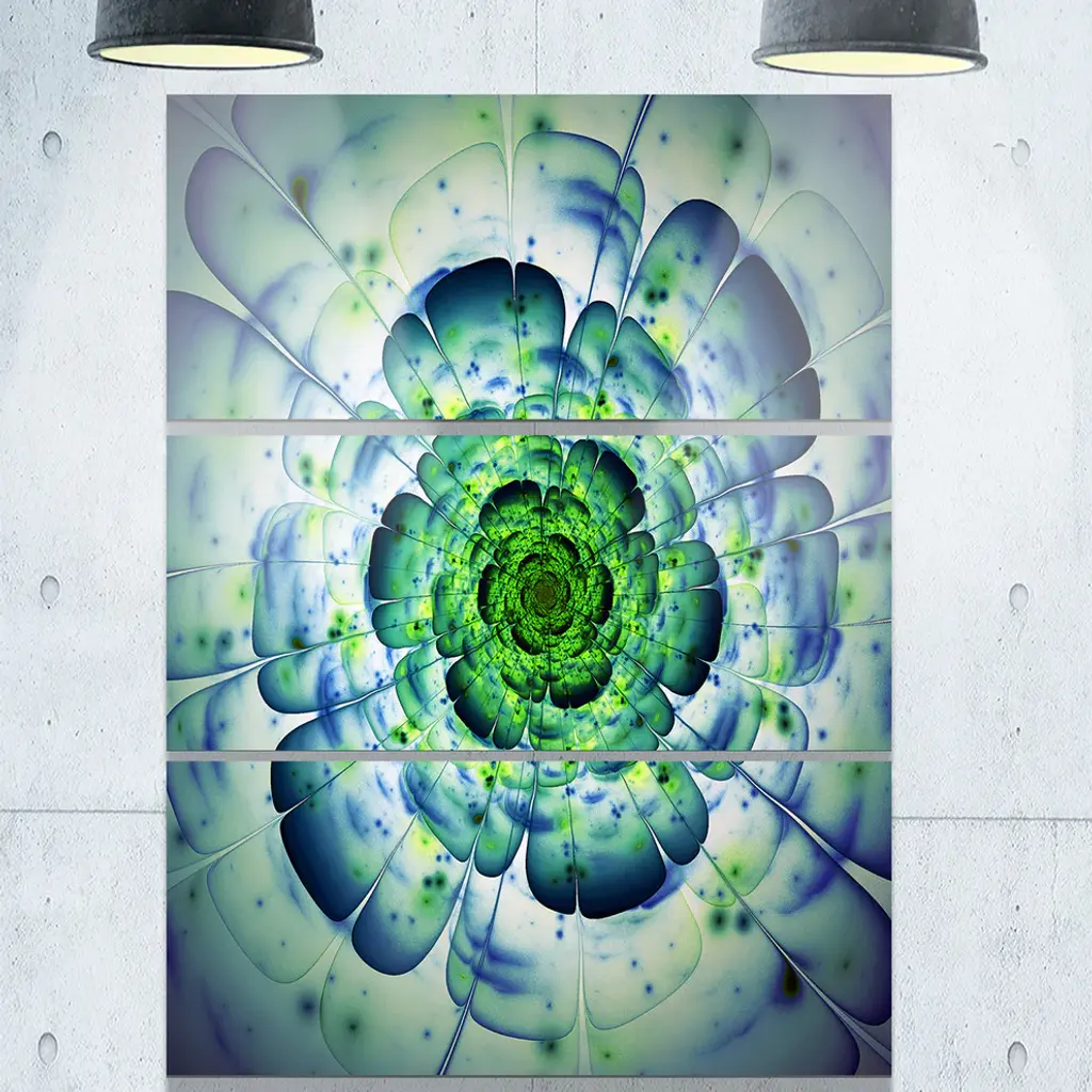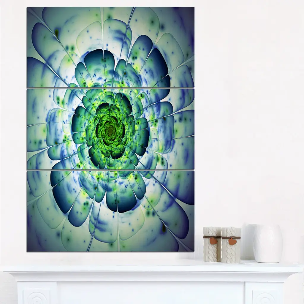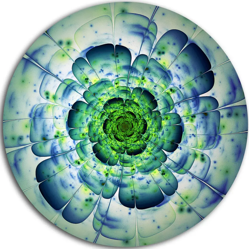 Bring contemporary abstraction to your home with this large 28W x 36H Metal Wall Art. This Large Blue Mandala Fractal Flower Metal Artwork makes it the focal point of any room or office. - White gloss coating ensures colors are extra vibrant with light reflection.- Aluminum grade sheet metal with 1-inch mounting frame on the back giving the illusion that the artwork is floating on the wall.- Mounting brackets are included along with instructions.- High quality digital images are created directly into a glossy aluminum panel producing a stunning and captivating print into the glossy finish of the metal.- Water, fire and scratch resistant HD aluminum panels.- Looks better than any photo paper and guaranteed to last at least 20 years- Easy to clean with a microfiber cloth. Colors are far superior to regular canvas art. - Easy to hang