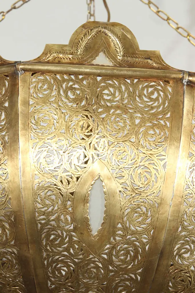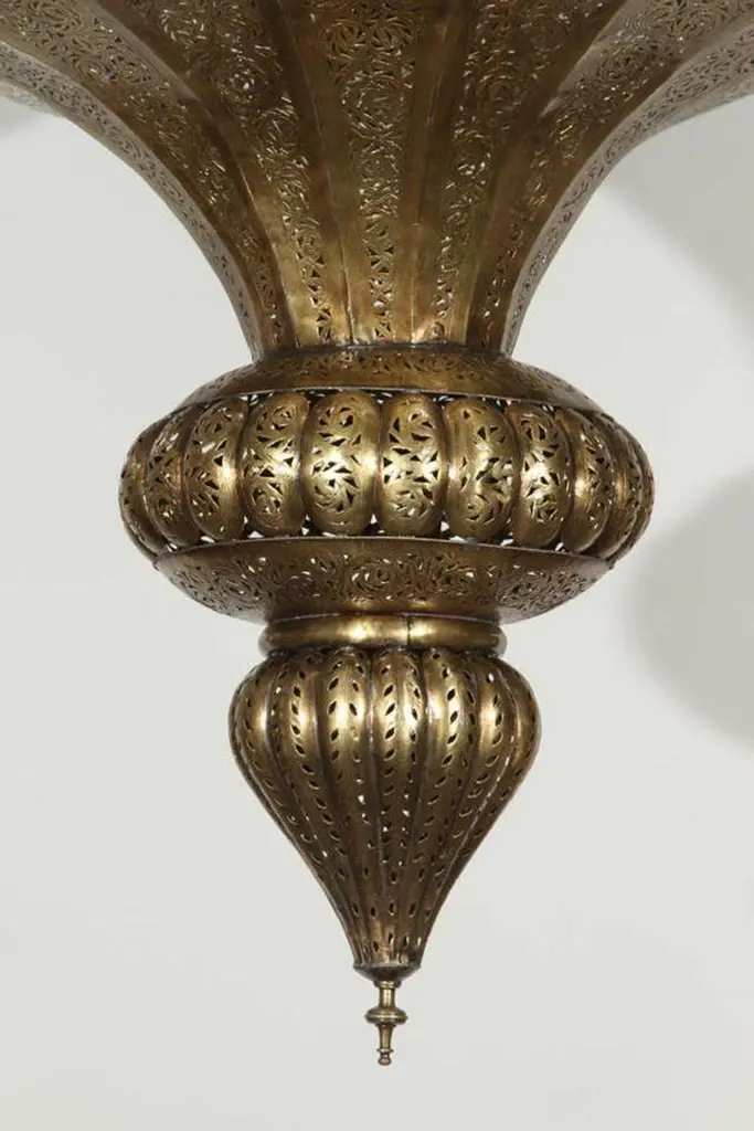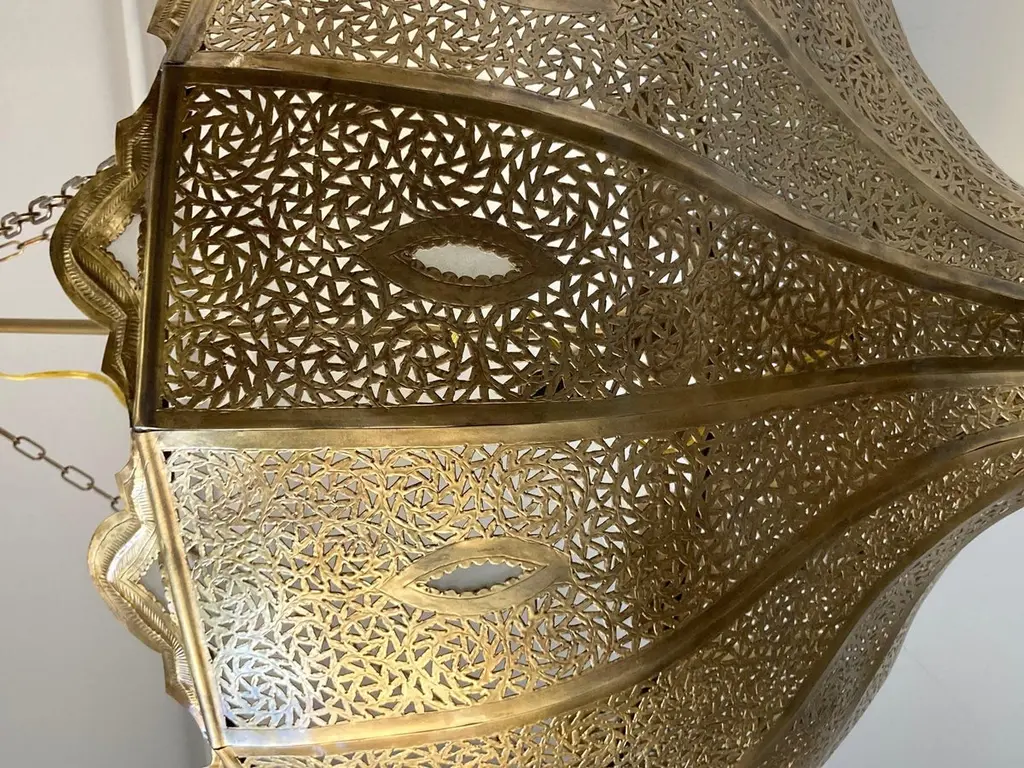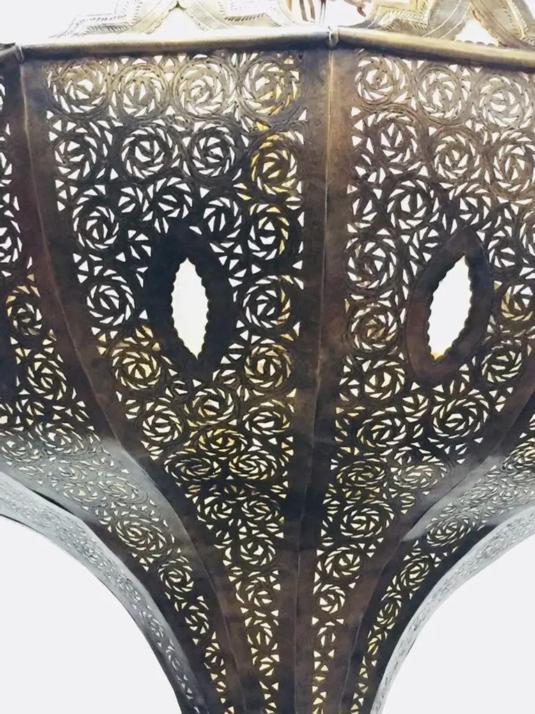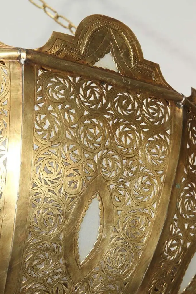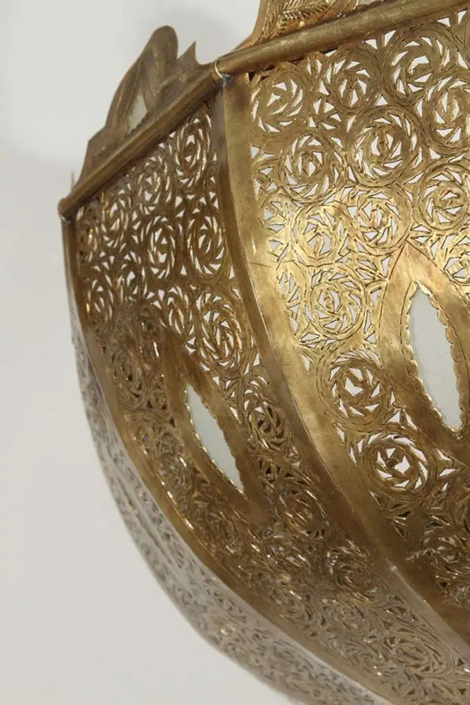 Oversize exquisite filigree openwork brass Moroccan Moorish chandelier in Alberto Pinto style.This exquisite Moroccan light fixture is delicately handcrafted and chiseled with fine metal filigree openwork design and adorned with milky glass.Moorish bronze patina finish, finely hand-cut and hand-chased openwork brass filigree with Islamic design.Measure: 47" total height within the top of the 3 chains, 33" height of body of the lamp x 31" diameter.Rewired for electricity in the US.Great patinaA pair is available price is for one.The chandelier is light it weight approximately 30 lbs.Very delicate brass metal artwork in Islamic Moorish Andalusian filigree.Handcrafted in Marrakech Morocco by skilled artisans.Circa 1980s.