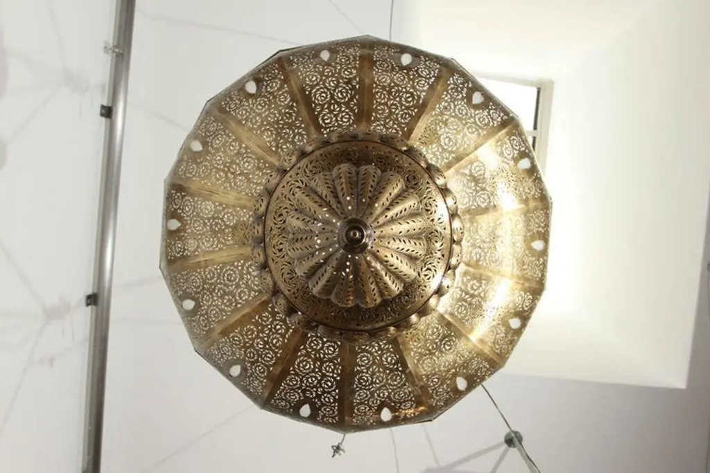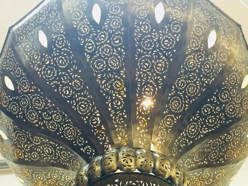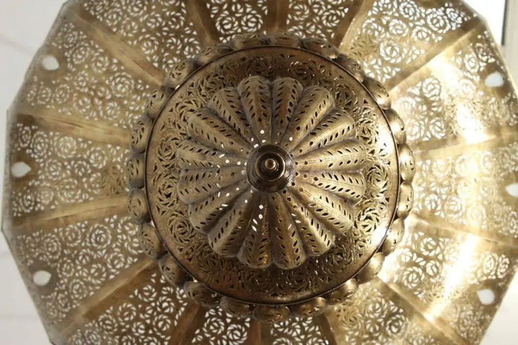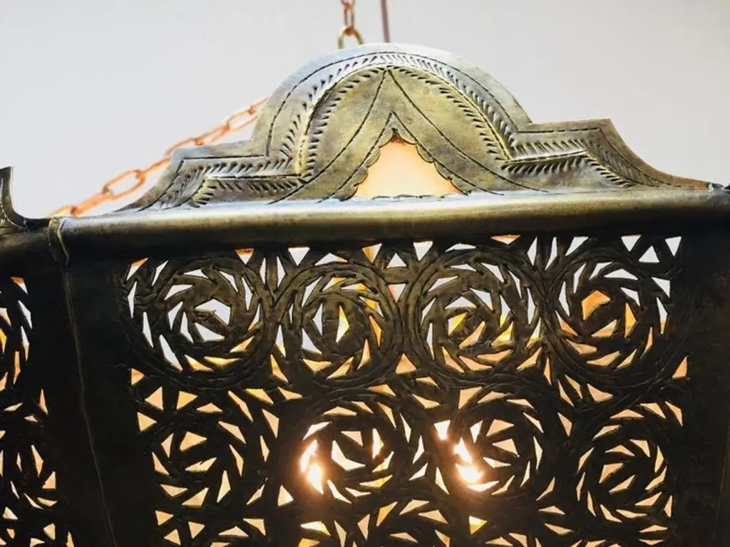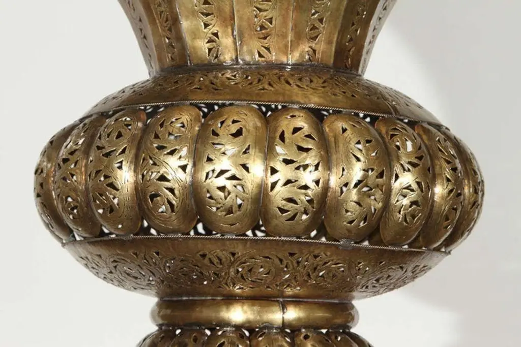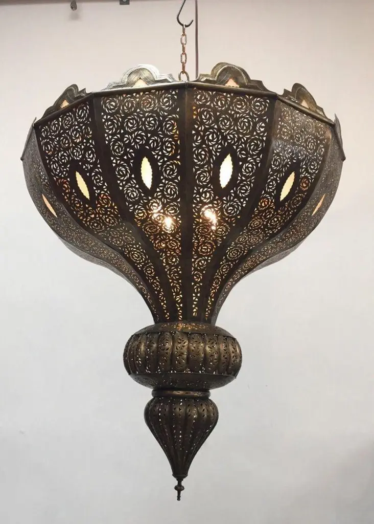 Oversize exquisite filigree openwork brass Moroccan Moorish chandelier in Alberto Pinto style.This exquisite Moroccan light fixture is delicately handcrafted and chiseled with fine metal filigree openwork design and adorned with milky glass.Moorish bronze patina finish, finely hand-cut and hand-chased openwork brass filigree with Islamic design.Measure: 47" total height within the top of the 3 chains, 33" height of body of the lamp x 31" diameter.Rewired for electricity in the US.Great patinaA pair is available price is for one.The chandelier is light it weight approximately 30 lbs.Very delicate brass metal artwork in Islamic Moorish Andalusian filigree.Handcrafted in Marrakech Morocco by skilled artisans.Circa 1980s.