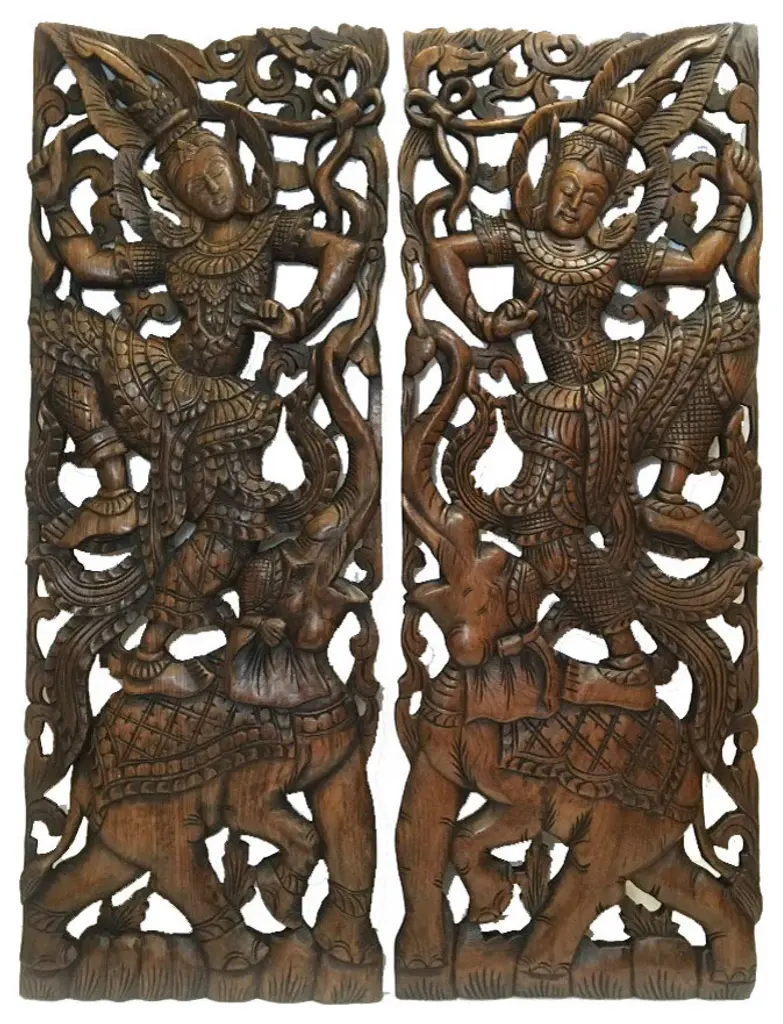 Large Carved Wood Panel. Oriental Home Decor. Decorative Thai Wall Relief Panel Sculpture. Wood Carved Wall Decor Traditional Thai Dance Figure and Elephant Design Dark Brown Finish 35.5"�x13.5"�x1" Each, Set of 2 pcsCarved wood wall art Thai traditional dance on elephants are a favorite. They are sold as a pair and provide you with twice the appreciation of carved wood craftsmanship. A really unique exhibition of creative wall art!SIZE • WEIGHT • COLOR• MATERIAL (Each)Height: 35.5" InchesWidth: 13.5" InchesThickness: 1" InchesWeight: 7.3 lbs.Color: Dark BrownMaterial: Teak Wood• Please note that you may see a slight difference in color as compared to that seen on your computer screen. Also, since most products are handmade and they are crafted from natural wood, there may be a slight size variation. Wood texture is hard and durable. Being used for furniture, carving, exterior construction etc. Teak wood is ideal quality material for carving these treasures. Our exotic handmade wall pieces will bring warmth and character to any room in your home!