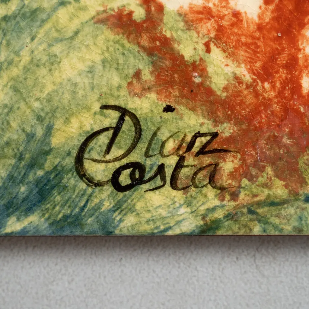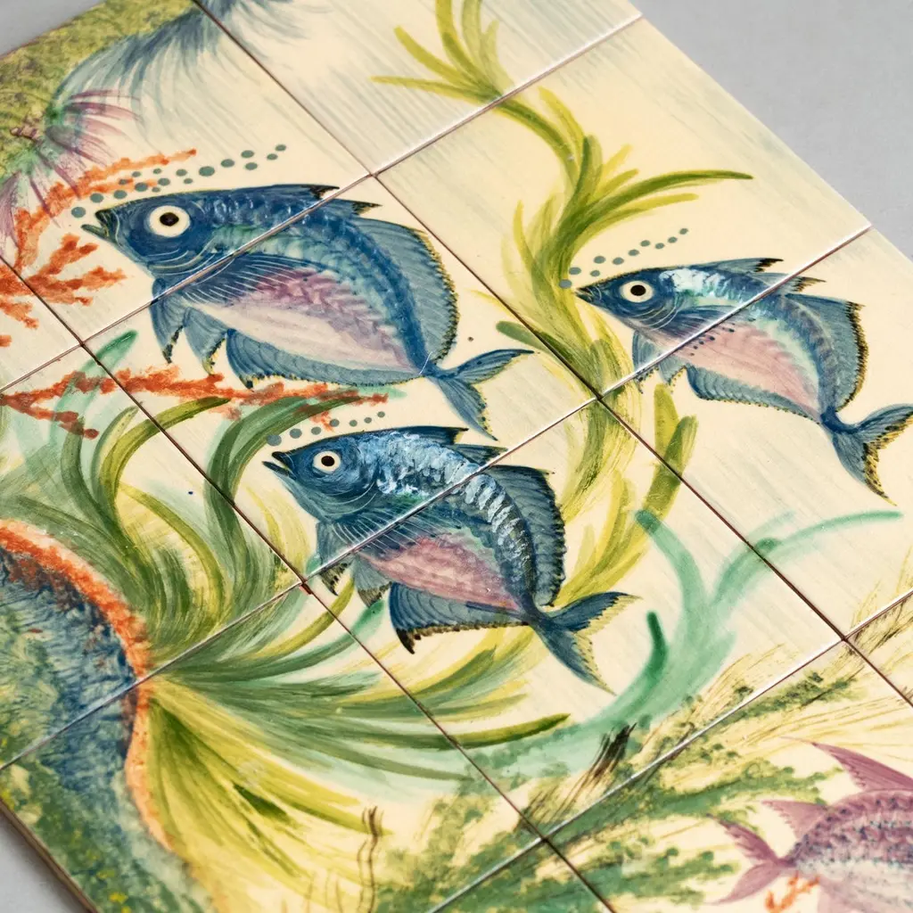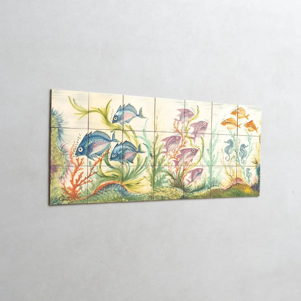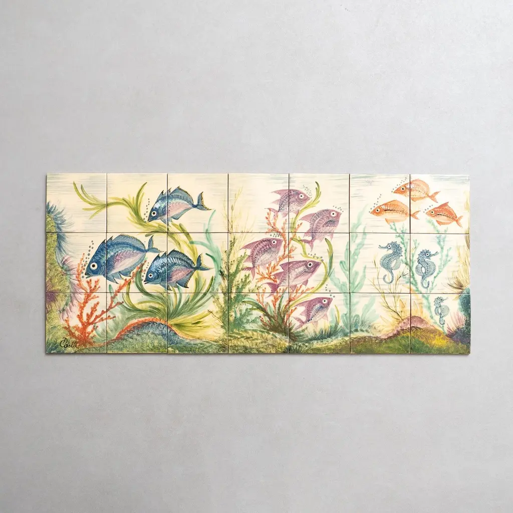 Dive into the mesmerizing world of Catalan artist Diaz Costa with this captivating ceramic hand-painted large artwork featuring a school of fishes, a masterpiece from around 1960. Adorned with the artist's signature, this exquisite piece is a testament to the skill and creativity of Diaz Costa.In its original condition, the artwork showcases a charming patina that adds character, with minor wear that tells the story of its age and the admiration it has garnered over time. The meticulous hand-painted details bring the underwater scene to life, making it a striking focal point in any space.The unique presentation of the tiles, which come separated and not attached, adds an element of flexibility in displaying this remarkable artwork. Each tile tells a part of the artistic narrative, allowing for a customizable arrangement that suits your aesthetic preferences.Immerse yourself in the timeless allure of Diaz Costa's creation – a harmonious dance of color and form that invites you to appreciate the beauty of the underwater world. This ceramic artwork is not just a visual delight but a testament to the enduring legacy of a talented artist.