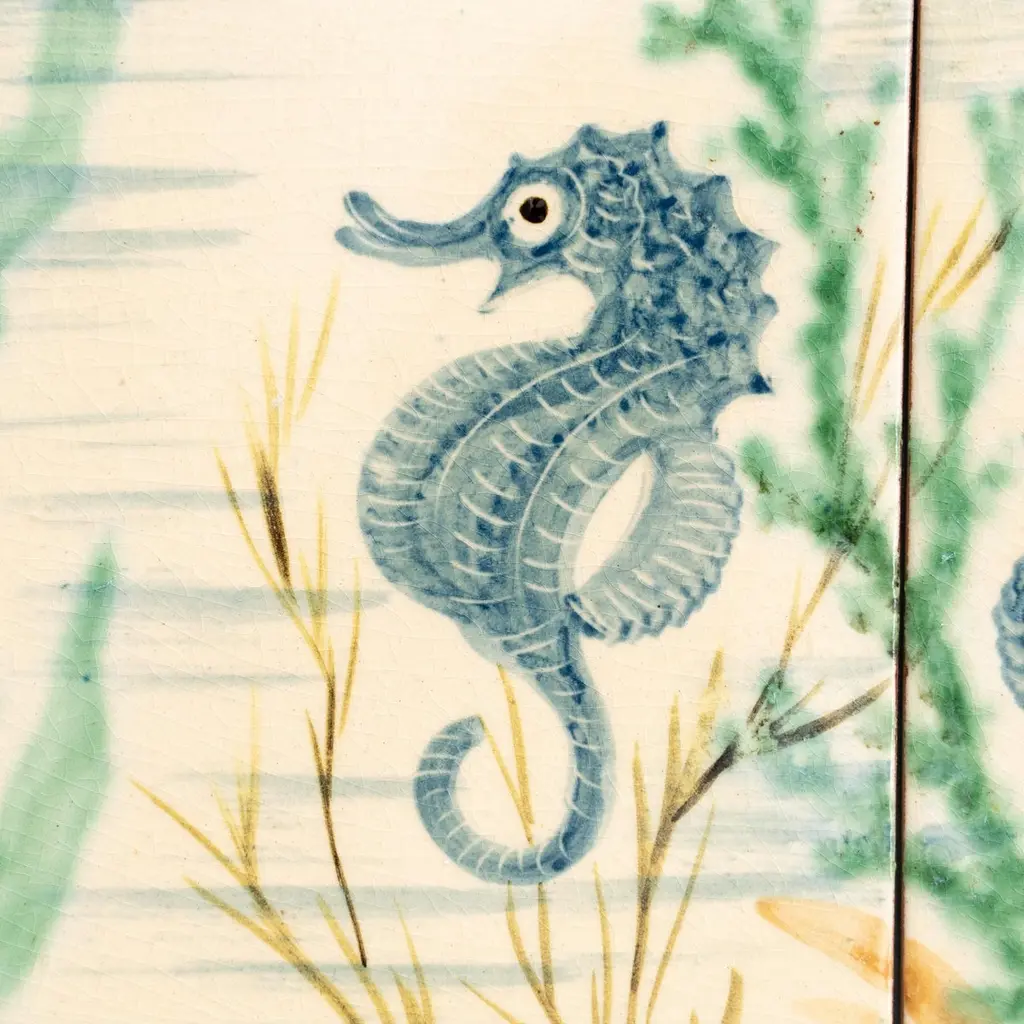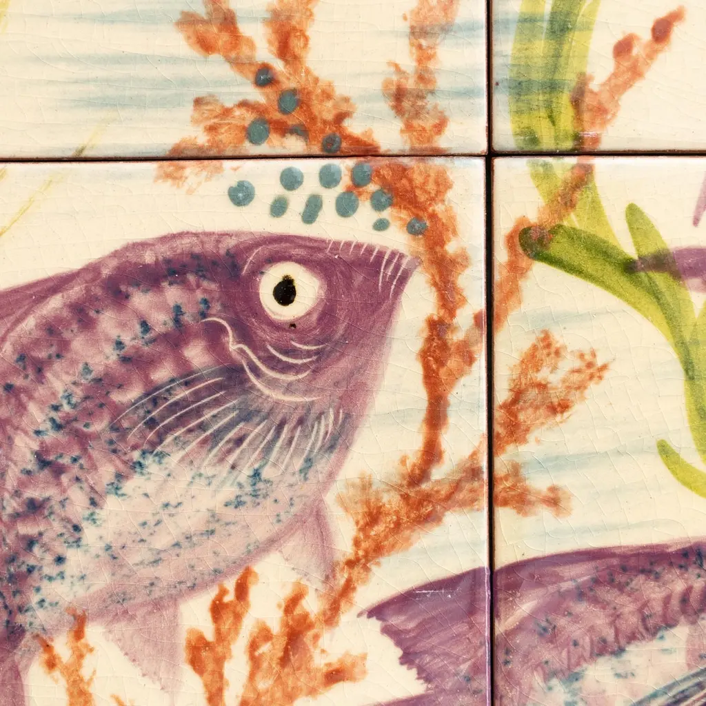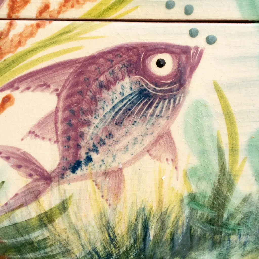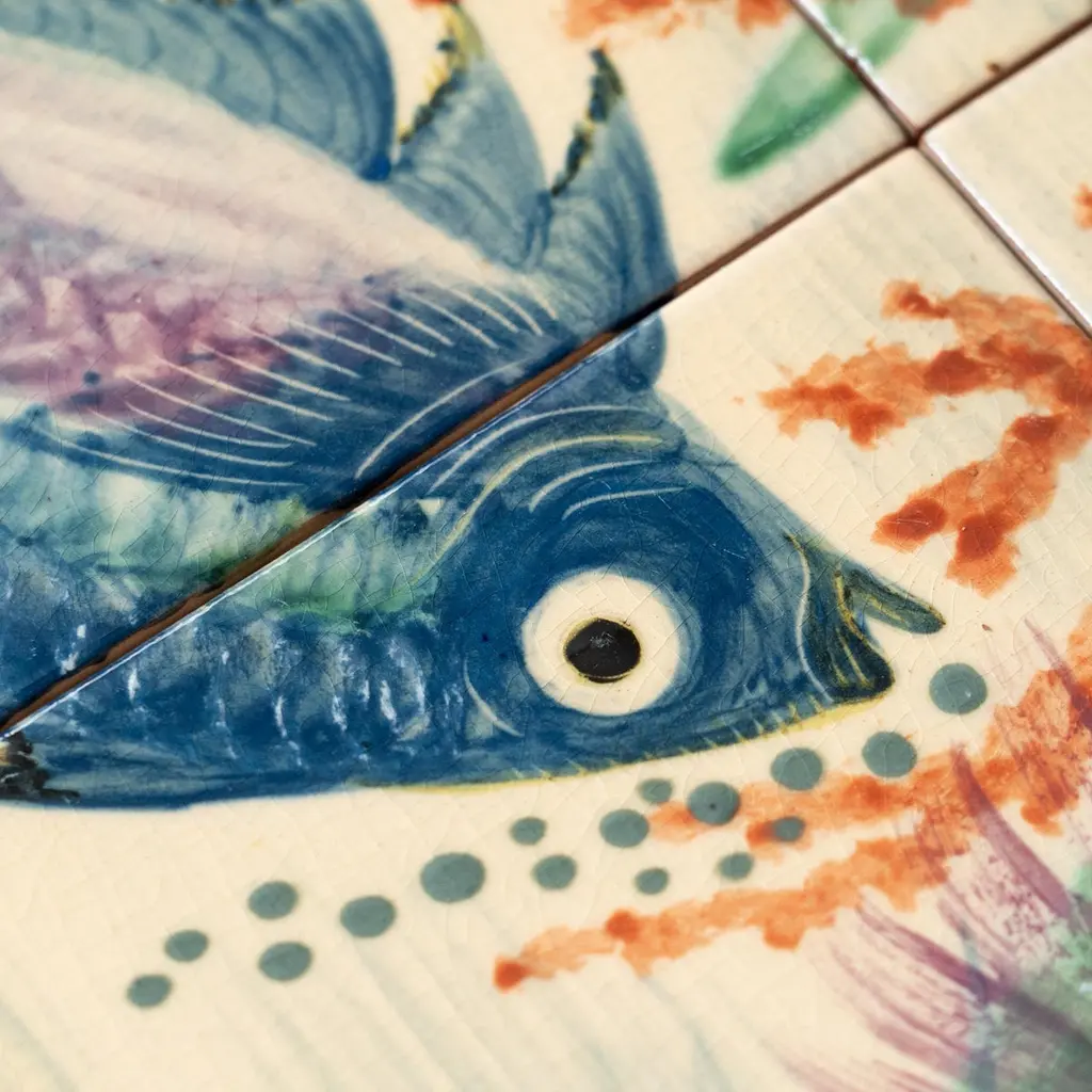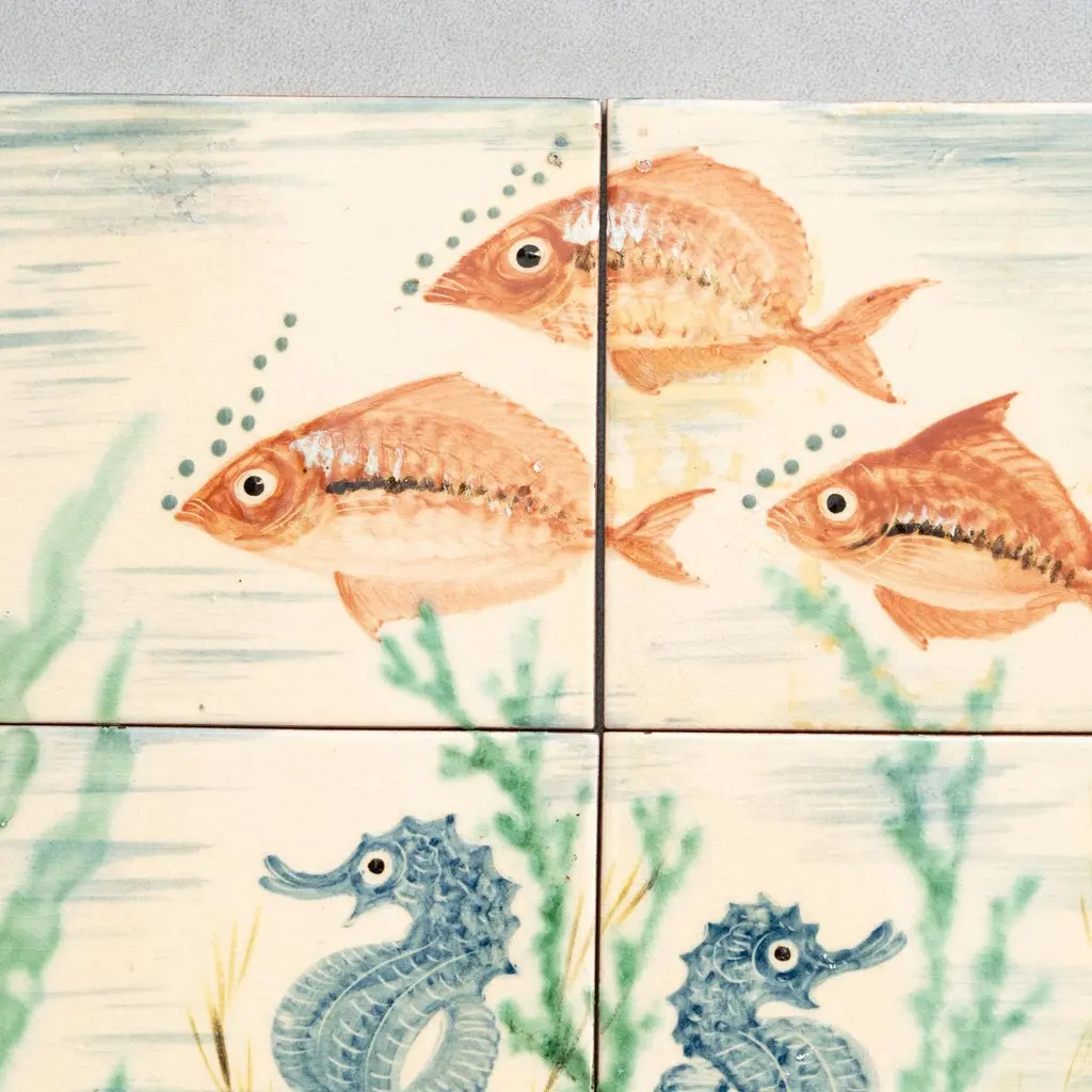 Dive into the mesmerizing world of Catalan artist Diaz Costa with this captivating ceramic hand-painted large artwork featuring a school of fishes, a masterpiece from around 1960. Adorned with the artist's signature, this exquisite piece is a testament to the skill and creativity of Diaz Costa.In its original condition, the artwork showcases a charming patina that adds character, with minor wear that tells the story of its age and the admiration it has garnered over time. The meticulous hand-painted details bring the underwater scene to life, making it a striking focal point in any space.The unique presentation of the tiles, which come separated and not attached, adds an element of flexibility in displaying this remarkable artwork. Each tile tells a part of the artistic narrative, allowing for a customizable arrangement that suits your aesthetic preferences.Immerse yourself in the timeless allure of Diaz Costa's creation – a harmonious dance of color and form that invites you to appreciate the beauty of the underwater world. This ceramic artwork is not just a visual delight but a testament to the enduring legacy of a talented artist.