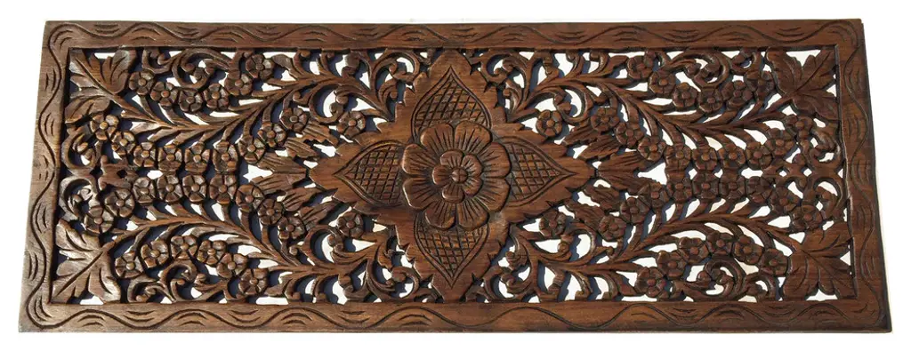 Asian large Wood Carved Panels. Perfect for large wall decoration. Floral wall art that will add beauty to any room. This carved wood plaque can be used as headboard, cabinet doors, vanities, window screen that will add beauty to your home. Made from teak wood. A product of Thailand that expresses a wonderful home decorative ambiance.