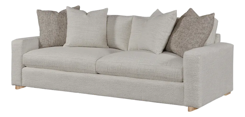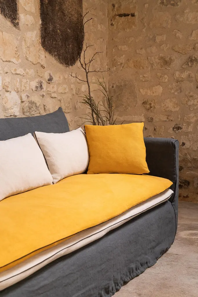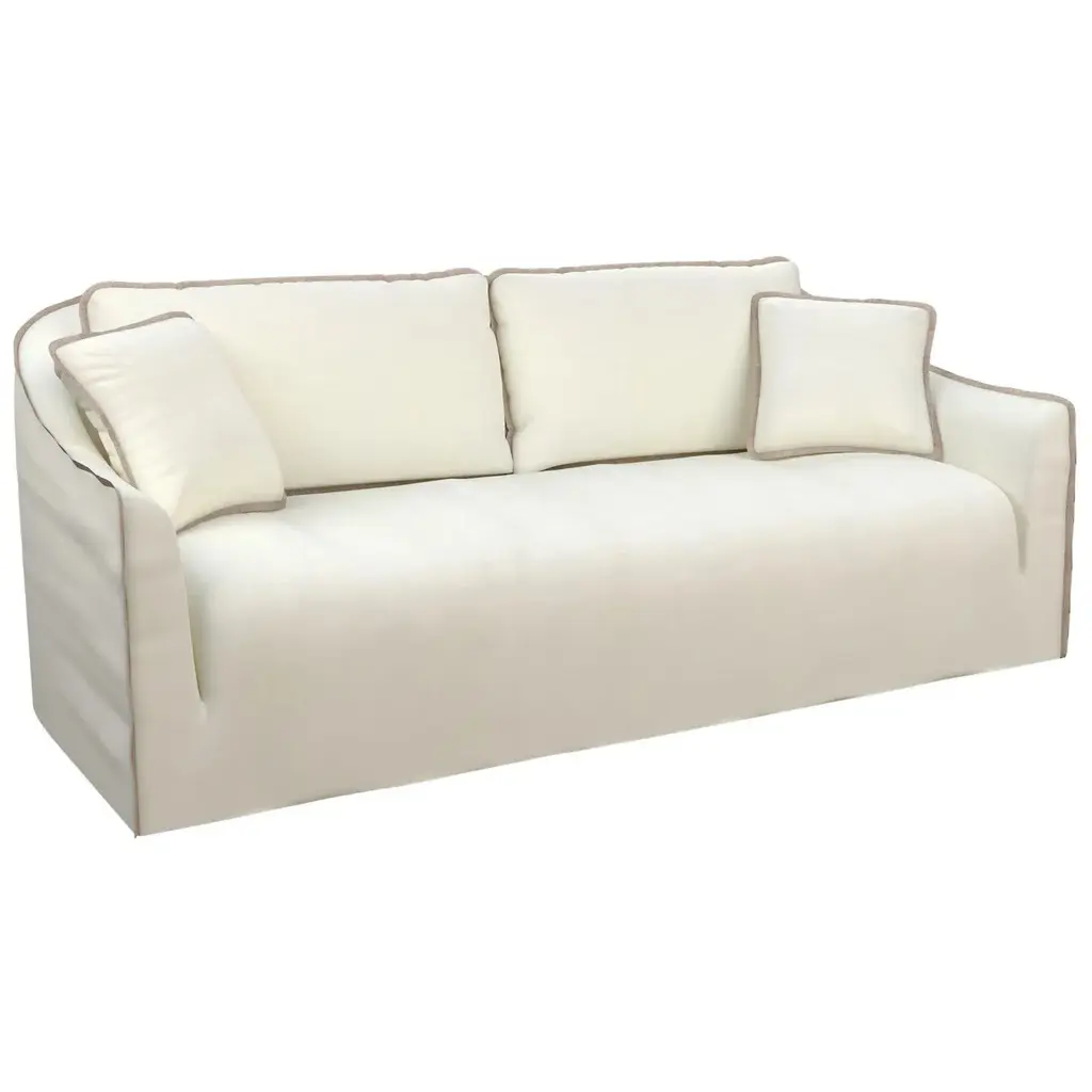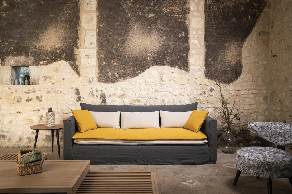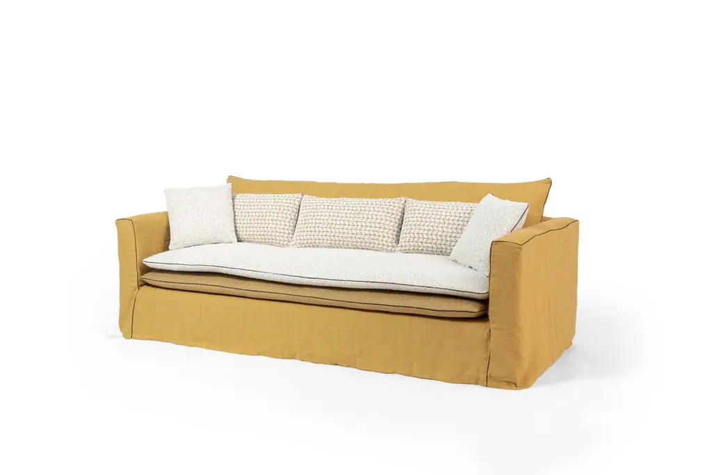 Large Massai Sofa by RALPH MDimensions: W 230 x D 103 x H 85 cm. Materials: Solid beech, Particle board panels, Fabric.Details: Frame: Solid beech and particle board panels.Seat springing: Interlaced elastic webbing.Seat cushion: 2 reversible duvets in a mixture of feathers + silicone hollow fiber.Back cushions: filled with feathers & siliconized fibre in a compartmentalized percale cotton case. Lumbar support qty : 3 (2300 mm) - 2 (2000 mm)Finish: Piped or satin stitch.Feet: Solid beech.Ralph M:In its French workshop, Ralph M. creates and crafts personalisable top-quality sofas and armchairs. A bold challenge. And one achieved successfully for more than 30 years. The Ralph M. team fulfils the essential challenge of the Made in France label: guaranteed quality through the ability to combine the best materials with expertise and open-minded flexibility.For more than 30 years, Ralph M. has used its expertise and attention to detail in creating pieces that draw on the latest trends in furniture. But they also enjoy exercising their own bold originality. In fact, they like it so much that they always want to go further in asserting their unique aesthetic.The new RALPH M. range embodies their desire to take creative risks and enhance the standard pieces of the furniture repertoire by revisiting them.They believe that design is as valid an artistic expression as literature, painting and music. The RALPH M. brand makes everything possible. It is in many ways our laboratory in which luxury, comfort and good design come together to create timeless pieces with their own distinct identity.
