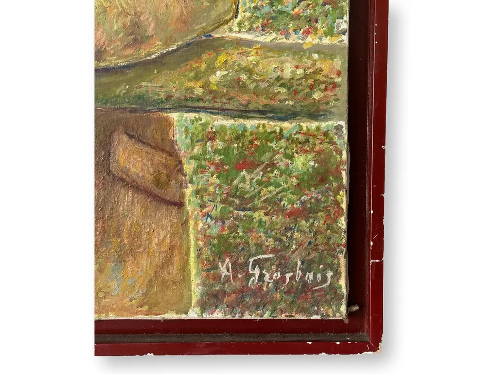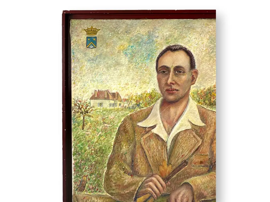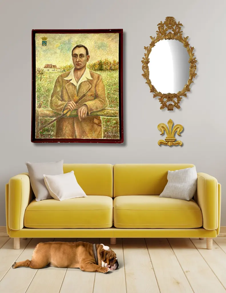 Capture a slice of French nobility with this beautiful oil portrait of a French Marquis, dating back to a time of regal governance. The painting features an enigmatic nobleman poised with a walking stick, set against a pastoral backdrop hinting at his territorial influence. A subtle, yet distinguished family crest adorns the upper left, marking the Marquis' lineage. Signed by the artist in the lower right corner, framed as found. Ideal for collectors with an appreciation for French history.