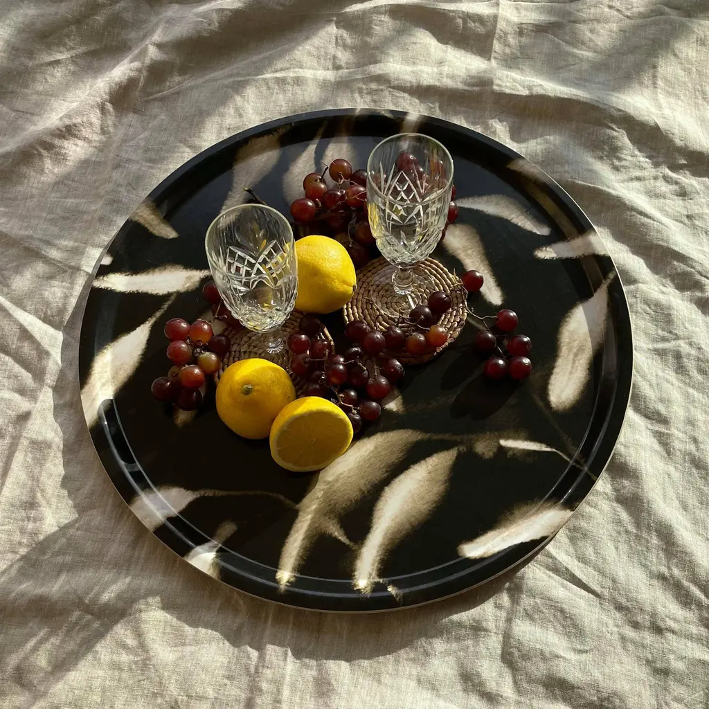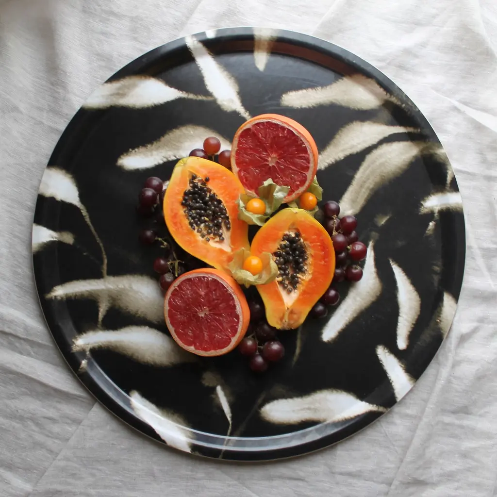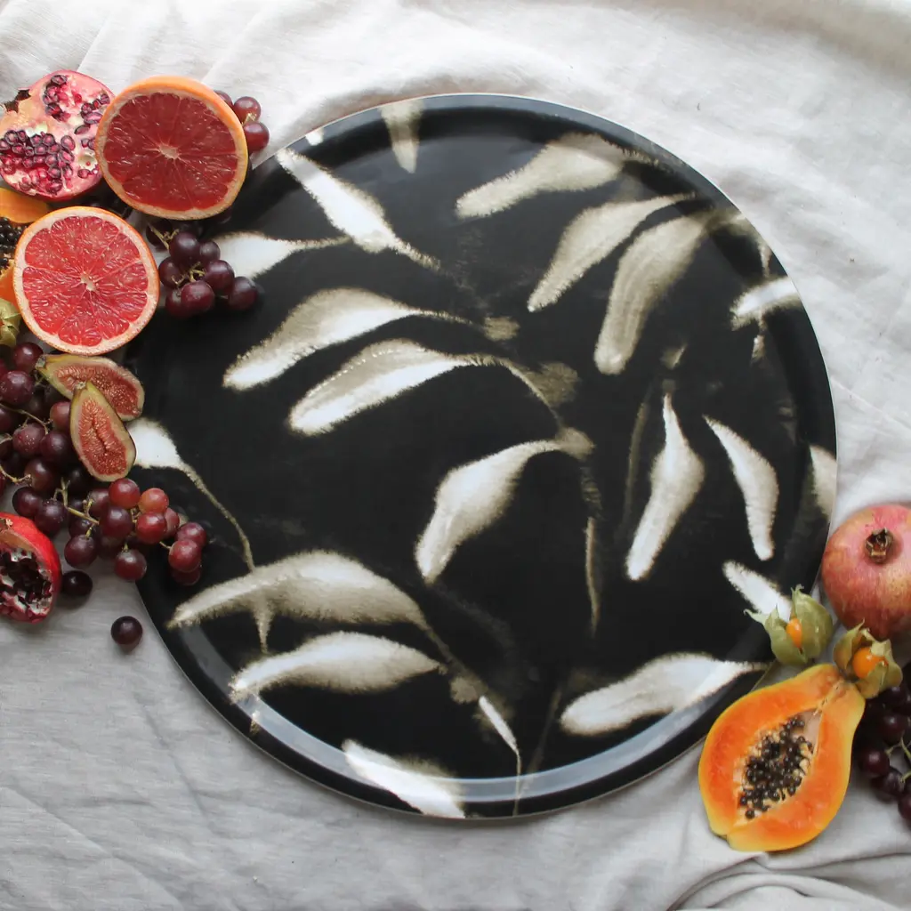 London artist Rosanna Corfe's original botanical painting is wonderfully translated onto this beautiful, round, wooden tray in Dark Gold.Style as a centrepiece on your coffee table with a vase of flowers and scented candle or use as a serving tray for your favourite drinks at your next party.This 45cm diameter, elegant, the large patterned tray will be a welcome addition to any living space!