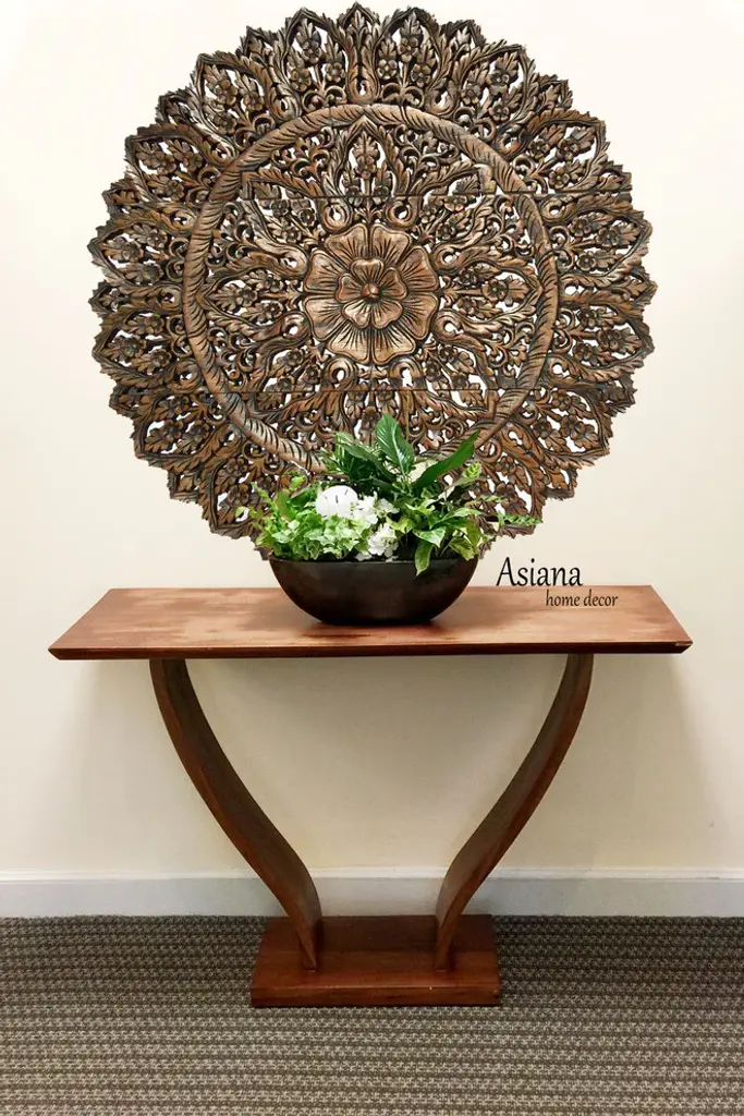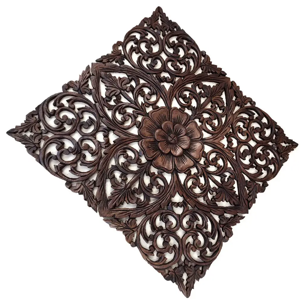 Large Round carved wood floral wall décor with center lotus flower. Tropical/Coastal large decorative carved wood wall art plaque. Perfect for large wall decoration. Floral wall art that will add beauty to any room. Creating luxurious decorative designs from traditional to contemporary home. Bring warmth and character to any room in your home. Made from teak wood. A product of Thailand that expresses a wonderful home decorative ambiance.36"x36" - 3 panelsSIZE • WEIGHT • COLOR• MATERIAL (Each panel)Height: 36.0" InchesWidth: 12.0" InchesThickness: 0.5" InchesWeight: 3.0 lbs.Material: Teak Wood