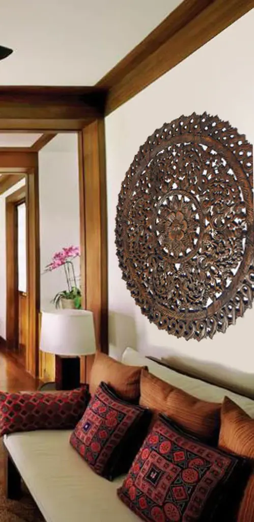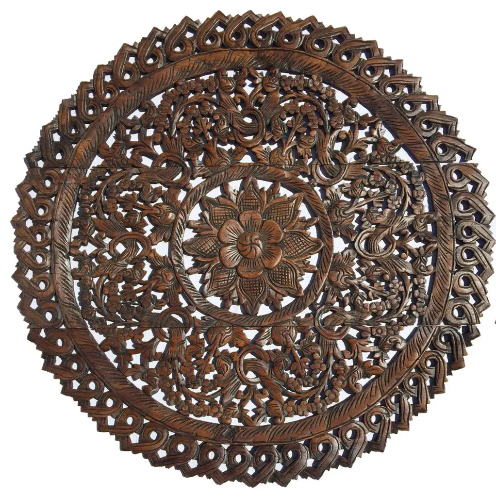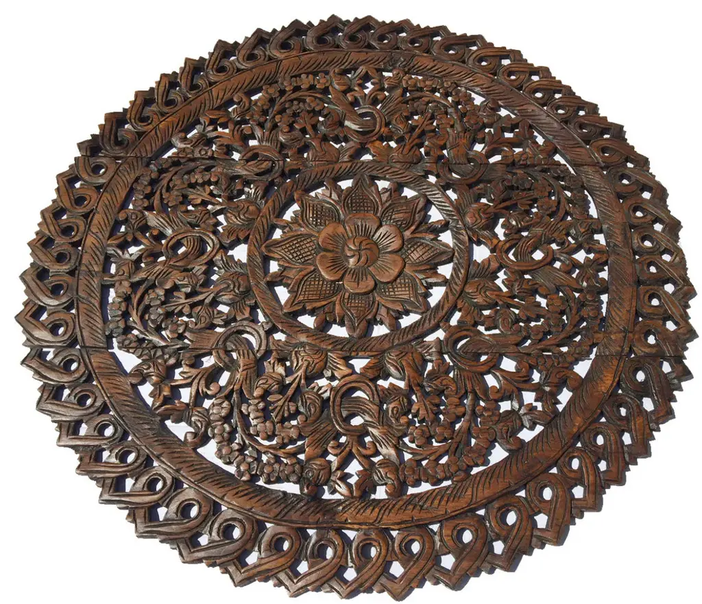 Set of 3 Large Wood Carved Panels. 3'' round carved wood sacred fig leaf Wall décor with center lotus flower. Asian/India Large decorative carved wood wall art plaque. Perfect for large wall decoration. Floral wall art that will add beauty to any room. Creating luxurious decorative designs from traditional to contemporary home. Bring warmth and character to any room in your home.Made from teak wood. A product of Thailand that expresses a wonderful home decorative ambiance. SIZE • WEIGHT • COLOR• MATERIALHeight: 36.0" InchesWidth: 36.0" InchesThickness: 0.5" InchesWeight: 4.0 lbs.Color: Dark BrownMaterial: Teak Wood