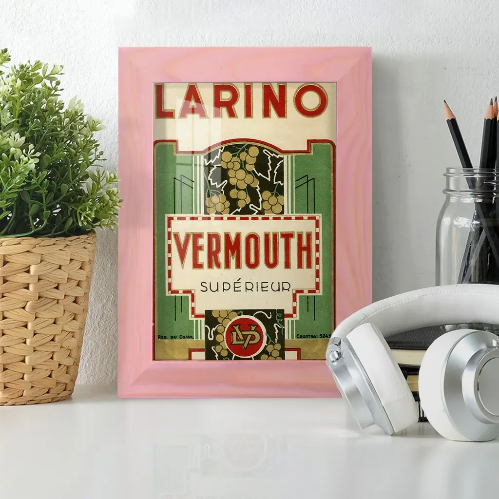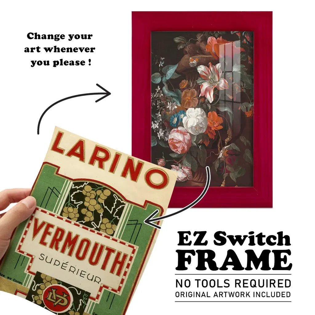Larino Vermouth -EZ SWITCH Framed Print w/glass-Cherry Red A delightful, framed print. Featuring a solid wood frame with real wood glass. This premium print is giclee quality. In addition, every frame features a removable back and table top stand. This allows you to change your art in the future or to just stand the art on a table for a new look. We are sure you'll enjoy our new series of EZ SWITCH Framed Art. Solid Wood Frame Real Glass Removable / Replaceable Art Built in Tabletop Stand Sizes range from 4x6 up to 12x15 - buy just one or pair them up as sets as you see fit.