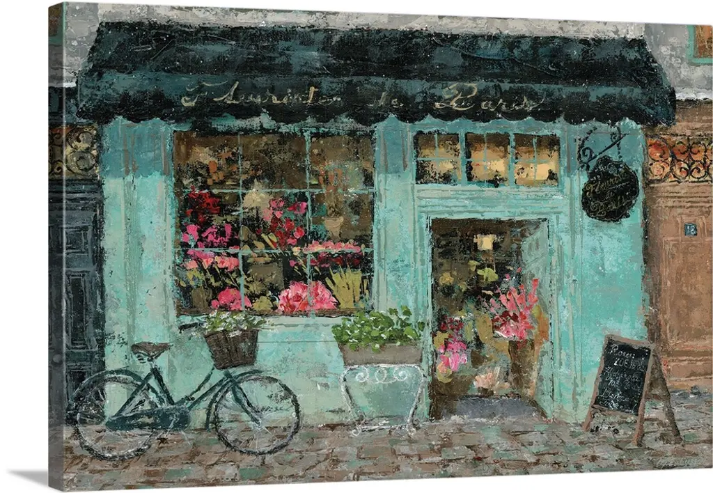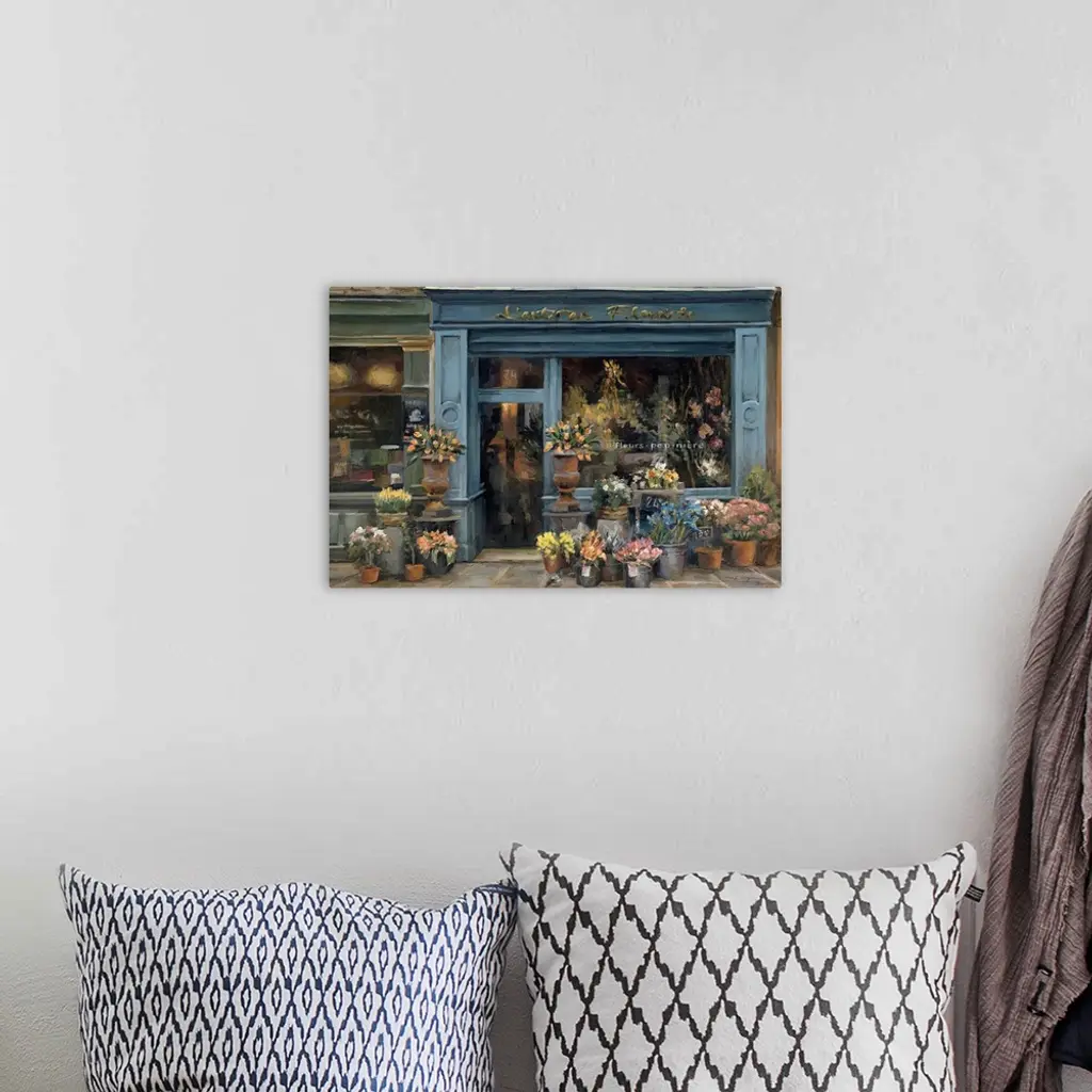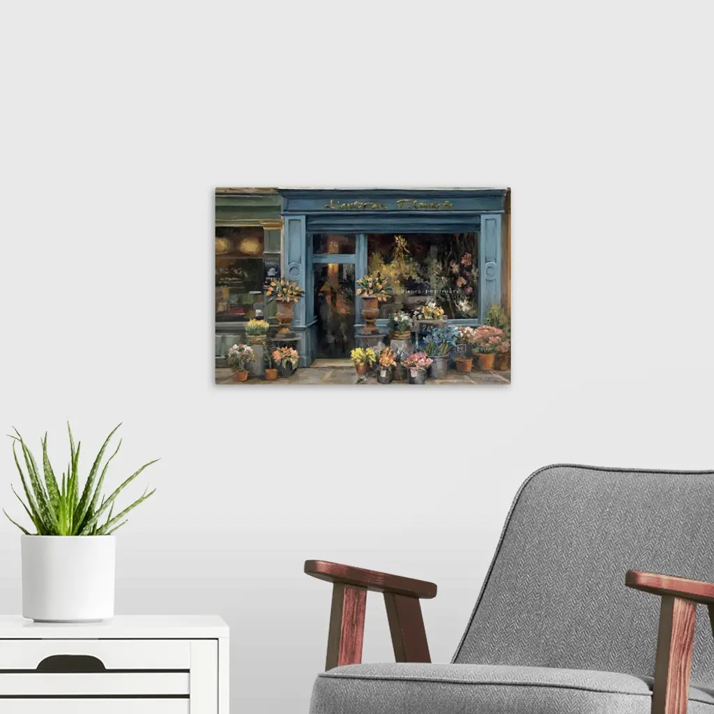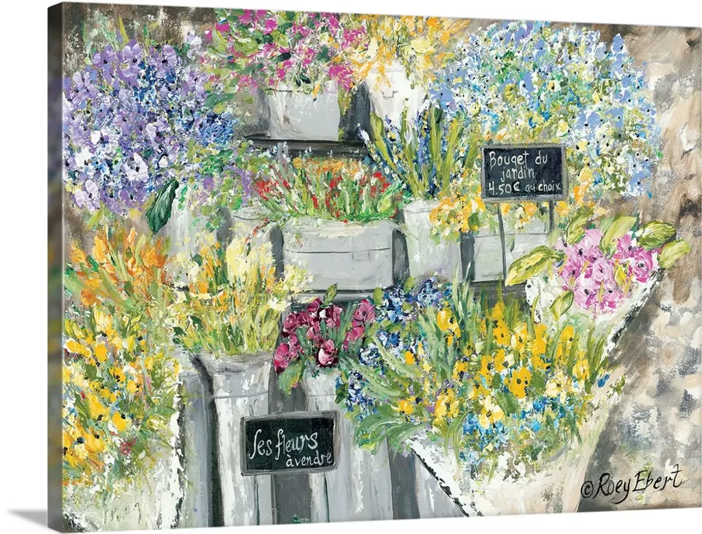 This contemporary painting depicts a French flower shop surrounded with buckets crowded with fresh blossoms.