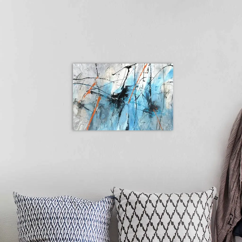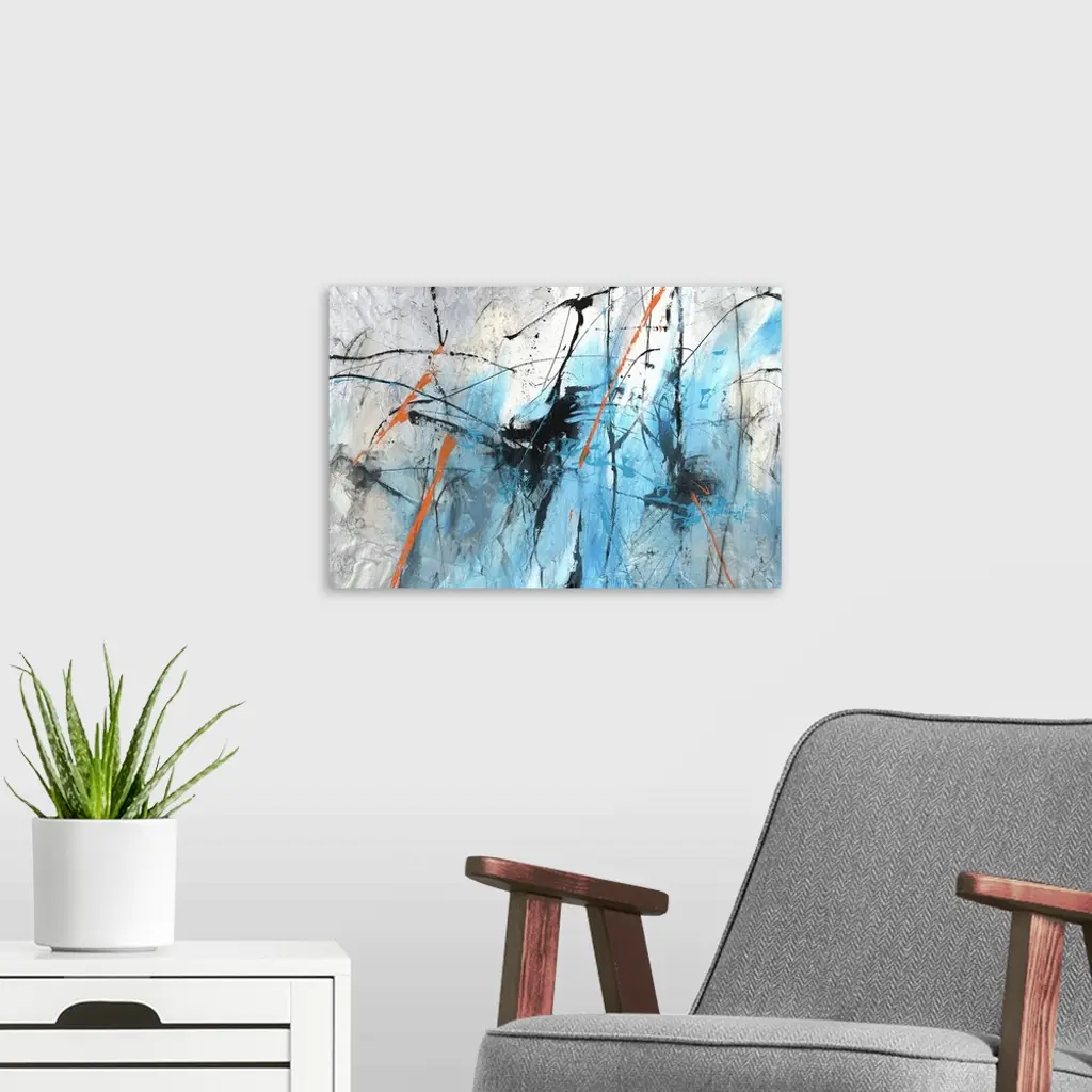 Large abstract painting with busy lines of color in bright blue and orange with black and white mixed in on a silver background.