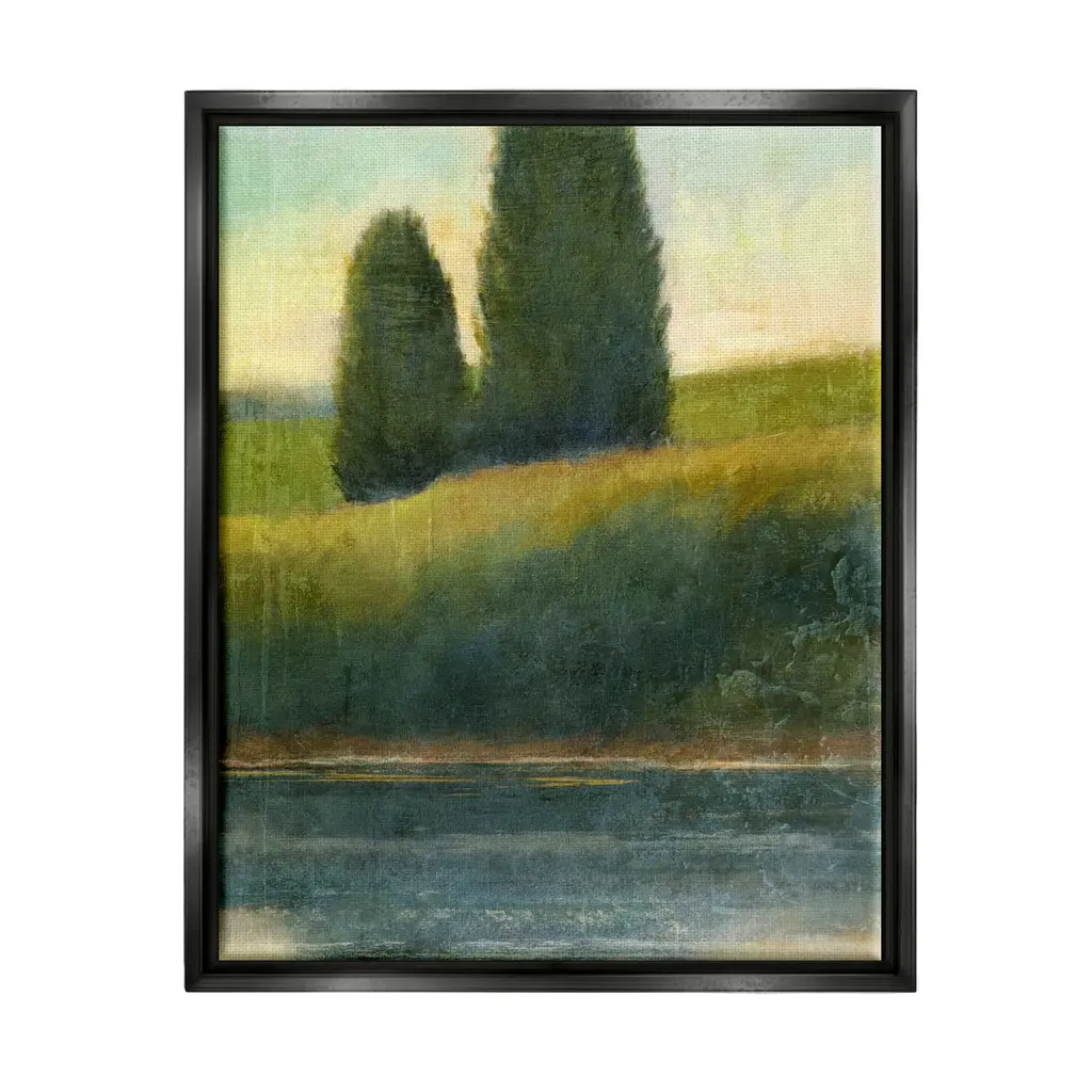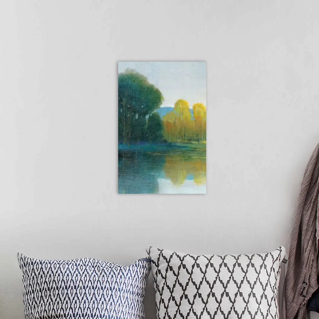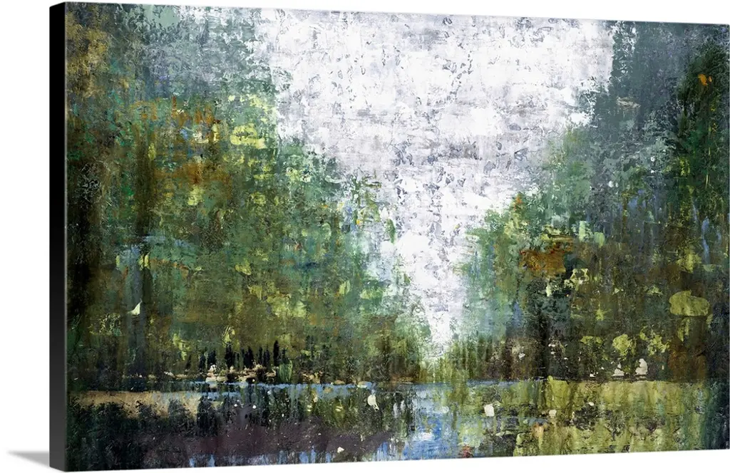 Landscape painting of a calm pond with tall trees along the edge, reflected in the water.