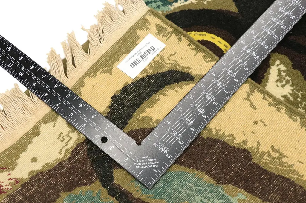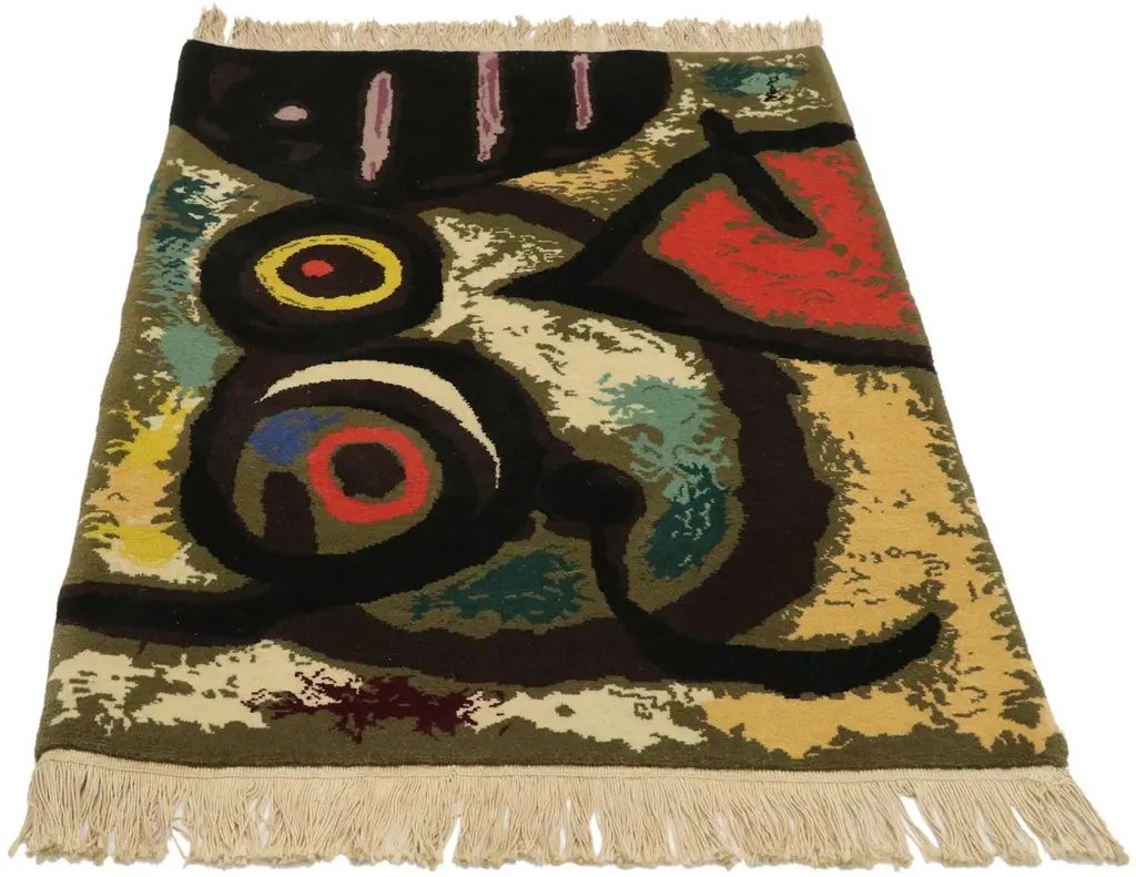 77099, a surrealist style tapestry after Joan Miro's 'Femme et Oiseaux' woman and birds, 1966. The painting was the last of a series the artist completed in Barcelona just after the Nazi occupation of France. Miro used his painted to escape from the perils of World War II painting in an abstract style; evoking tribal symbols equating with motherhood and women. This unique tapestry after Joan Miro is composed of bold, black curvilinear shapes resembling an owl, accented in poppy, saffron, lavender, cerulean and peach. The tapestry will add an artistic flair of Surrealism to any industrial loft or living space. The uplifting power of pattern and color in this Maximalism tapestry creates a standout spectacle with shades of brilliance. This delightful piece of art could be used as a wall hanging, colorful wall art, or tapestry. Well-suited for a wide range of interior styles: Surrealism, Abstract, Postmodern, Memphis Design Group, Cubism, Abstract Expressionist, Futurism, Art Deco, Traditional, Transitional, Eclectic, Modern, Mid-Century Modern, Contemporary, Loft, Art Moderne, and Retro Modern. Abrash. Hand knotted wool. Made in China. Tapestry. Wall Hanging. Measures: 01'11 x 02'09.