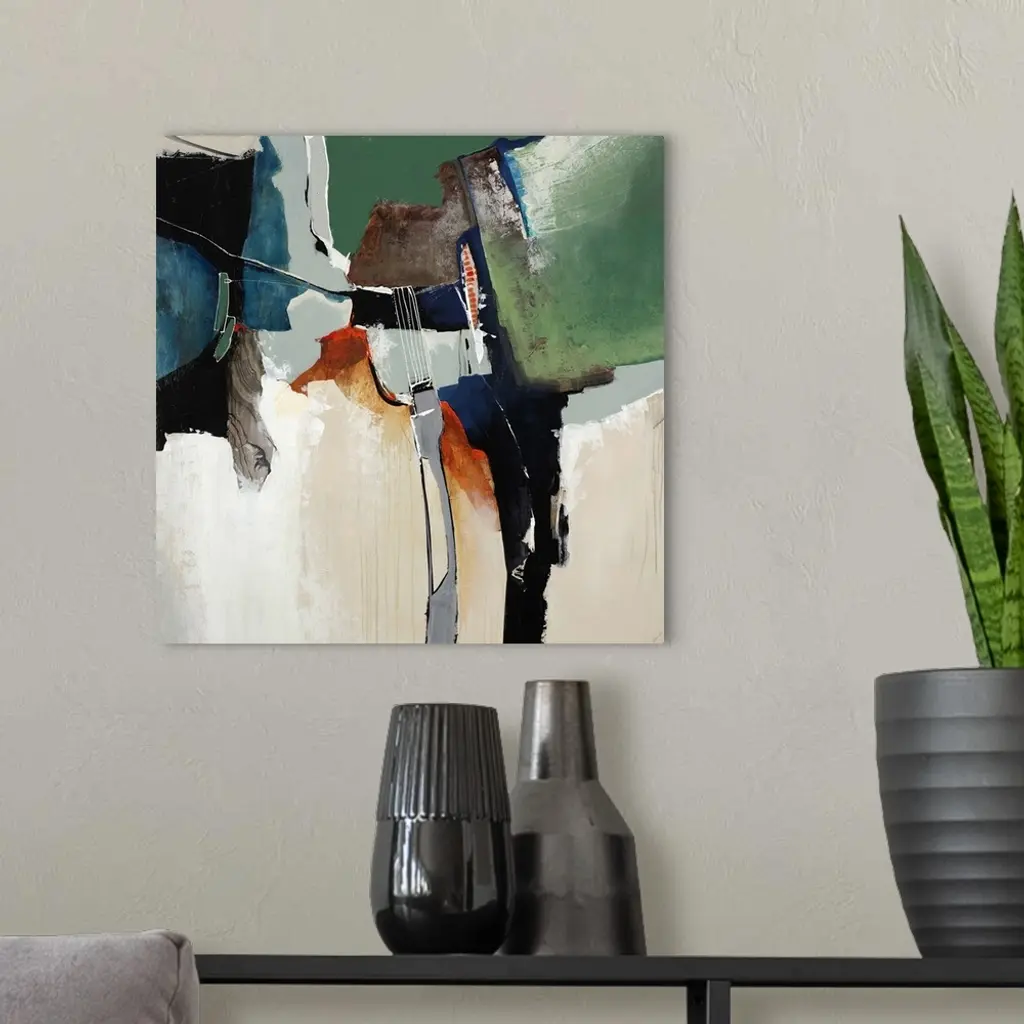 Abstract painting of various shapes and colors that merge and overlap resembling a collage, one of the shapes in the foreground resembles a fork.