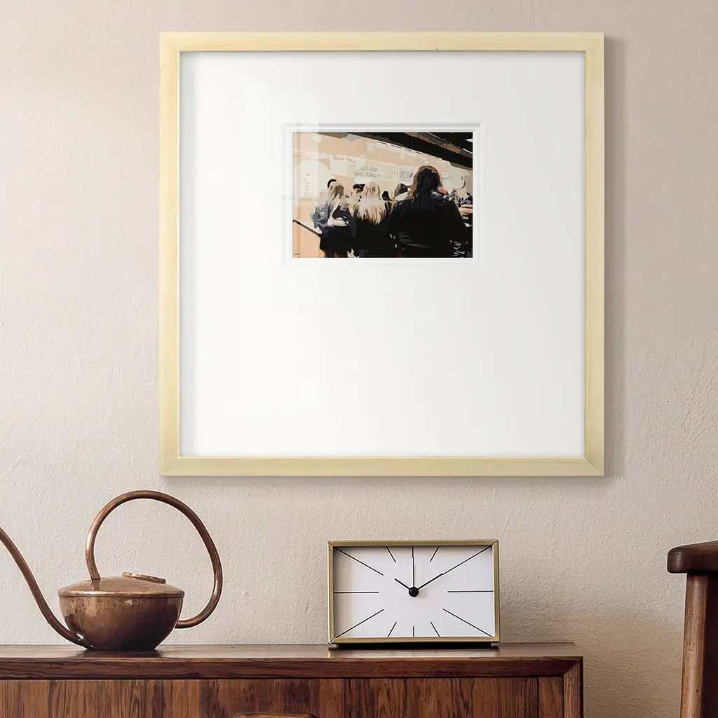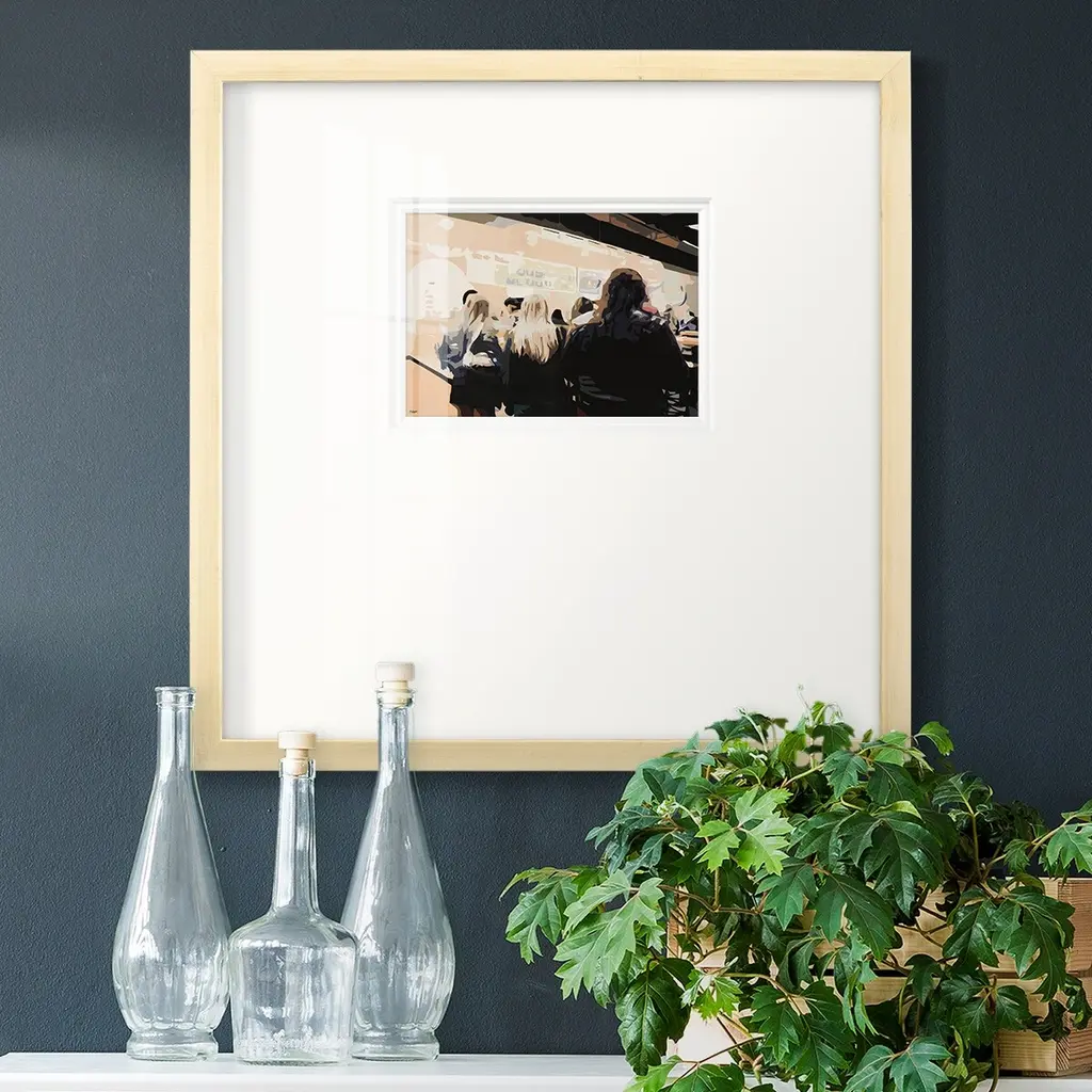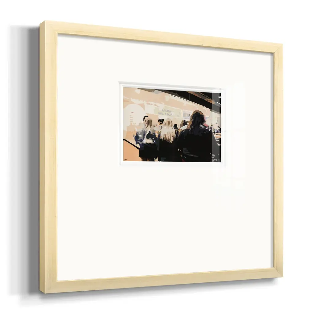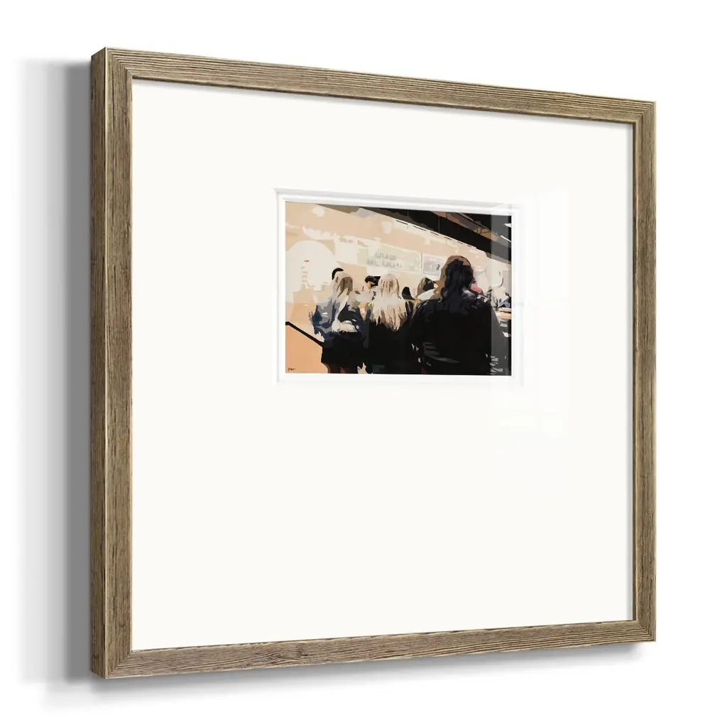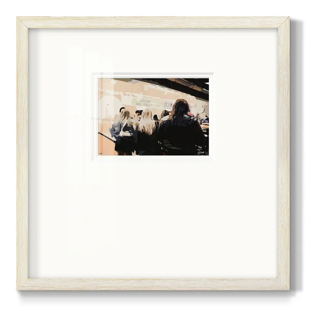 Late Night QueuePremium Framed Print A framed cold pressed paper print featuring superior double matting and quality frame. 2 SIZES AVAILABLE 16''X16''' - Overall Size 20''X20''' - Overall Size Each piece is made to order. Each piece comes with hanging hardware. Made in the USA Ready to Hang Giclee Paper Print Plexiglass Beveled Matt Board Double Matte Board