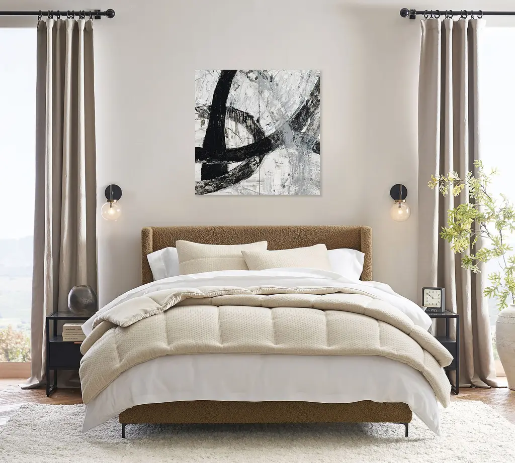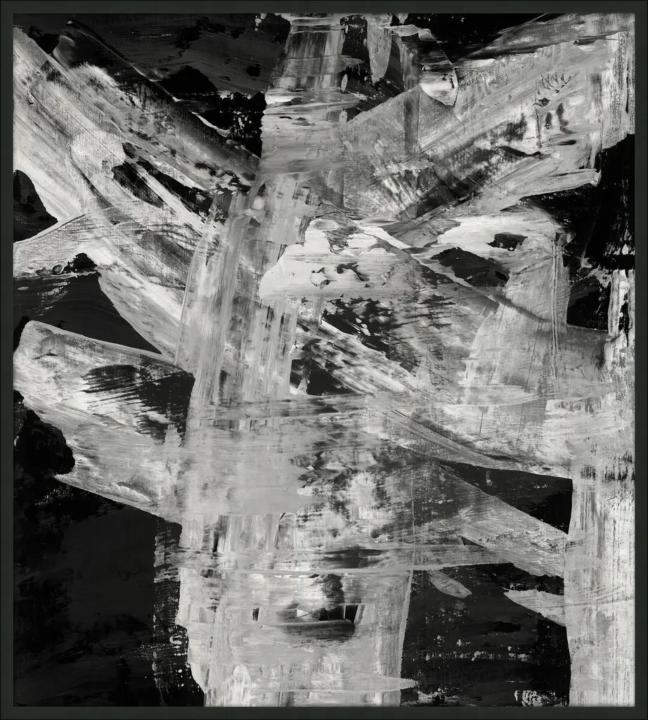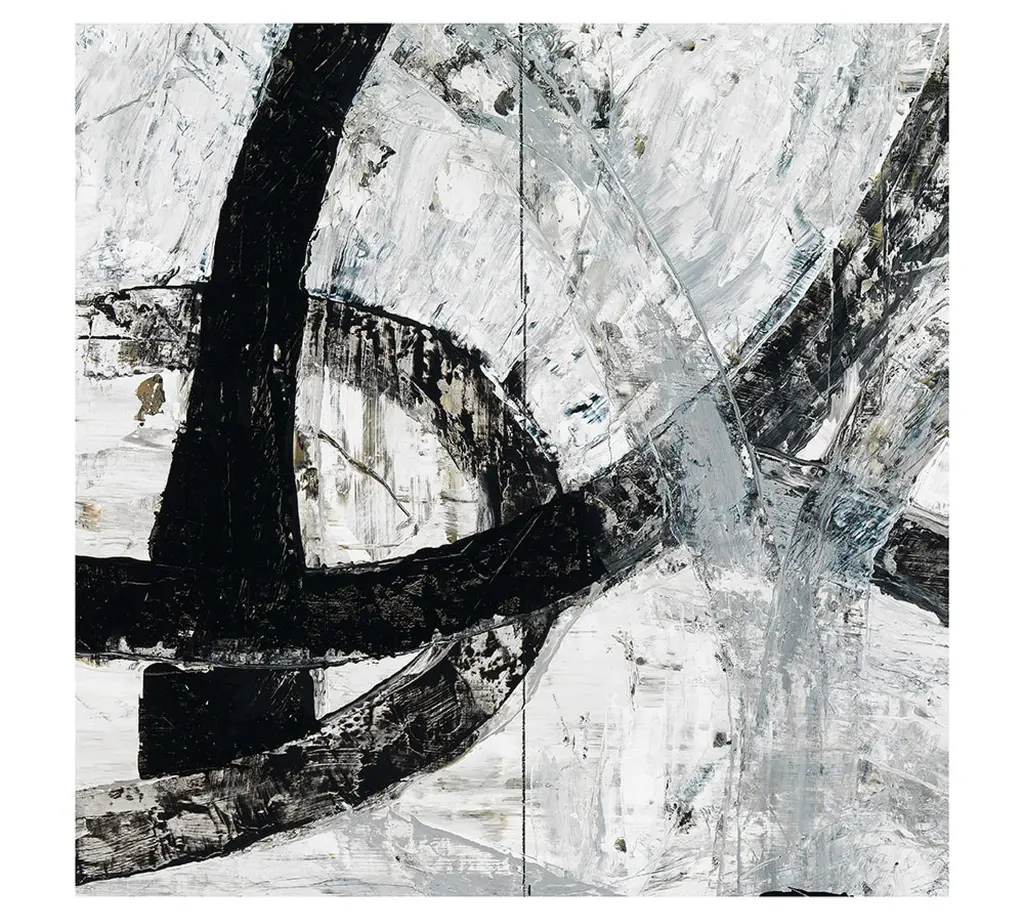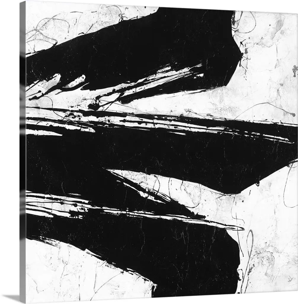 This oversized black-and-white artwork has an expressive, contemporary presence. The giclée reproduction on canvas is embellished by hand with a semigloss paint that adds an overall “impasto” texture along the lines and brushstrokes of the original painting.