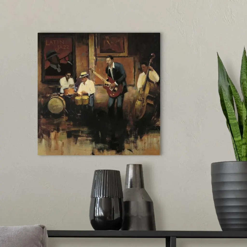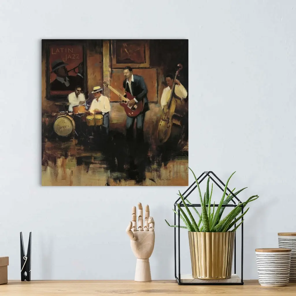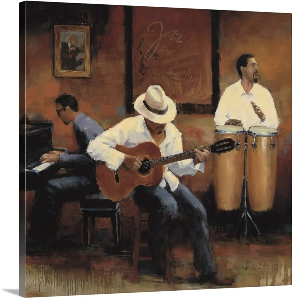 Contemporary painting of a group of jazz musicians playing the bongos, guitar, bass, and drums.