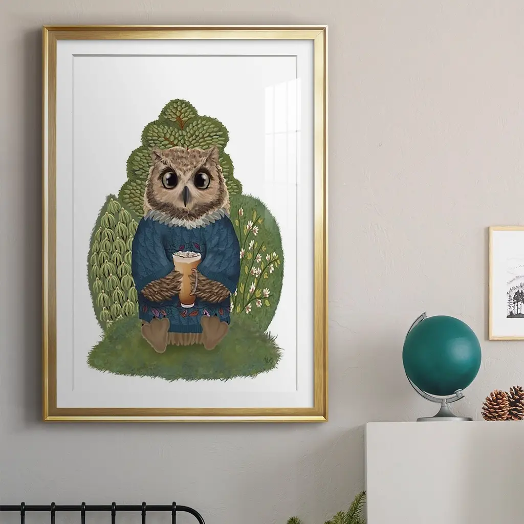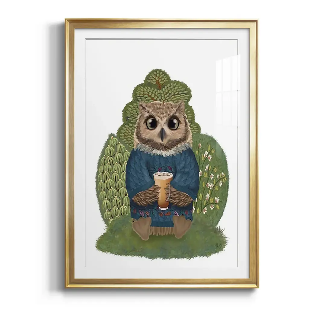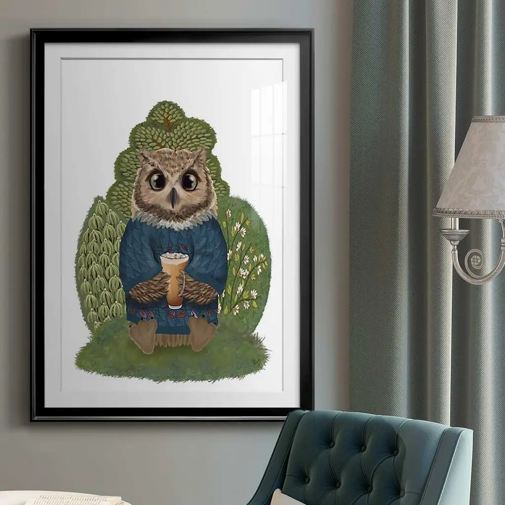 Latte Owl in Sweater Premium Framed Print - Ready to Hang A Premium Framed Print created to last. Framed in distressed wood and available in an array of sizes and colors Featuring a beveled a solid wood stretcher bar, each piece comes ready to hand 4 SIZES AVAILABLE 30.5''X42.5'' - Overall Size 26.5'X36.5'' - Overall Size 22.5''x30.5'' - Overall Size 18.5''x24.5'' - Overall Size Each piece is made to order. Each piece comes with hanging hardware. Made in the USA Ready to Hang Giclee Paper Print Acrylic Glass Beveled Matt Board